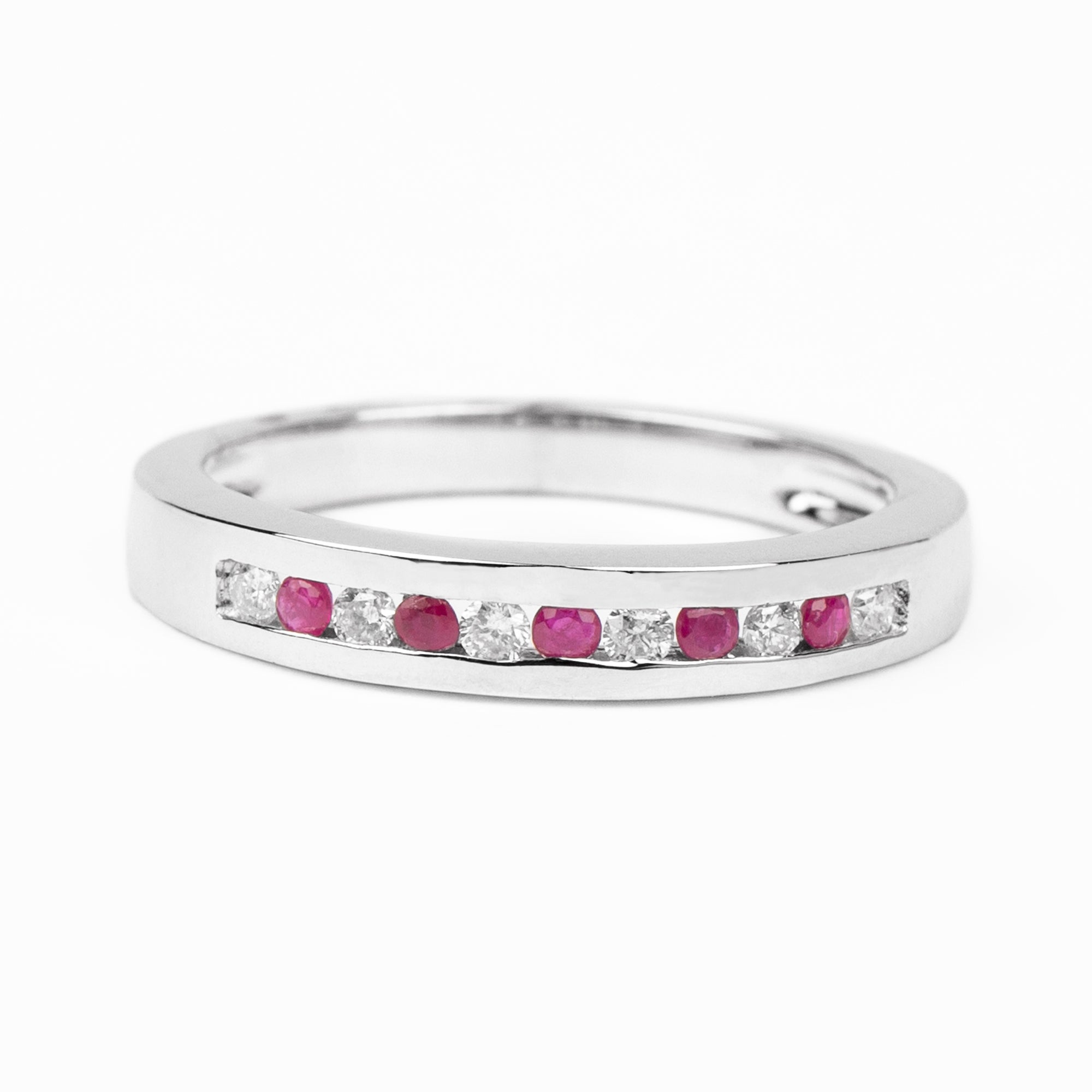 Your search for a perfect anniversary present will stop when you will take a look at this breathtaking Ruby Band Ring adorned with Round Shape Ruby and Diamond set in an alternate pattern in a channel setting.