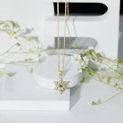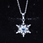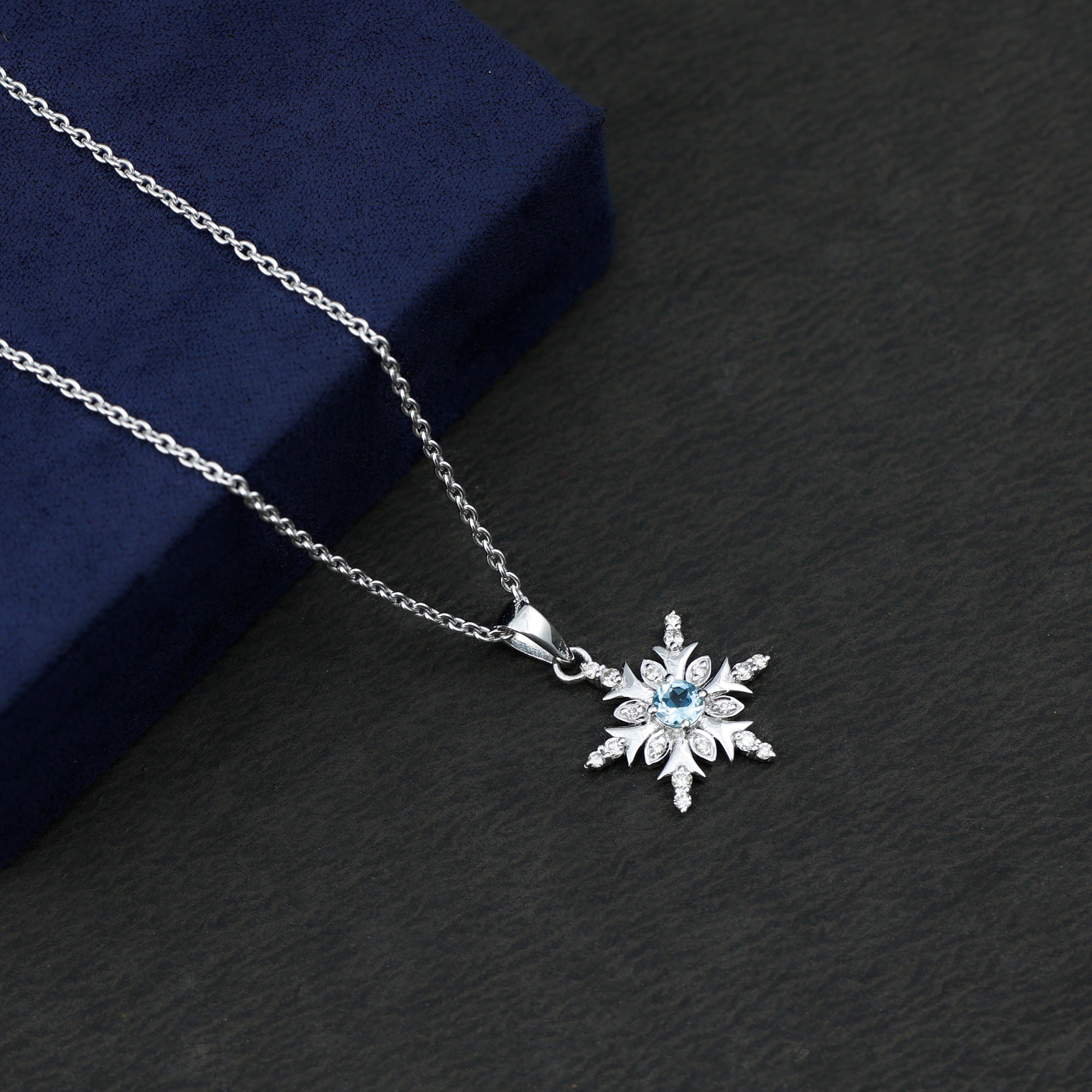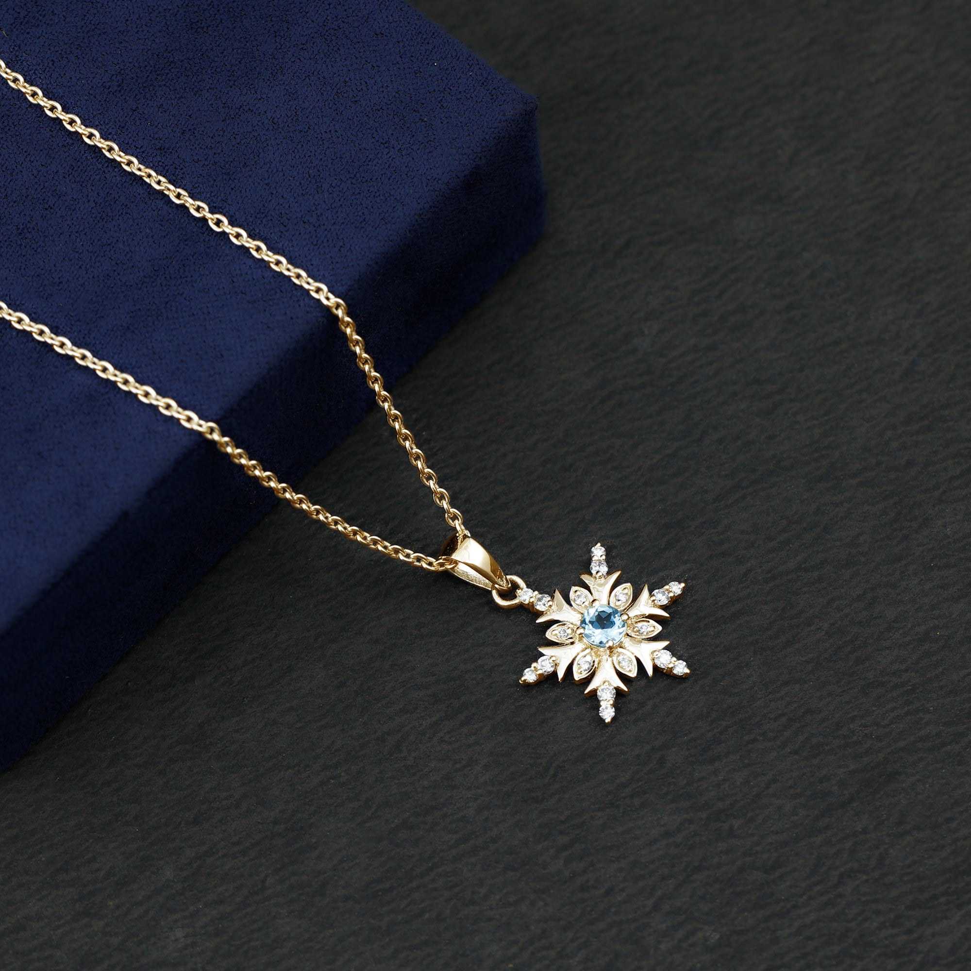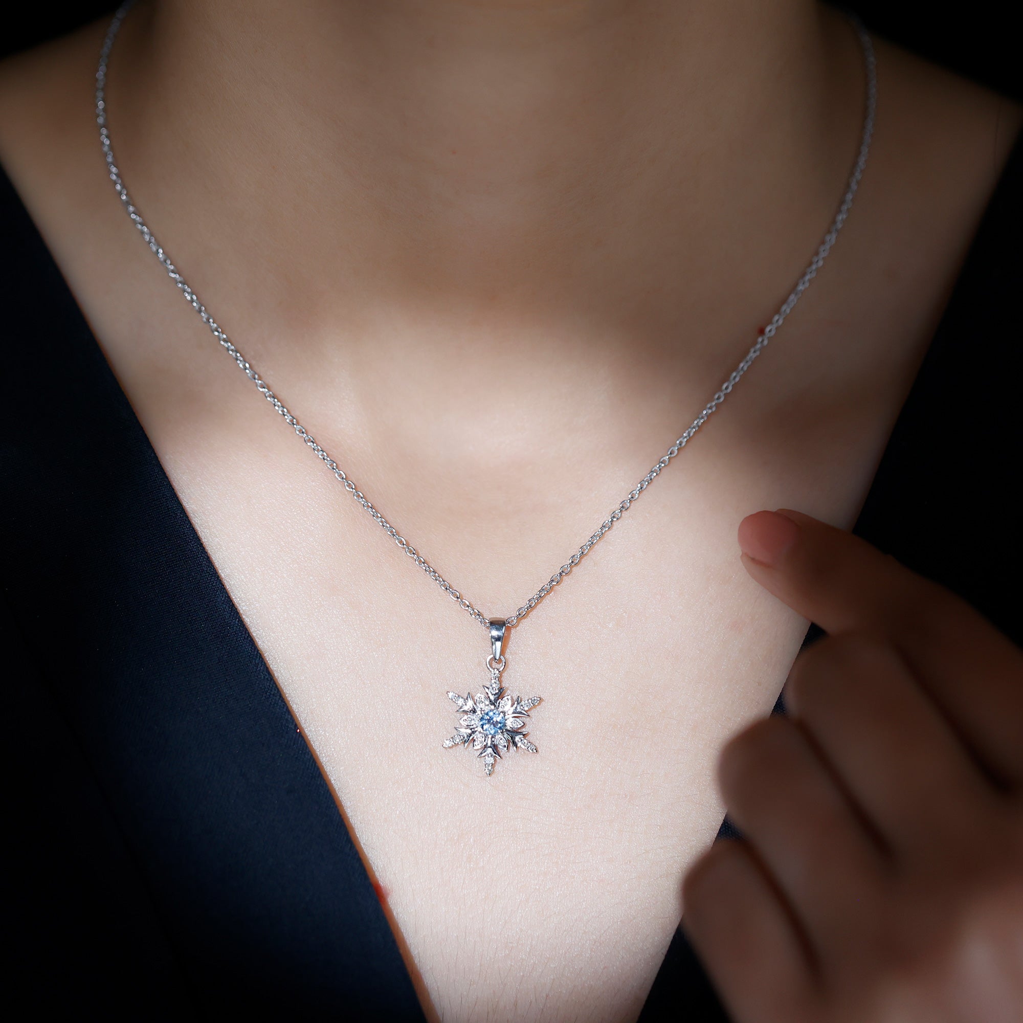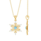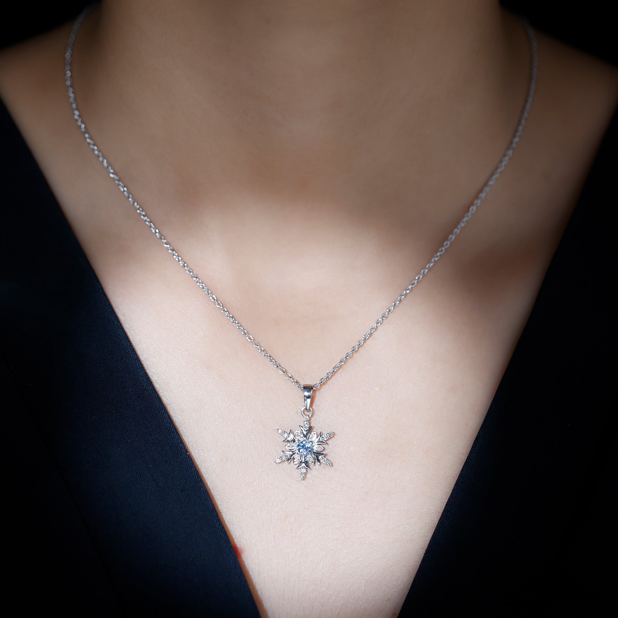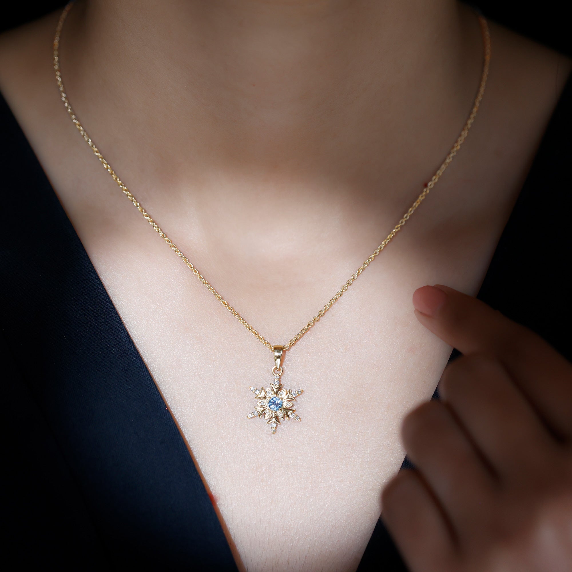 Get ready for winter with this stunning snowflake pendant, expertly designed with a touch of glamour. The intricate snowflake design is beautifully crafted with a center aquamarine gemstone and accentuated by sparkling Diamond gemstones. Perfect for those who appreciate unique and trendy jewelry pieces, this pendant will make a statement and add a touch of elegance to any outfit.