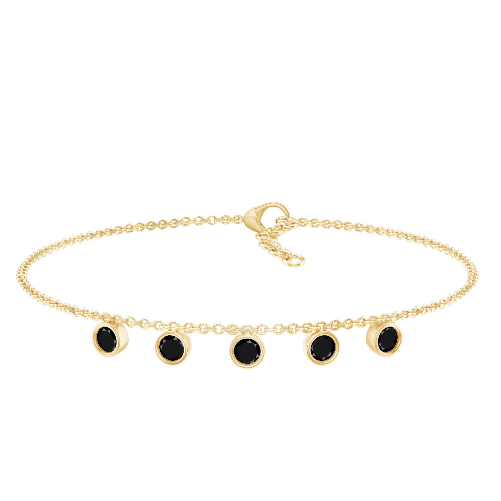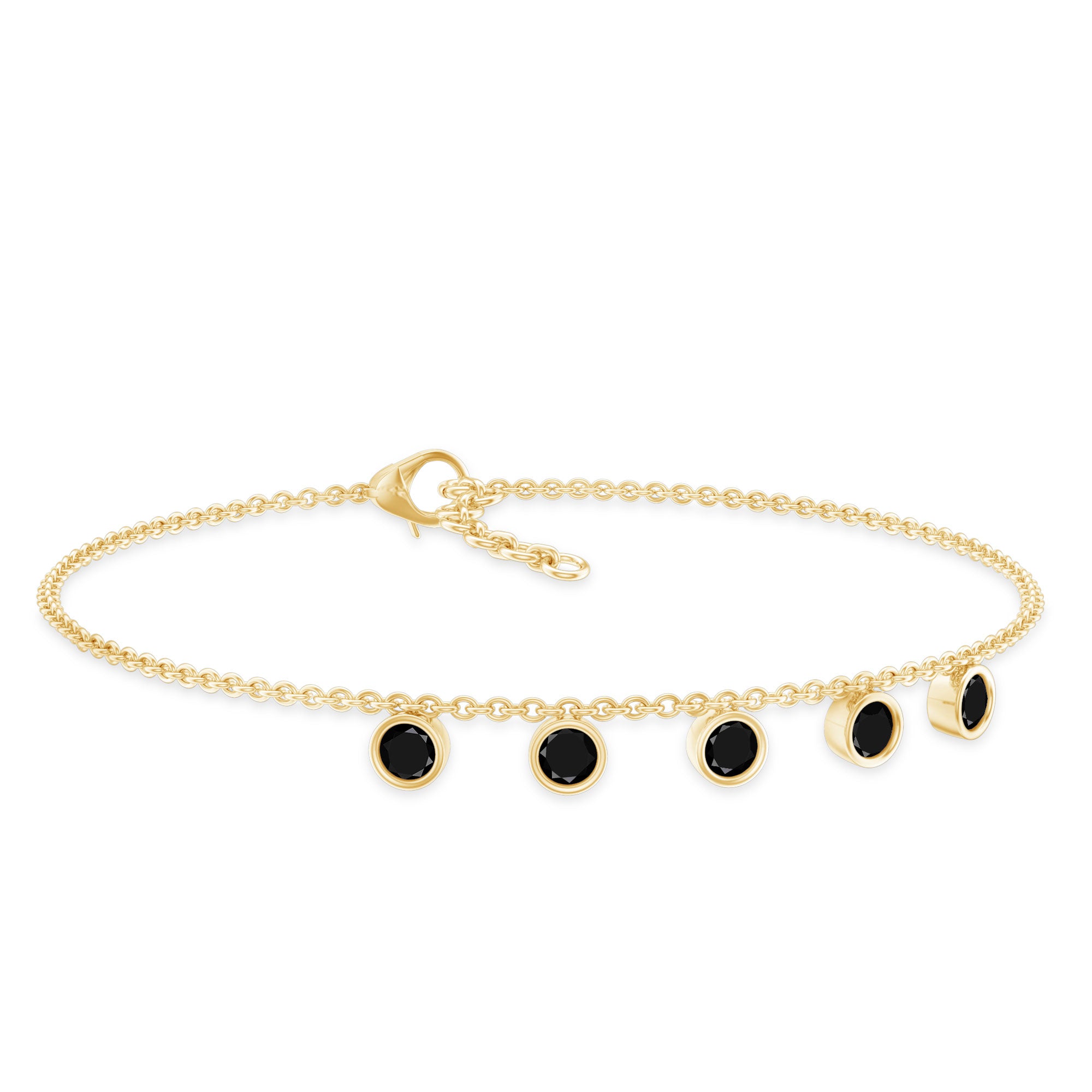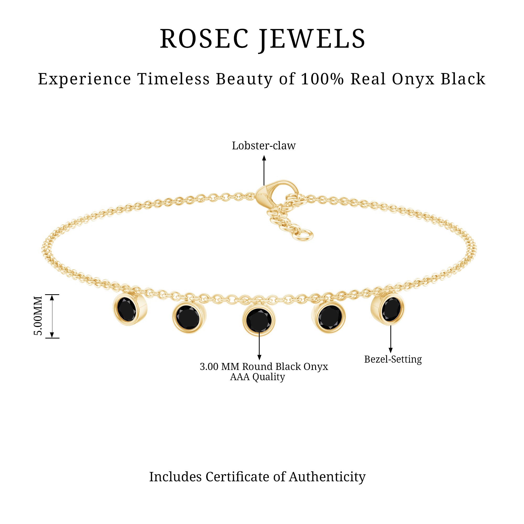 Elevate the elegance of your wrist with this minimalist Black Onyx Bracelet. This exquisite accessory features 3 mm round Black Onyx gemstones meticulously arranged along a delicate chain in a bezel setting, creating a subtle yet captivating sparkle. The Lobster Claw Closure ensures a secure fit, making this Chain Bracelet an ideal for everyday wear or special occasions. Rosec Jewels is dedicated to timeless beauty and ethical sourcing, making this Stackable Bracelet a perfect blend of luxury and responsibility. Designed with versatility in mind, this Minimal Chain Bracelet can be worn alone or layered with other pieces for a trendy, stacked look. Its classic design makes it a wonderful gift for her on any occasion—whether it be a birthday, anniversary, or simply a sincere gesture to convey your affection. Its brilliant sparkle is an attractive option for those seeking a refined enhancement that adds a touch of luxury without overpowering your appearance.