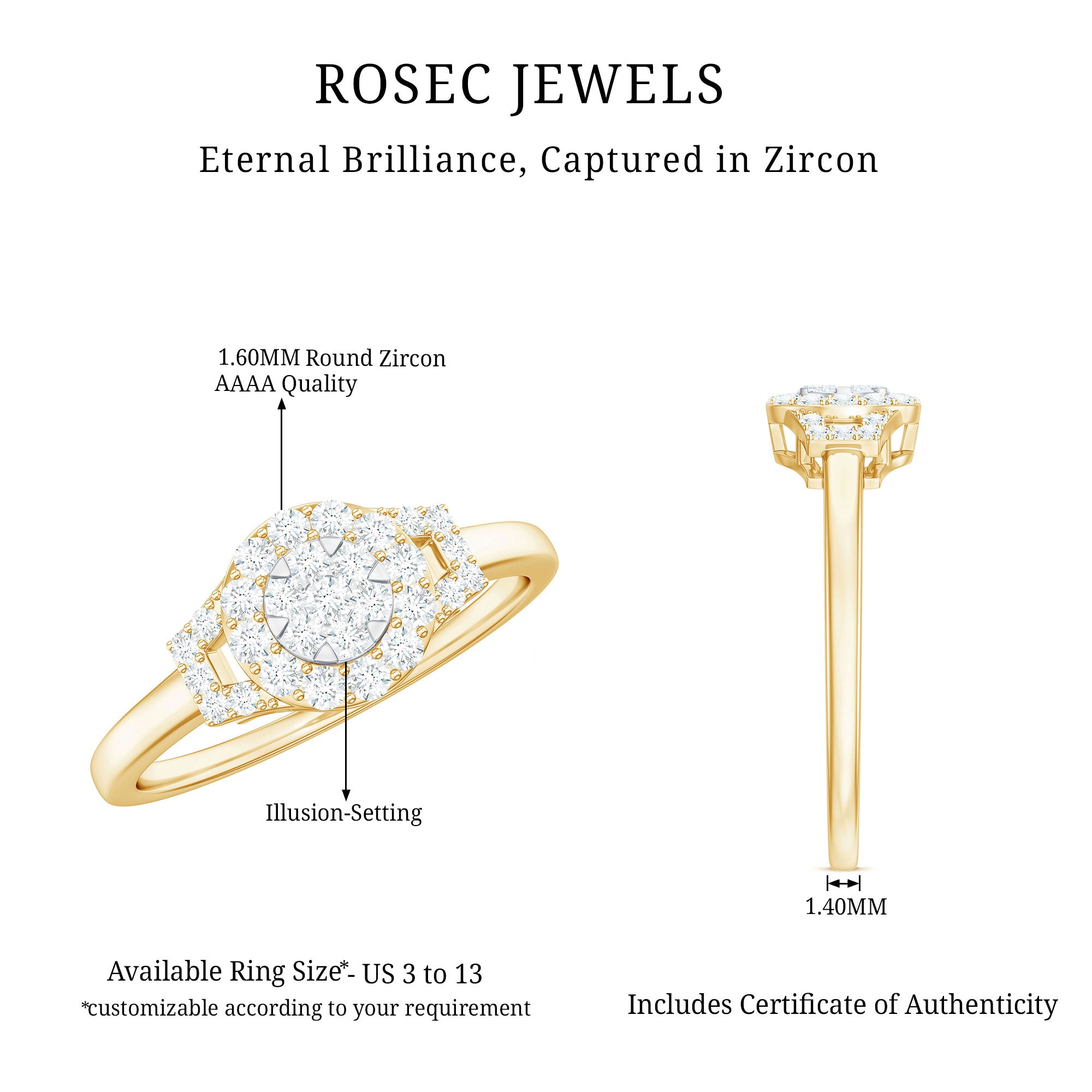 A great Zircon Ring for your lady with a classic and trendy sense of style. This Zircon Engagement Ring shows stunning Round Shape cubic zirconia gemstone set in illusion setting with a fiery and unique sparkle. The Shank and Prongs protect the Simulated Diamond for artfully secure the Gemstones.