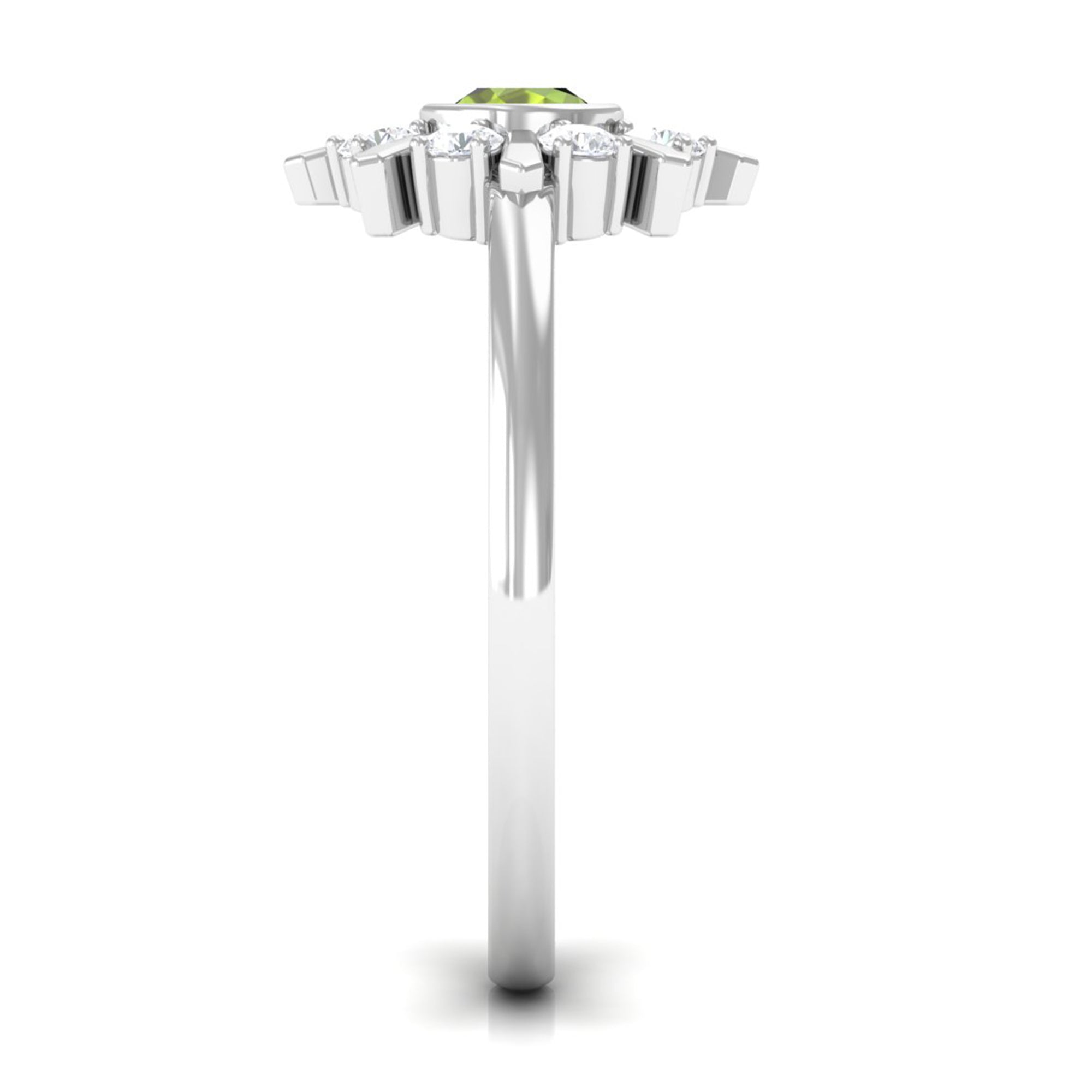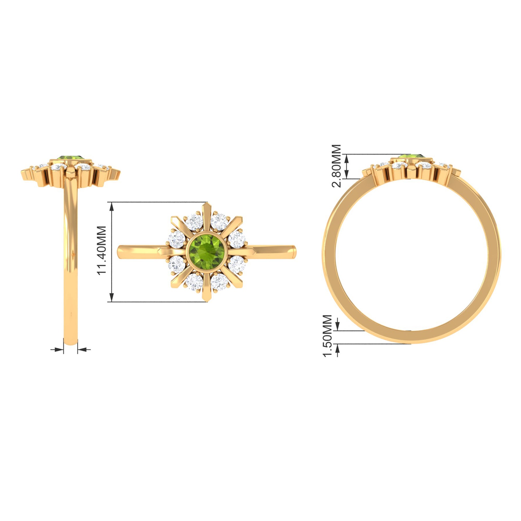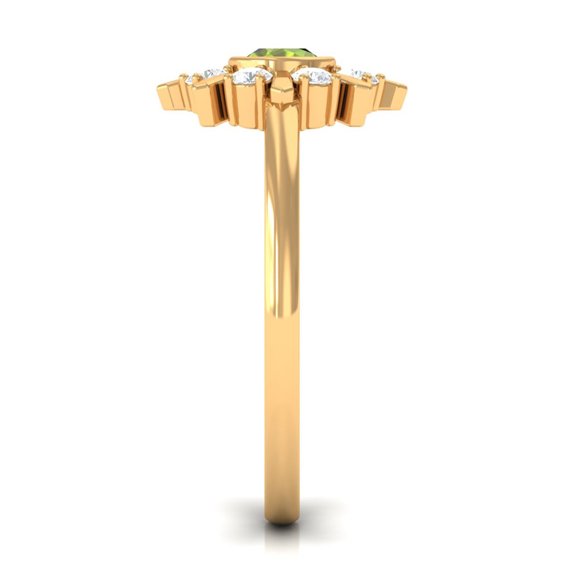 Strike out a wonderful statement by wearing this elegant Statement Ring embellished with Round Shape Peridot in Bezel Setting and encircled with Diamond Stones. This Peridot and Diamond Ring is crafted with Gold to create an enchanting piece. This Peridot Green Ring will bring you into the limelight.