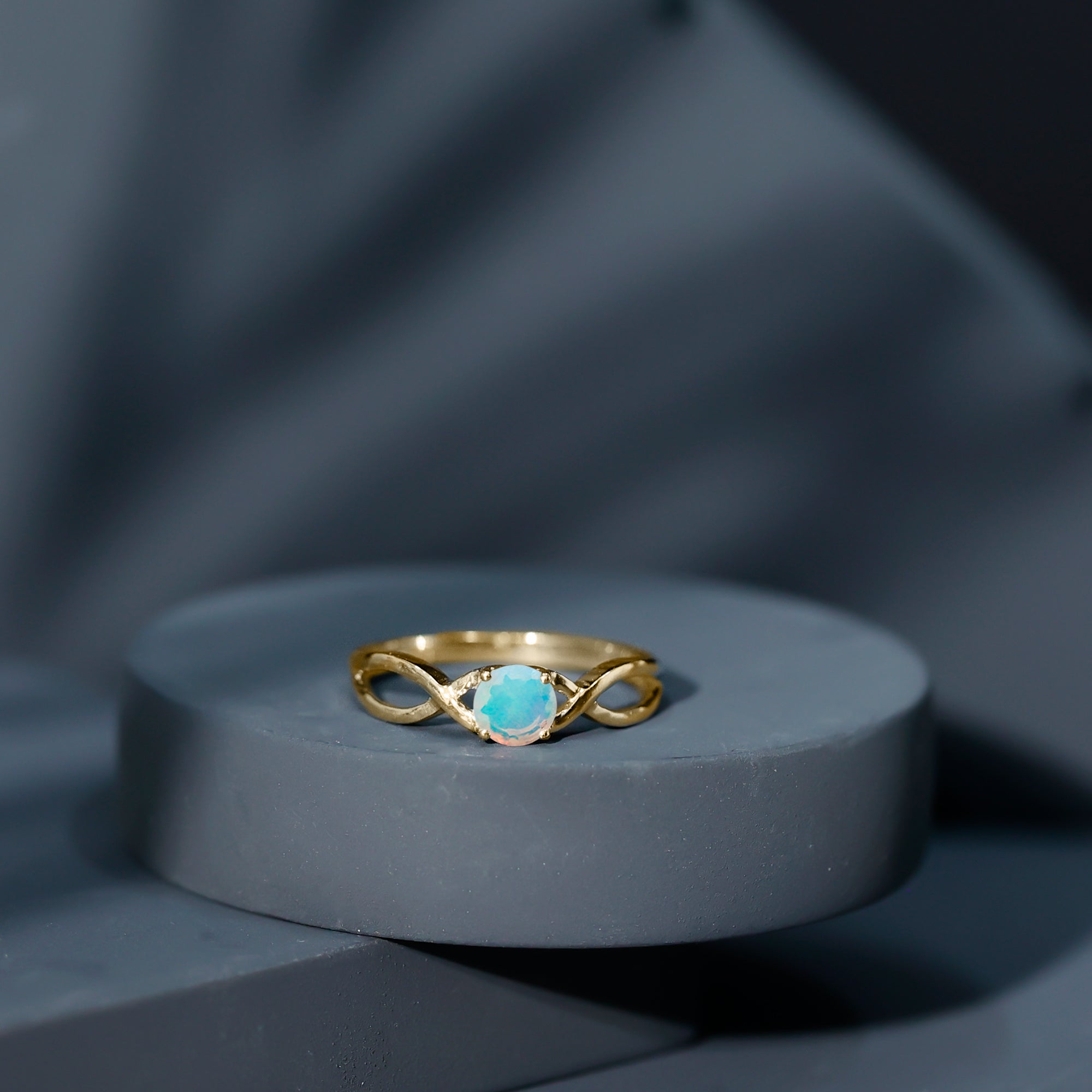 Embrace the beauty of promise and passion with this Opal Promise Ring, where color, elegance and meaning converge. This Fine Ring features a stunning 6 mm Round Shape Ethiopian Opal at the center in Prong Setting, glowing with an ever-changing play of colors, creating a mesmerizing effect that captures attention from every angle. The Opal is set on a Crossover shank that symbolizes two souls intertwining into one, an everlasting bond that only grows stronger with time. This simple yet captivating Proposal Ring is perfect for marking a promise, a commitment or a meaningful milestone. The contemporary appeal of this Crossover Ring is balanced by the rare beauty of opal, making it a symbol of both modern romance and timeless devotion. Carefully crafted and presented in an elegant jewelry box, this Opal Solitaire Ring is available in various sizes for the perfect fit. Whether you are making a promise or simply celebrating love, this Rainbow Opal Ring is a radiant reminder of your eternal connection, destined to be cherished forever.