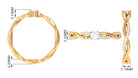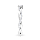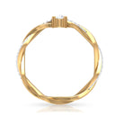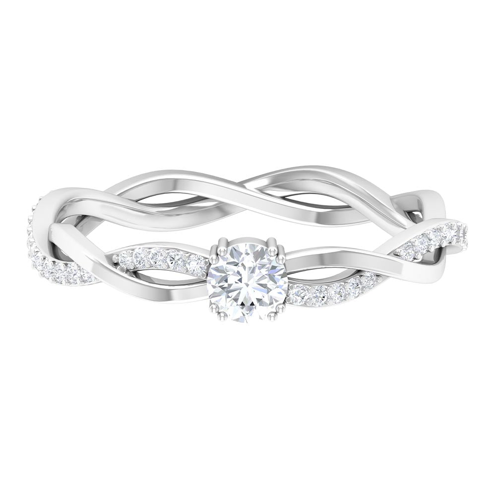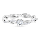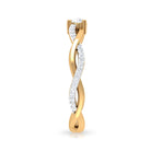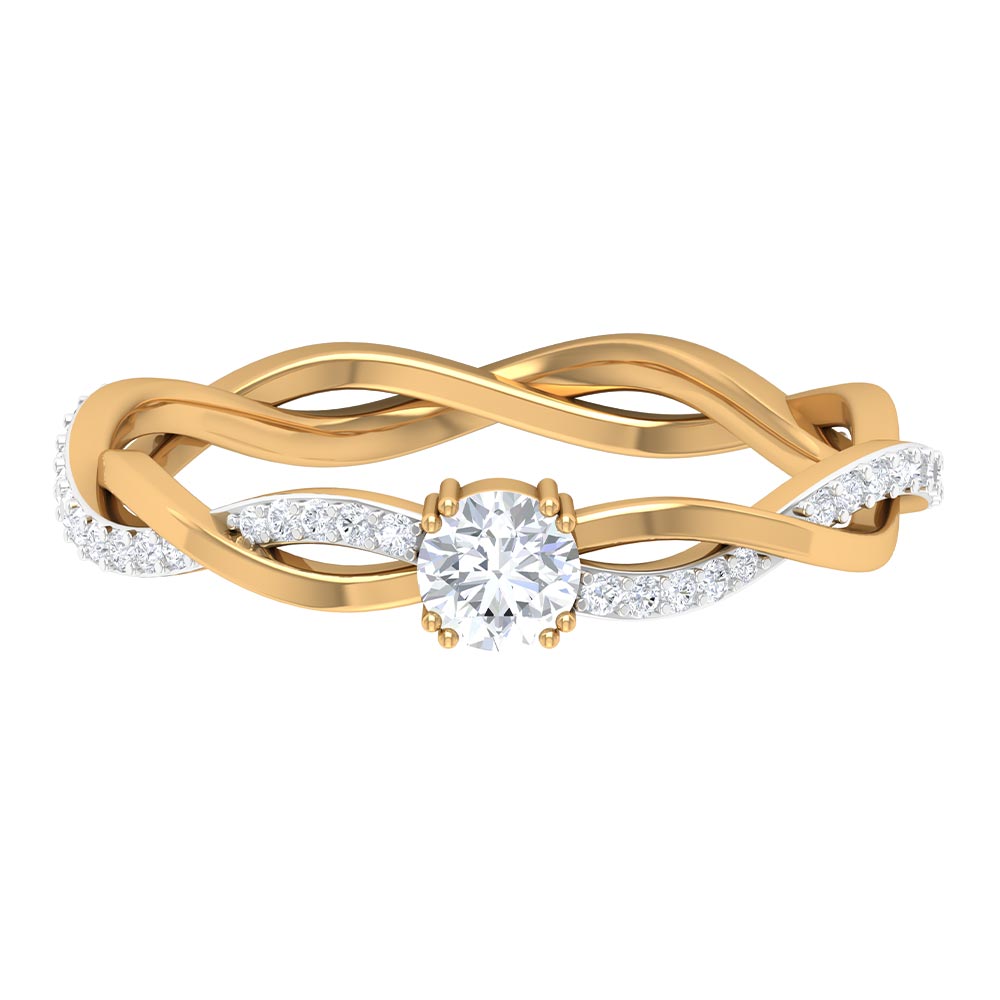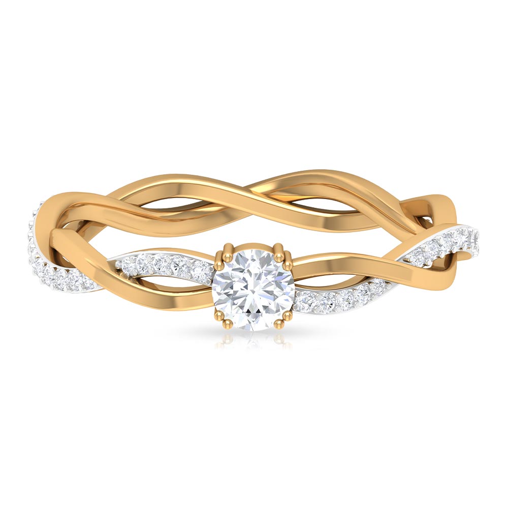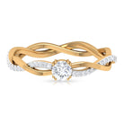 Gracefully presenting a marvelous Round Cut Cubic Zirconia embedded in the center, this Solitaire Engagement Ring features a braid like pattern being created at the shank where one strand is in plain gold metal, and the other is studded with tiny glimmering simulated diamond gemstones.
