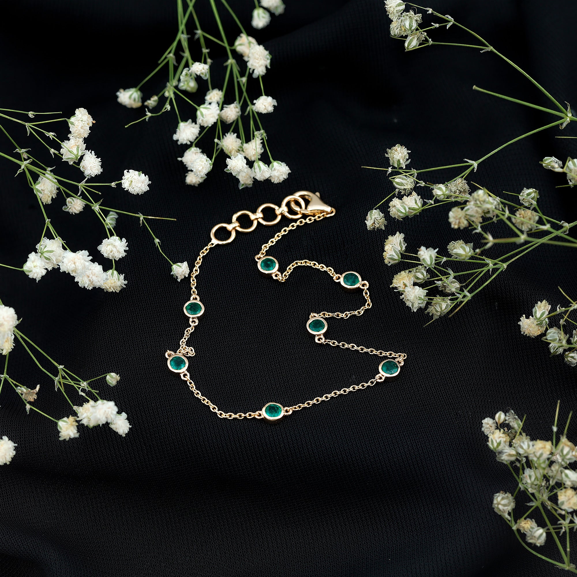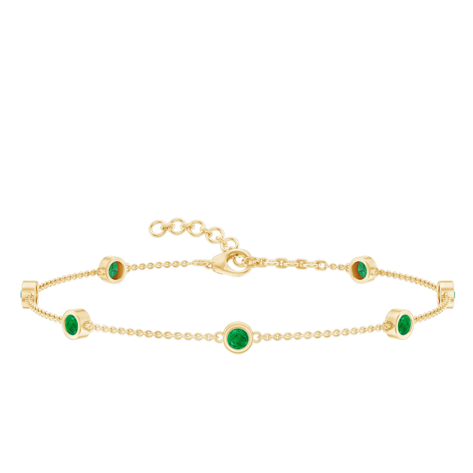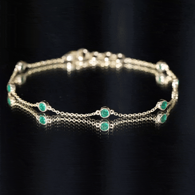 Express your love to your girl and make her happy by gifting her this glossy Emerald Bracelet this Valentine. This Bracelet is perfectly composed of Solid Gold and decorated with Round Cut Emerald in a Bezel Setting over Station Chain.