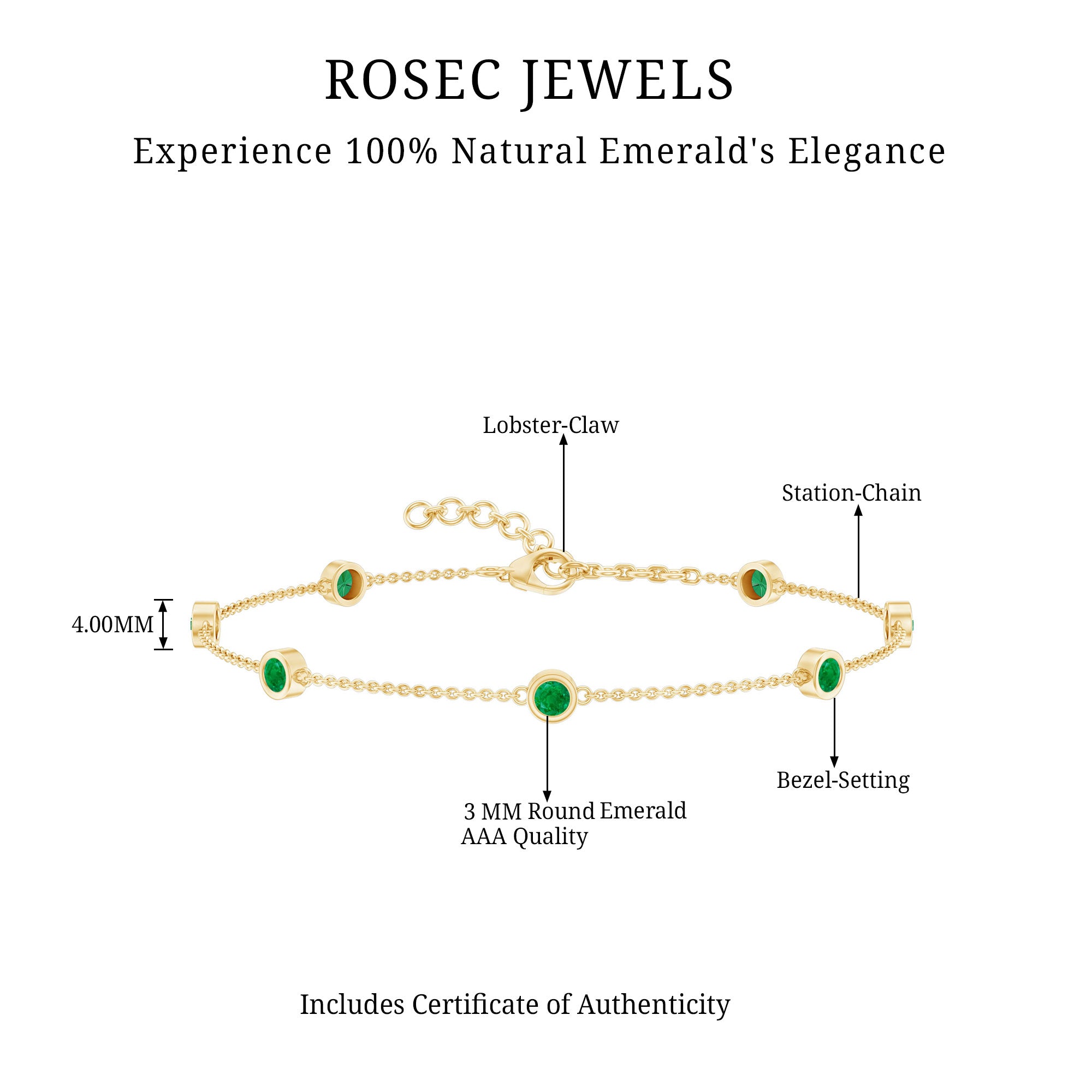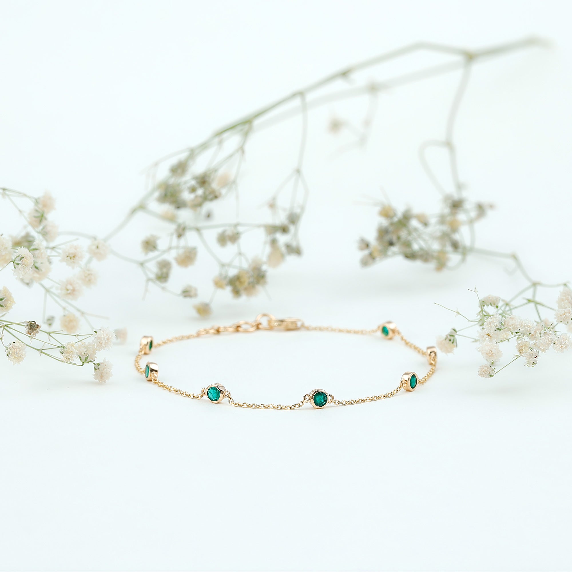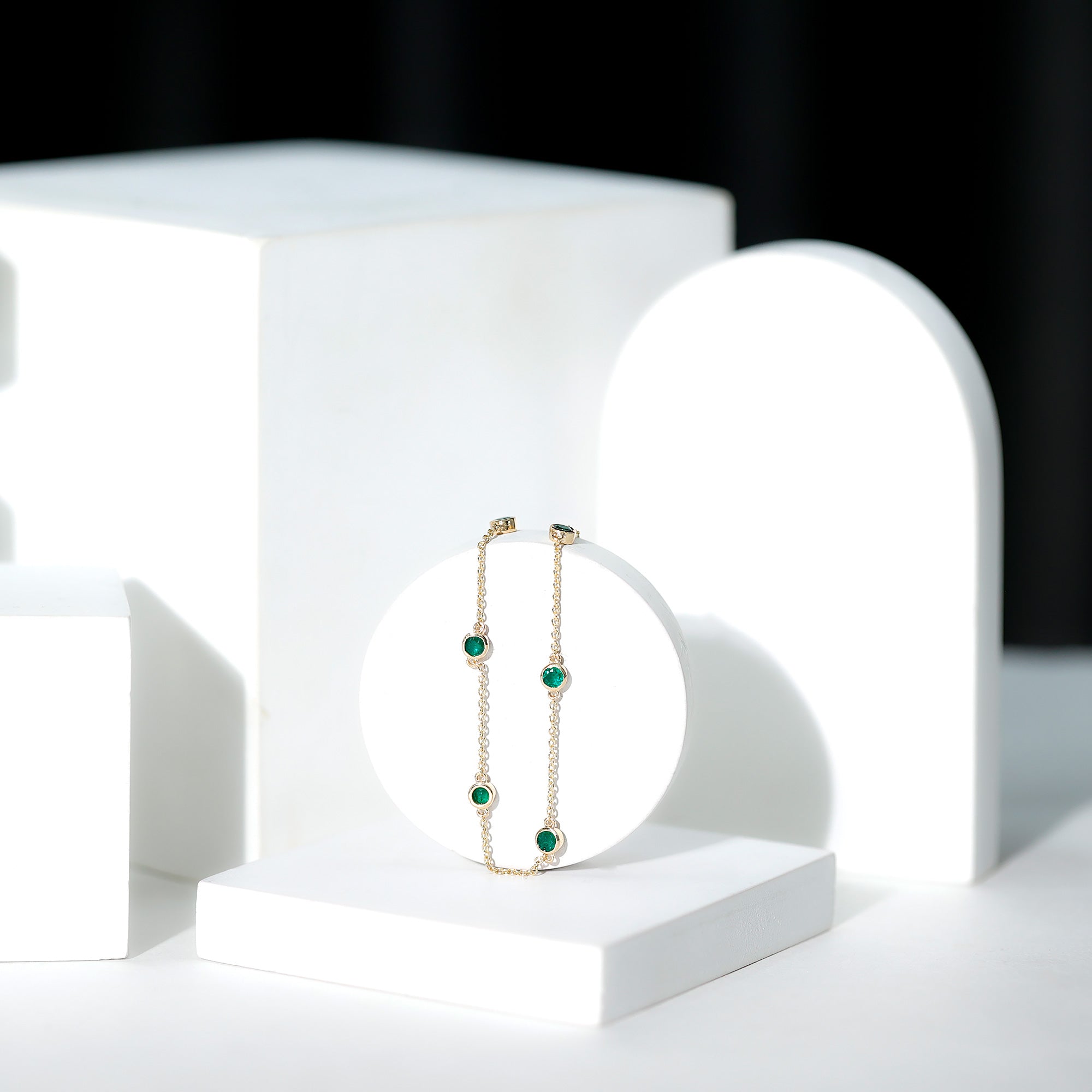 Express your love to your girl and make her happy by gifting her this glossy Emerald Bracelet this Valentine. This Bracelet is perfectly composed of Solid Gold and decorated with Round Cut Emerald in a Bezel Setting over Station Chain.