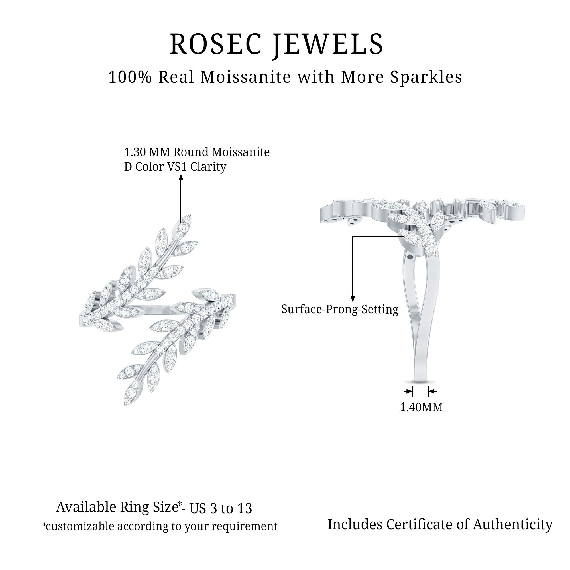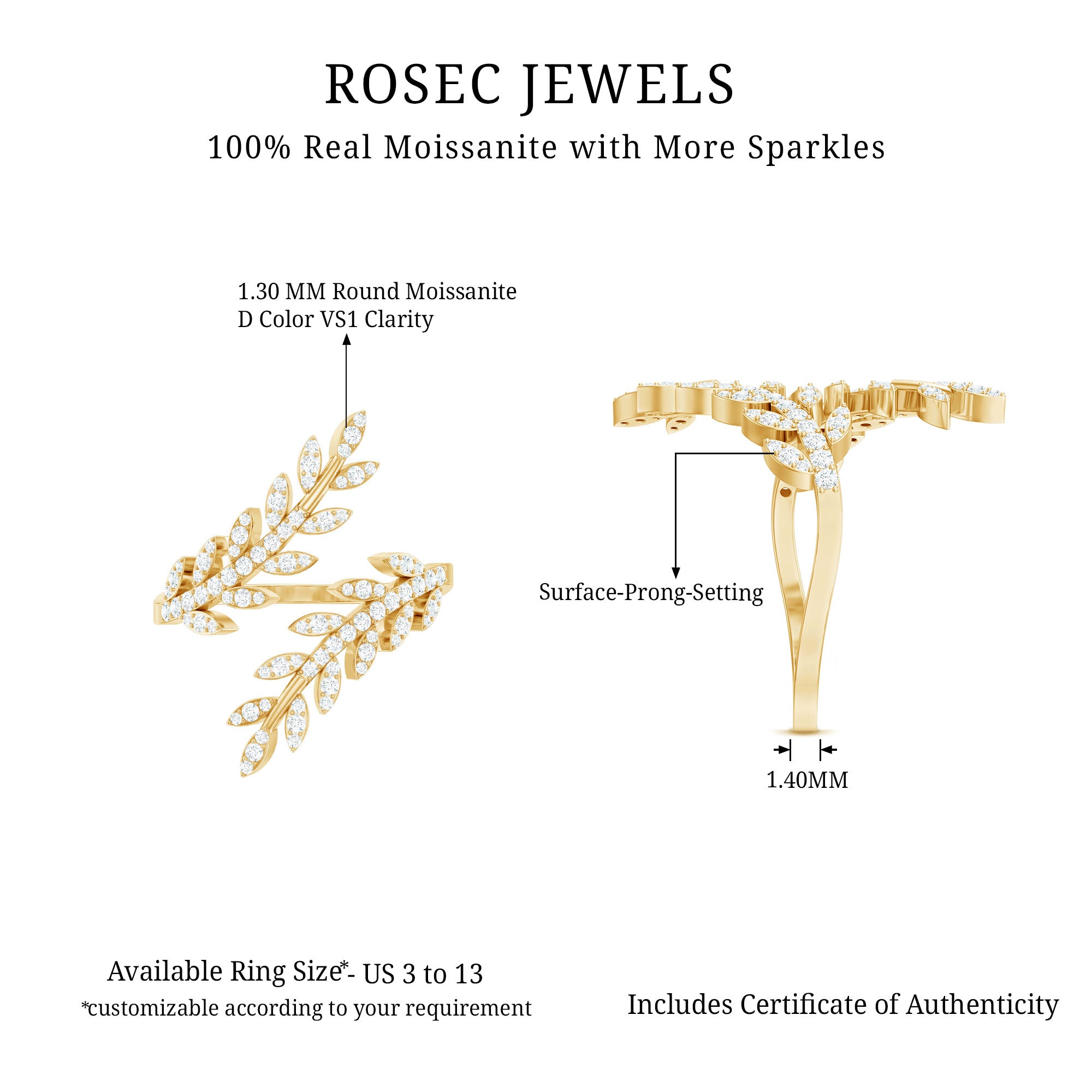 A graceful and modern accessory adjustable Leaf Wrap Ring is the open ring designed in leaf shape adorned with precious Round Shape Moissanite in the prong setting. This Dainty Promise Ring is available in Solid Gold to wear on special occasions.