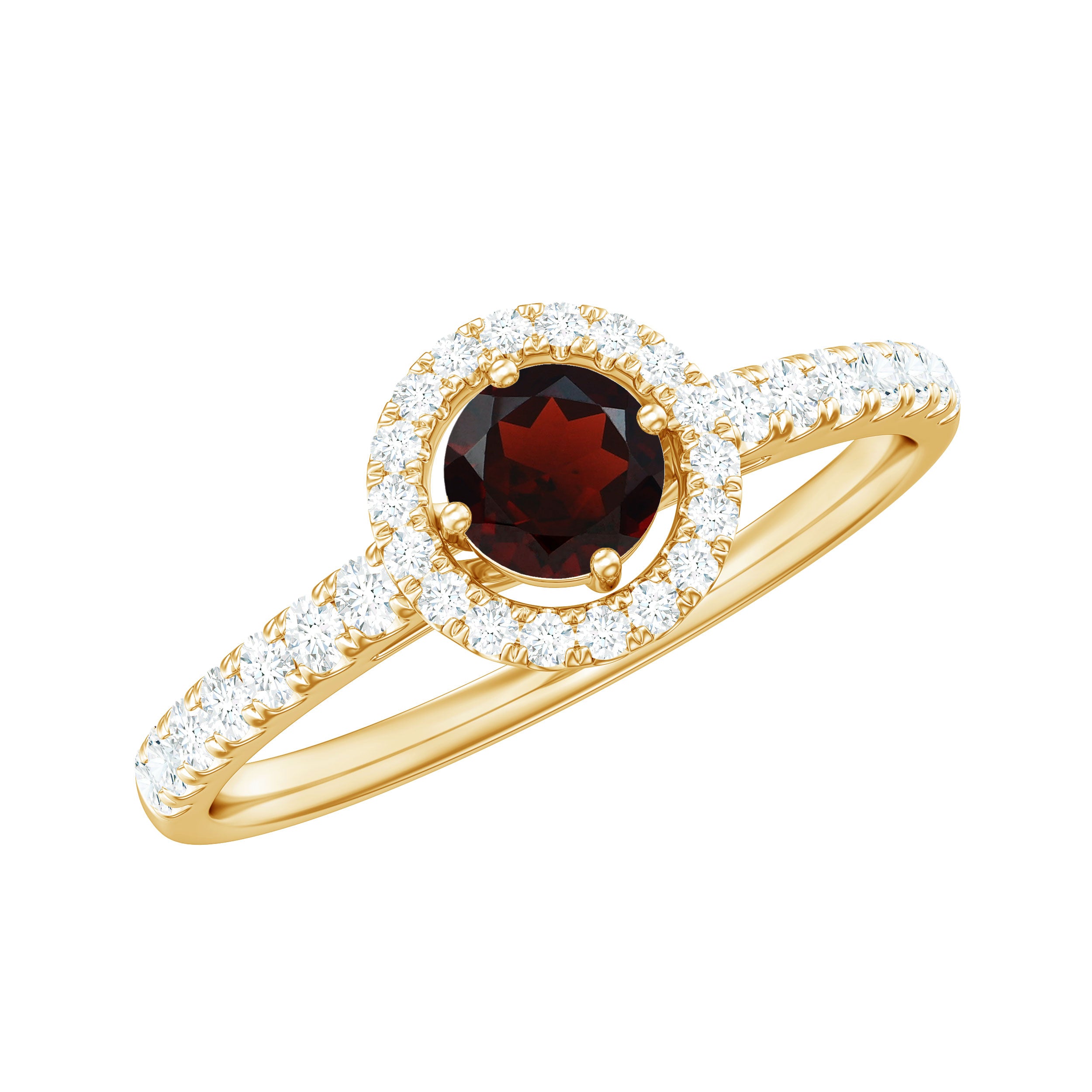 Classic Engagement Ring is the captivating piece encased with Round Shape Garnet set as Solitaire and Diamond are Studded as in halo and Side Stones. This Lovely Engagement Ring is crafted in Solid Gold.
