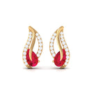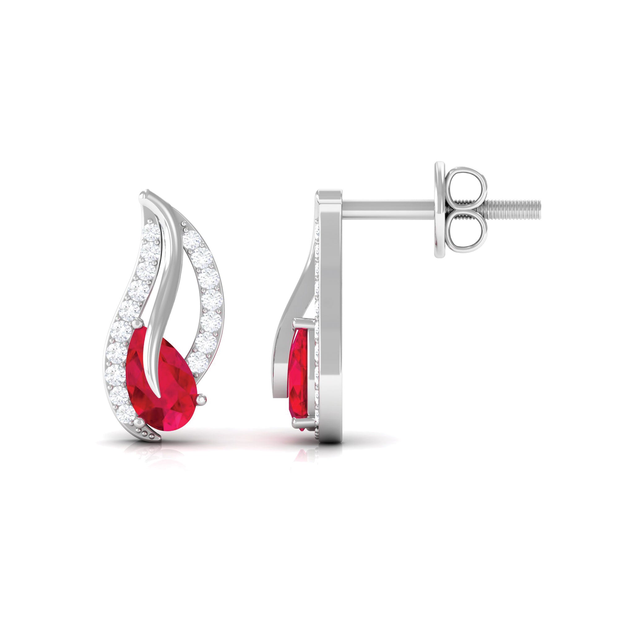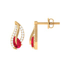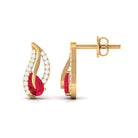 There is something truly captivating about the way these Lab Created Ruby Earrings sparkle with elegance and grace. They feature a 4X6 MM pear shaped lab created ruby, held securely in prong setting. Just above the ruby, small round diamonds are delicately arranged in a graceful leaf pattern, adding a soft shimmer that perfectly complements the vibrant gemstone. The design feels romantic yet refined, capturing the charm of nature in a piece that is both modern and classic. The smooth screw back closures ensure a comfortable and secure fit, making these Ruby and Diamond Earrings easy to wear from day to night without worry. Whether you are dressing up for a special event or adding a touch of sparkle to your everyday style, these Leaf Earrings bring the perfect balance of color and shine. These Ruby Stud Earrings make a wonderful gift for someone special or a beautiful addition to your own jewelry collection. Thoughtfully crafted with care and attention to detail, these Pear Stud Earrings are pieces you will reach for again and again.