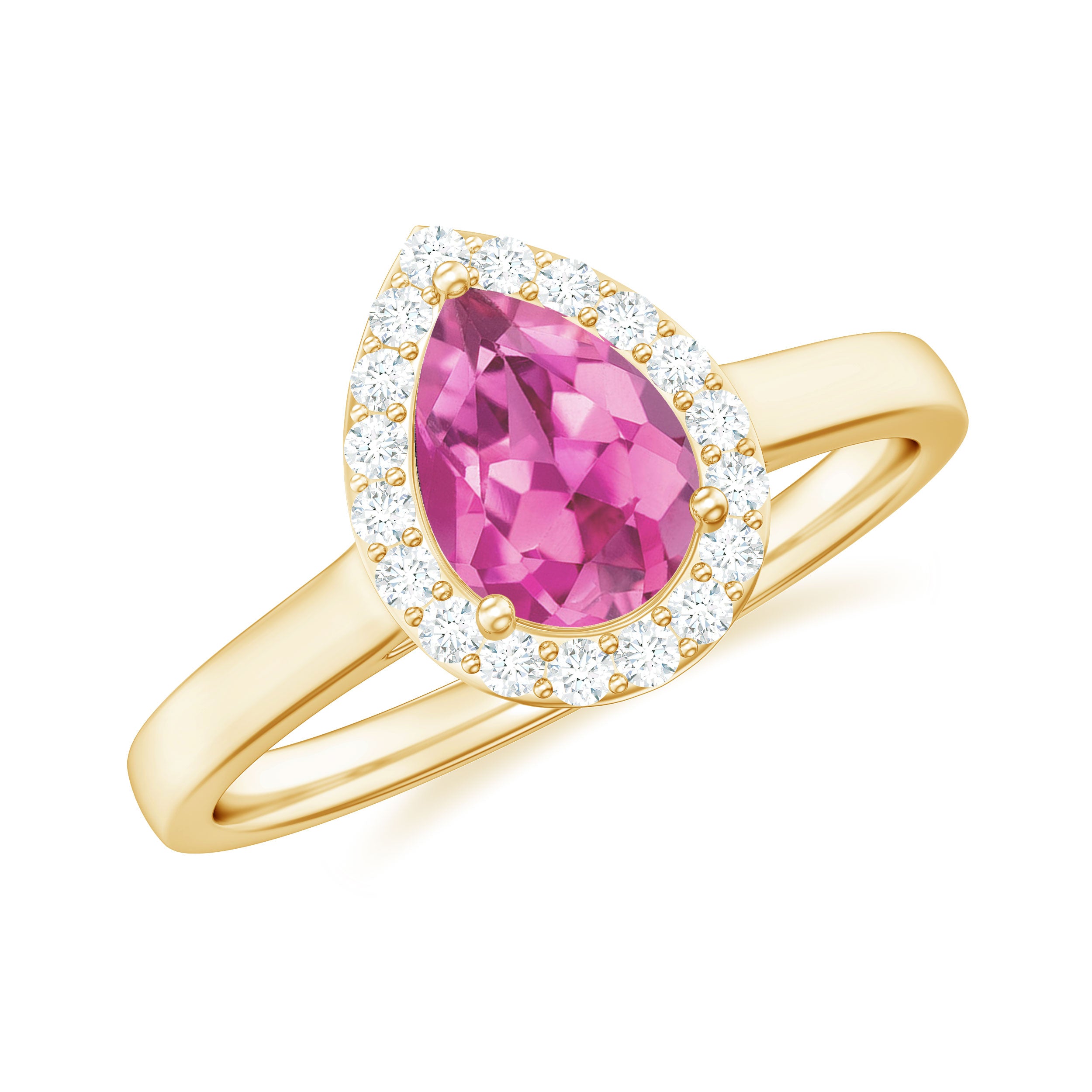 Teardrop Engagement Ring is sparkling 5X7 MM Pear Shape Pink Tourmaline is set as a Solitaire in prong setting with Round Shape Diamond gemstones are set in Halo. This Vintage Wedding Ring is mounted in Solid Gold. Give your loved ones a lovely surprise by presenting this stunning ring.