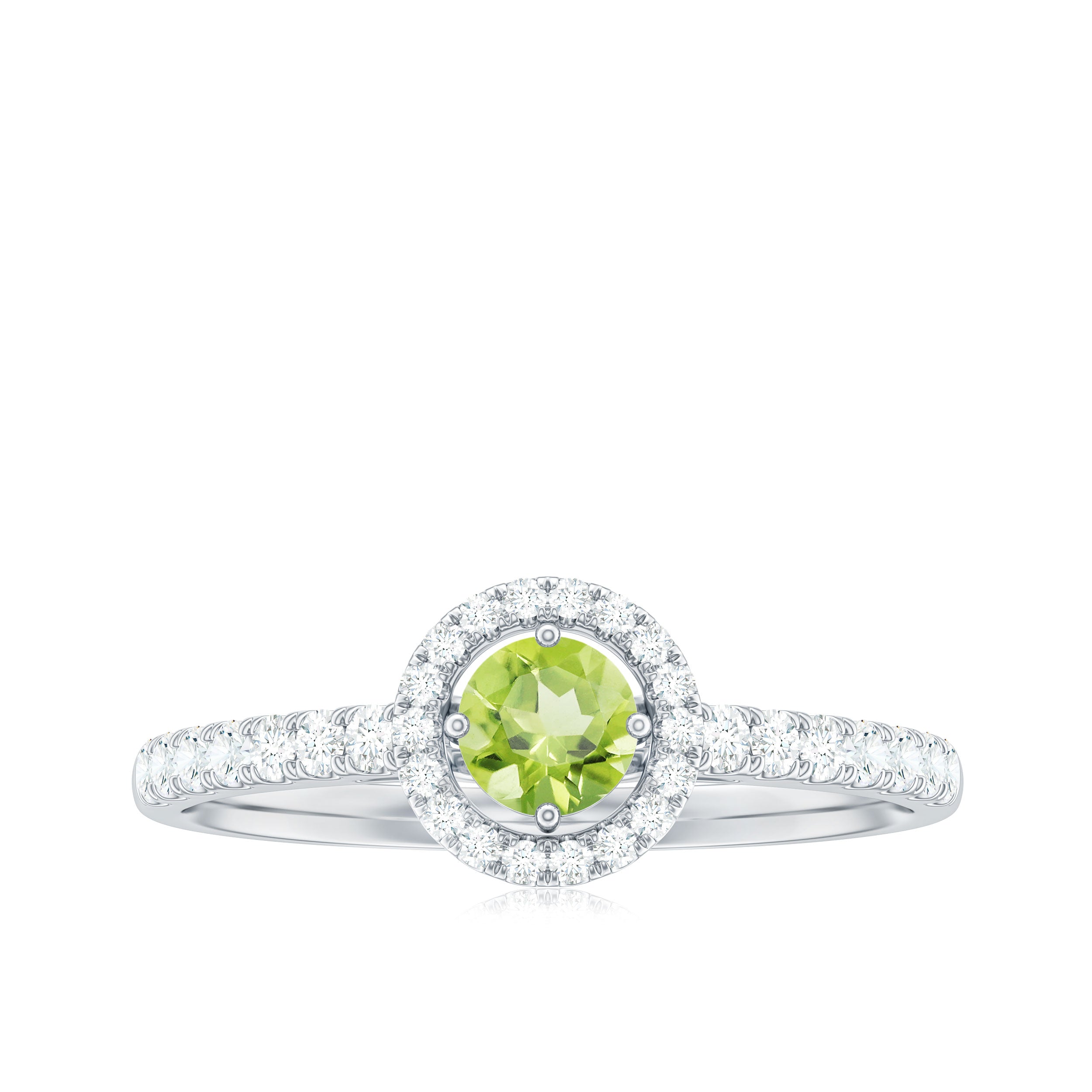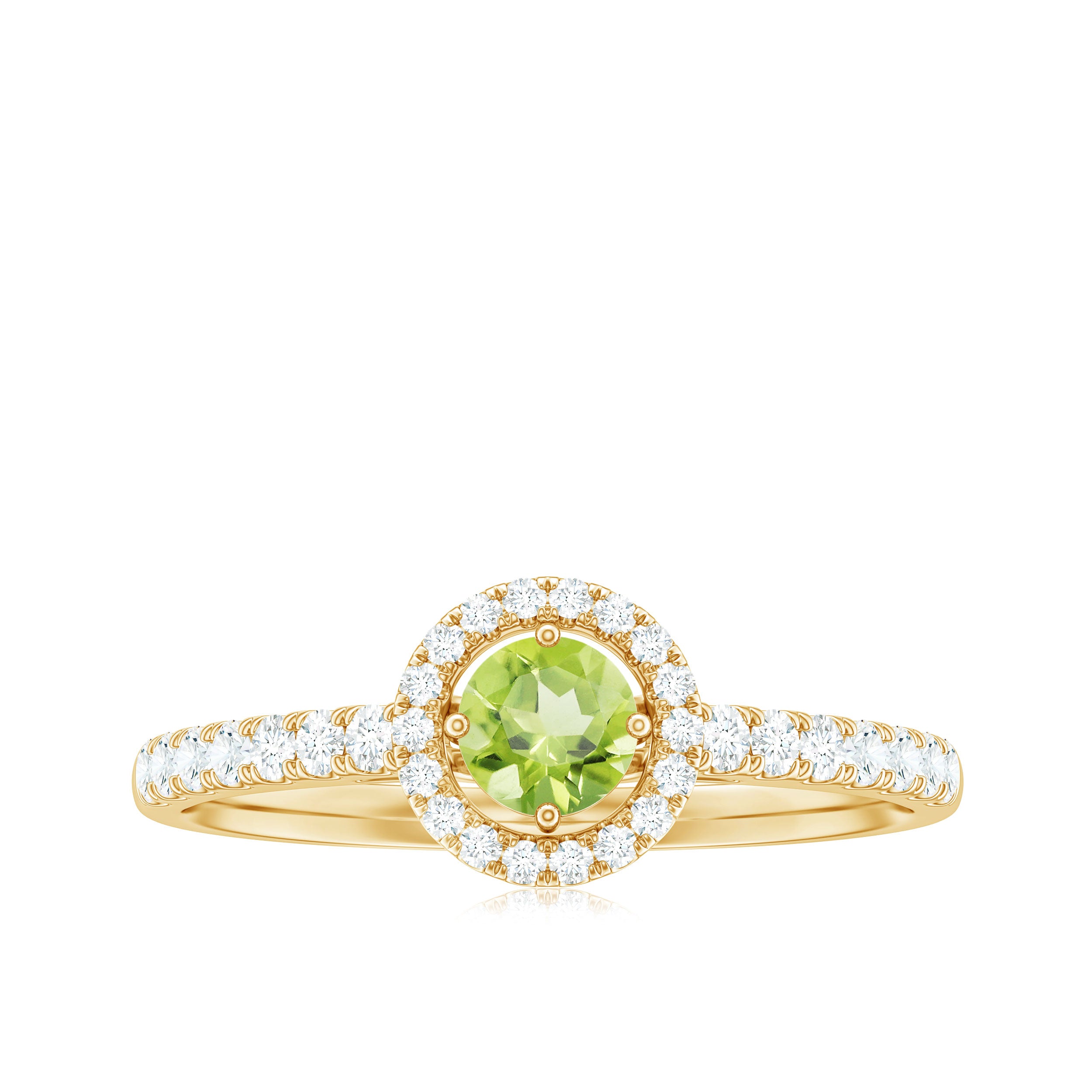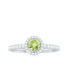 Classic Engagement Ring is the captivating piece encased with Round Shape Peridot set as Solitaire and Diamond are Studded as in halo and Side Stones. This Lovely Engagement Ring is crafted in Solid Gold.