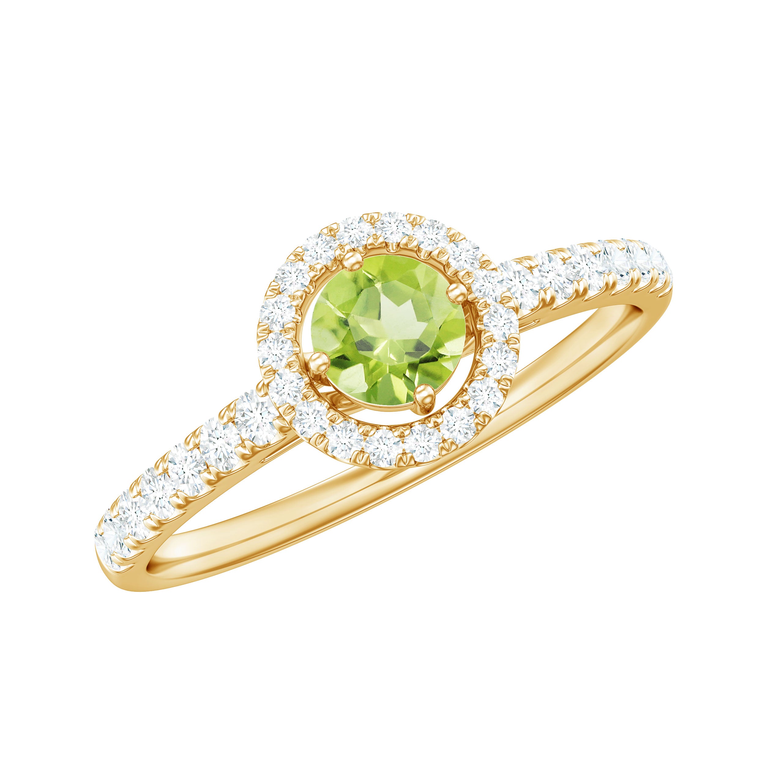 Classic Engagement Ring is the captivating piece encased with Round Shape Peridot set as Solitaire and Diamond are Studded as in halo and Side Stones. This Lovely Engagement Ring is crafted in Solid Gold.