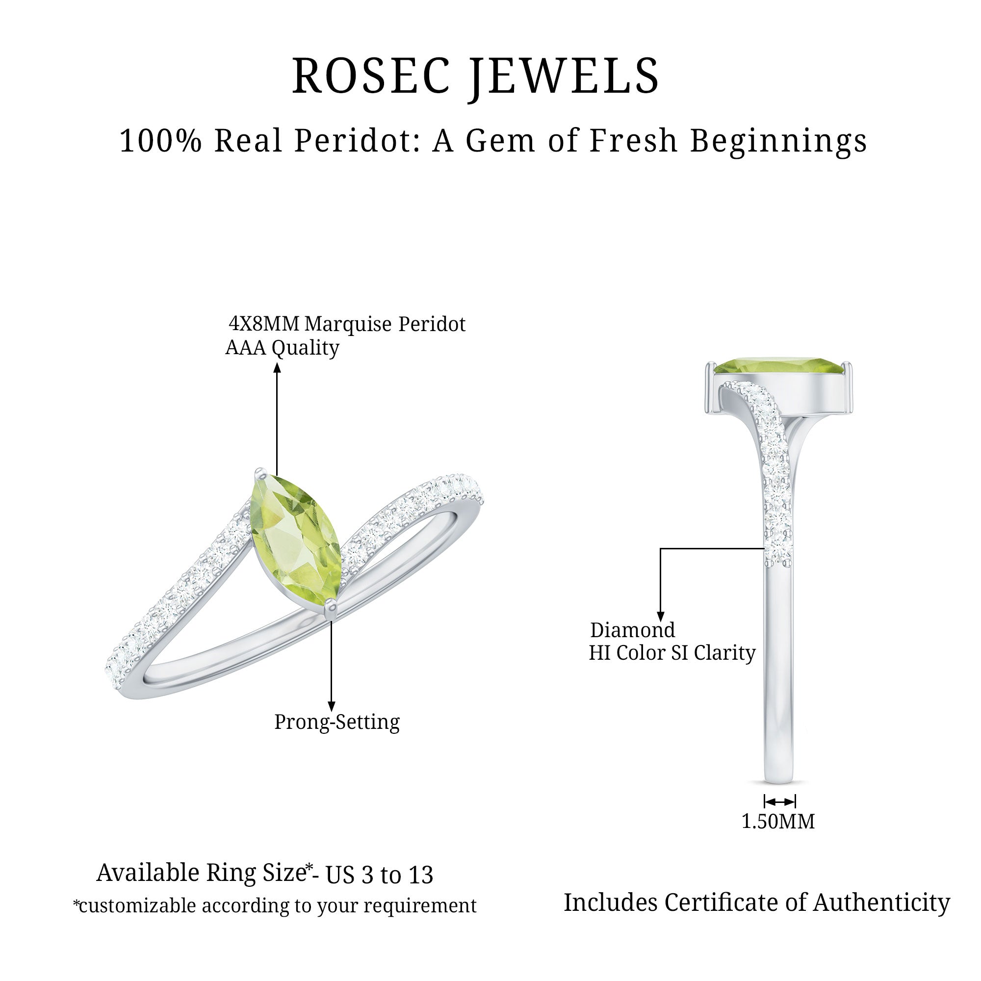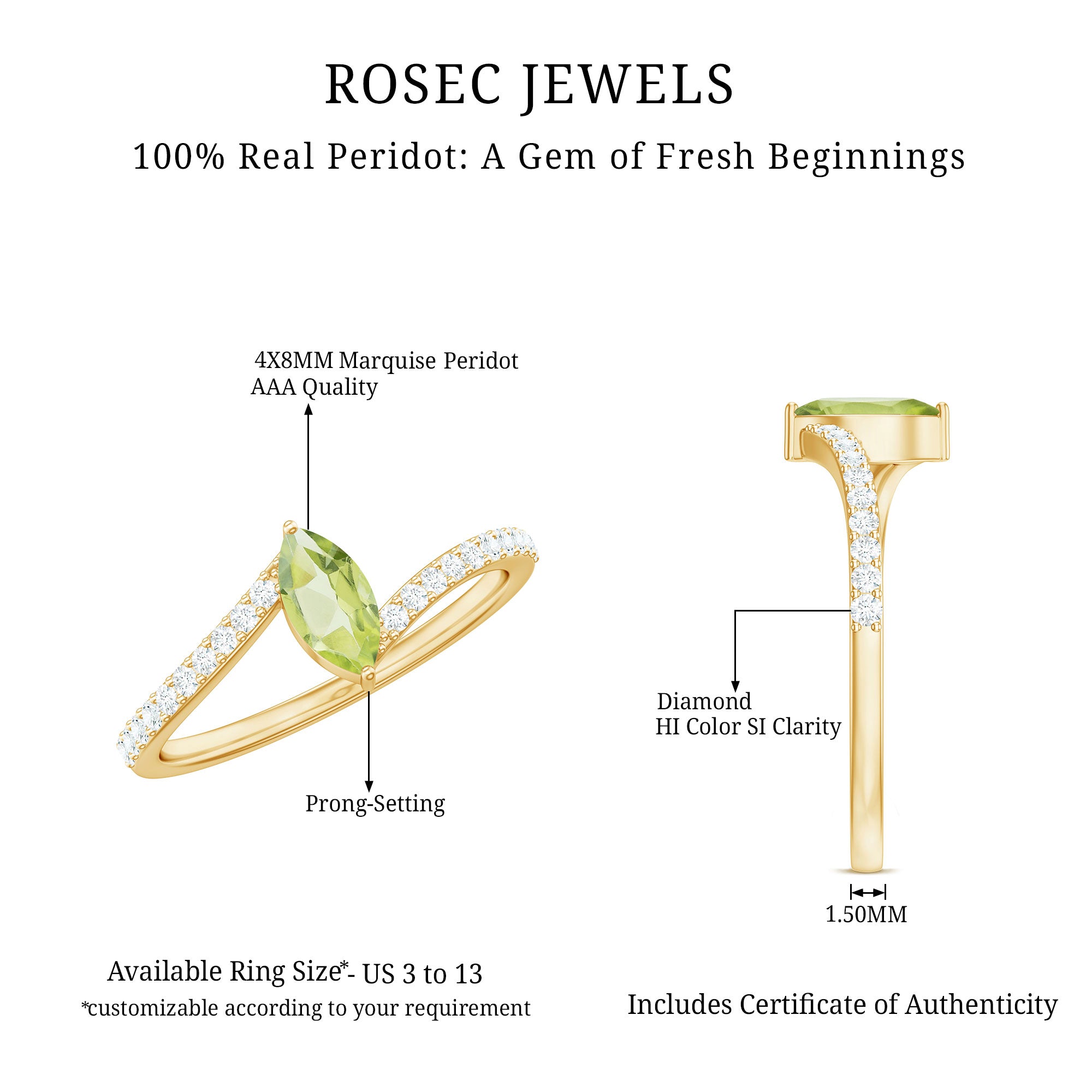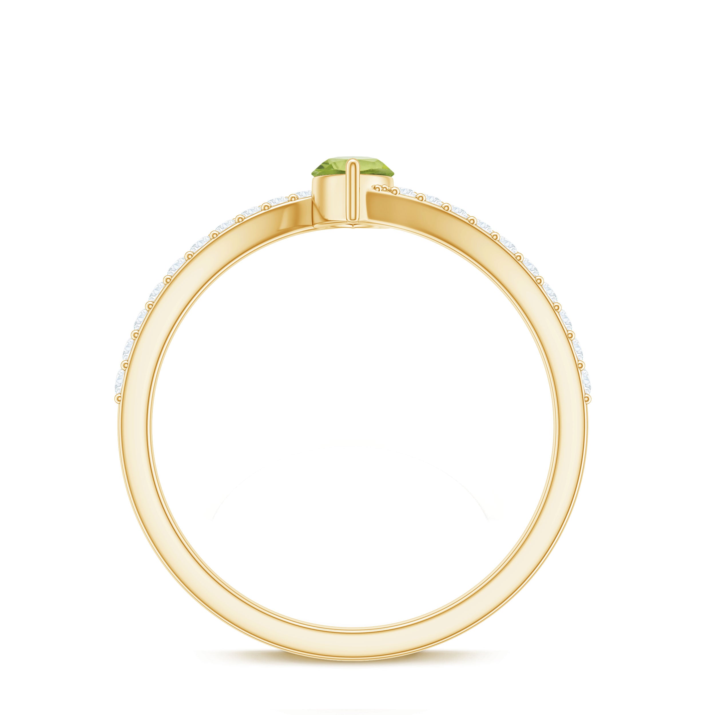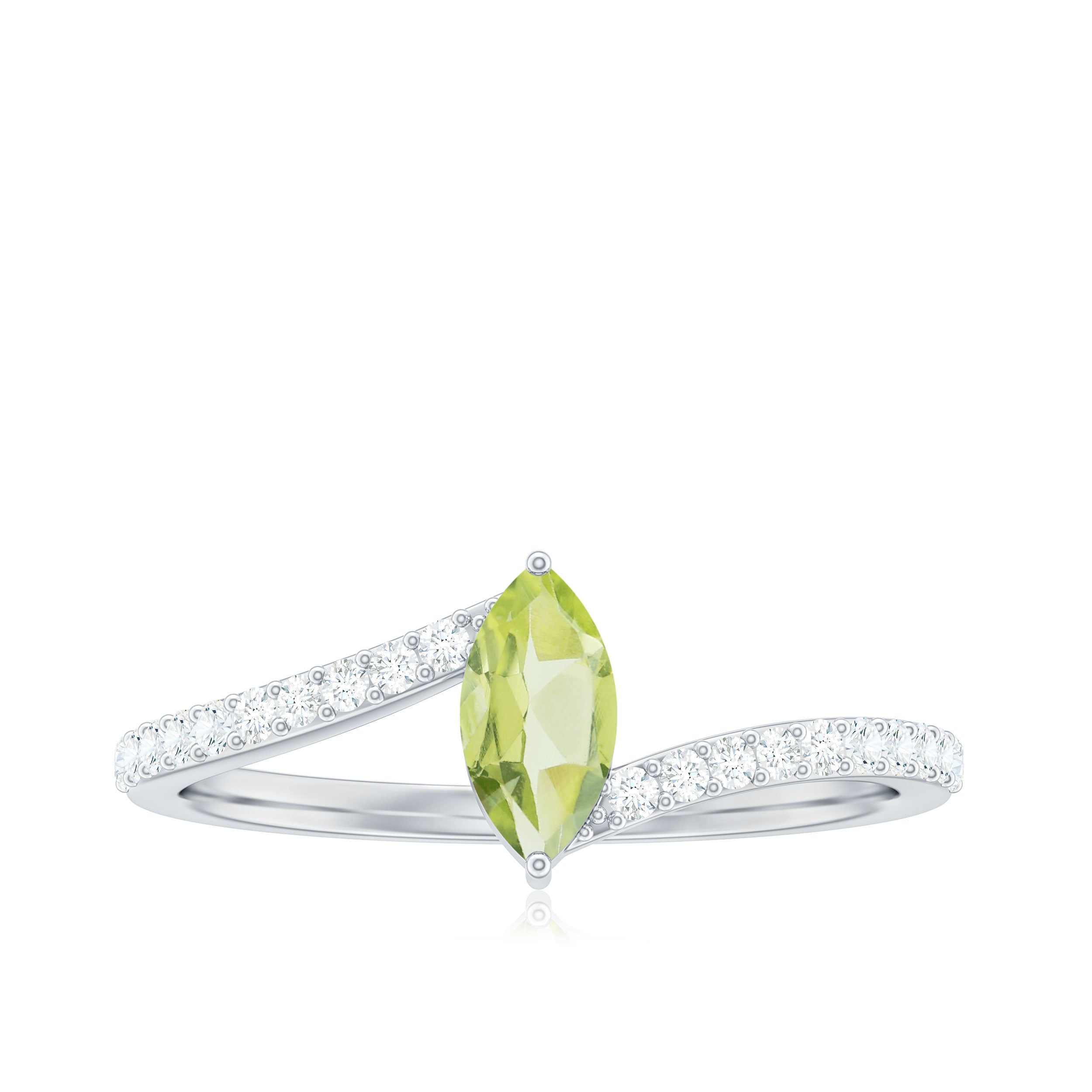 Add your expression of beauty to this lovely Peridot Solitaire Ring adorned with Marquise Cut Peridot in 2 Prong Setting while the shimmering Diamond Stones are studded over the mesmerizing Bypass Shank. This Peridot and Diamond Ring will bring more charm and elegance to your look.