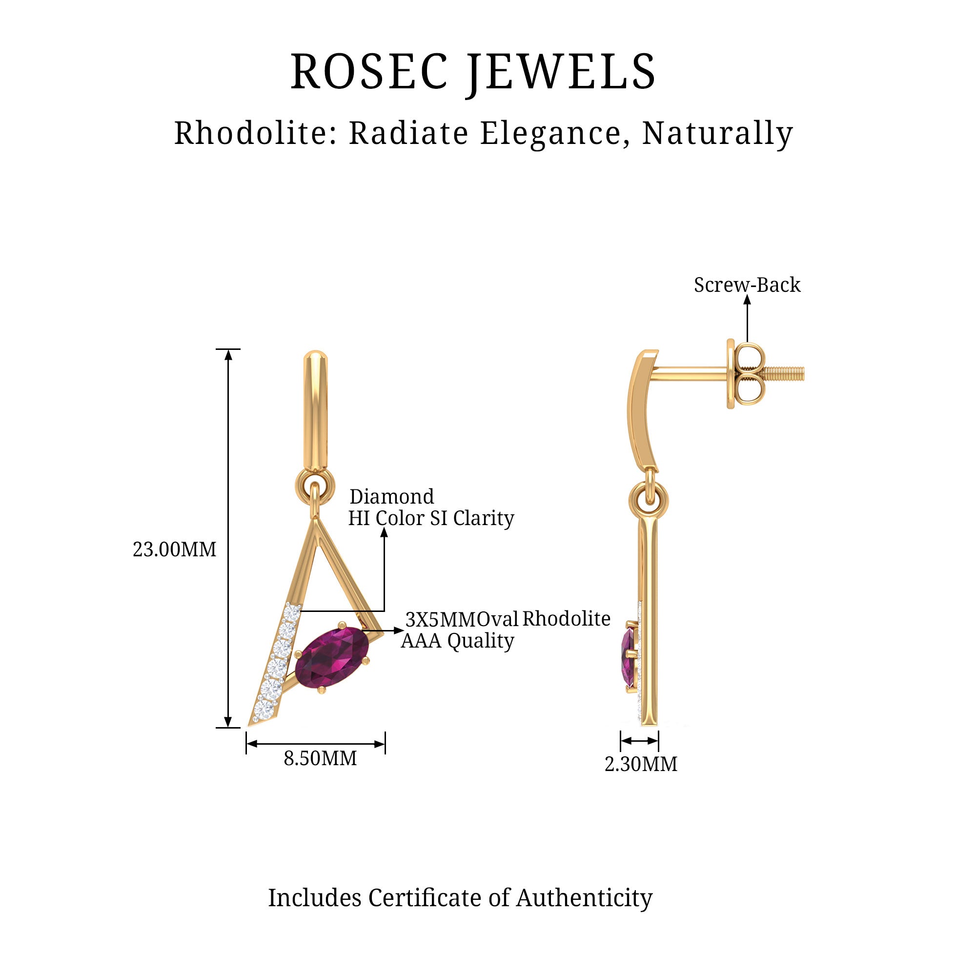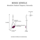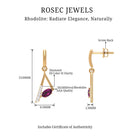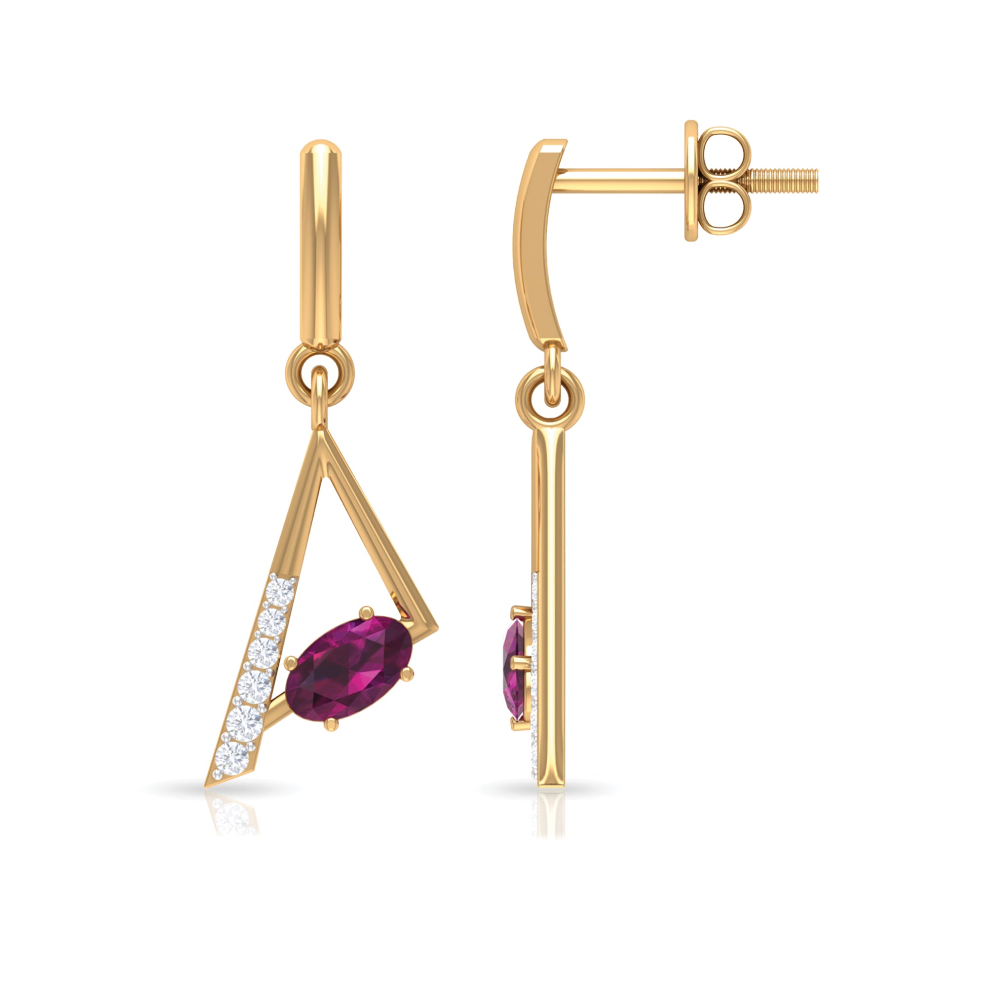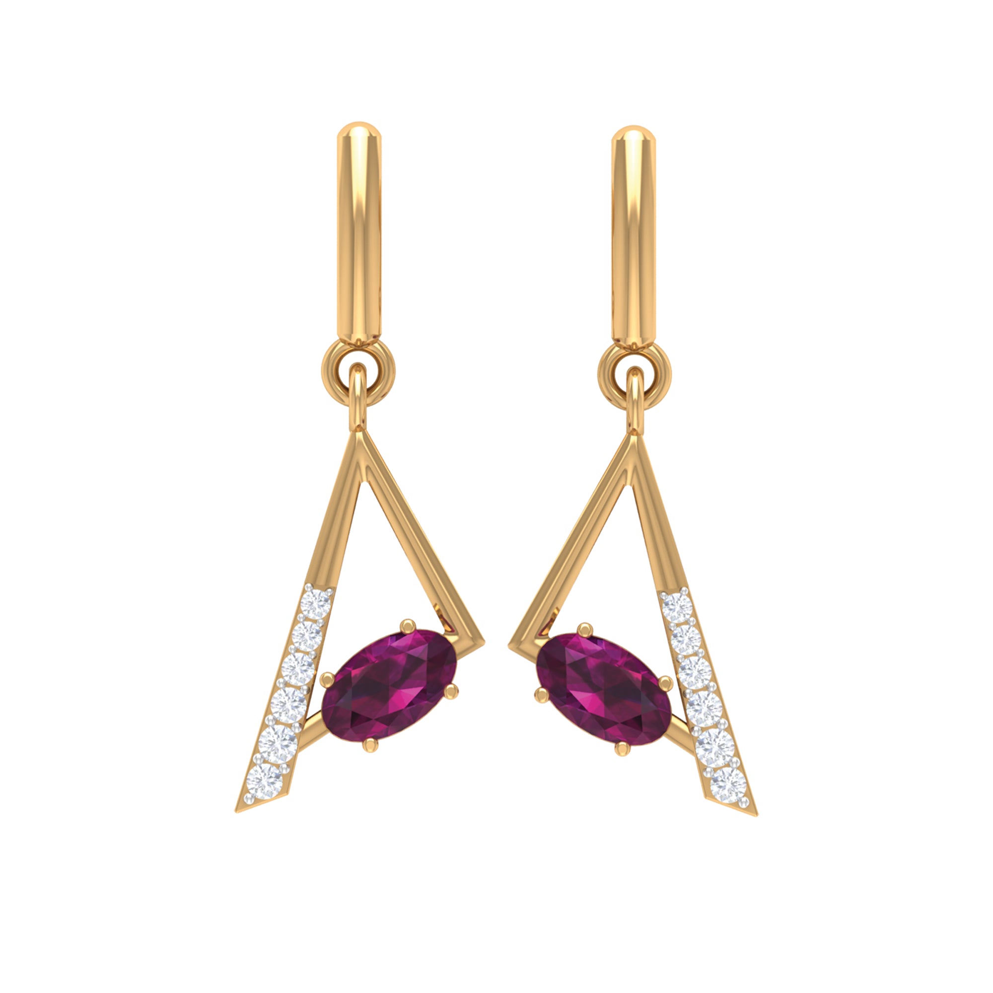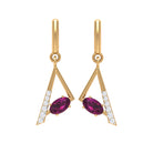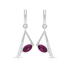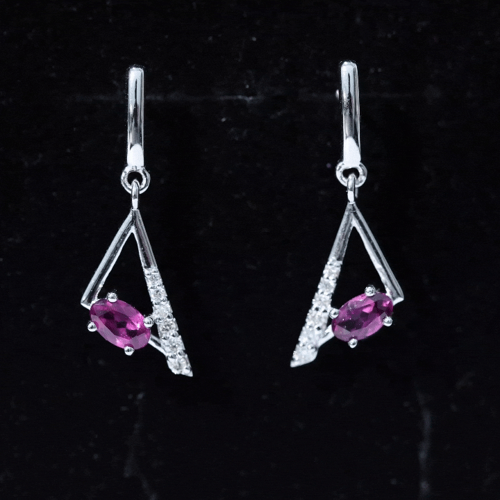 These Geometric Drop Earrings are embellished with an Oval Cut Rhodolite Gemstone set in a Prong Setting and Round Shape Diamond stones.