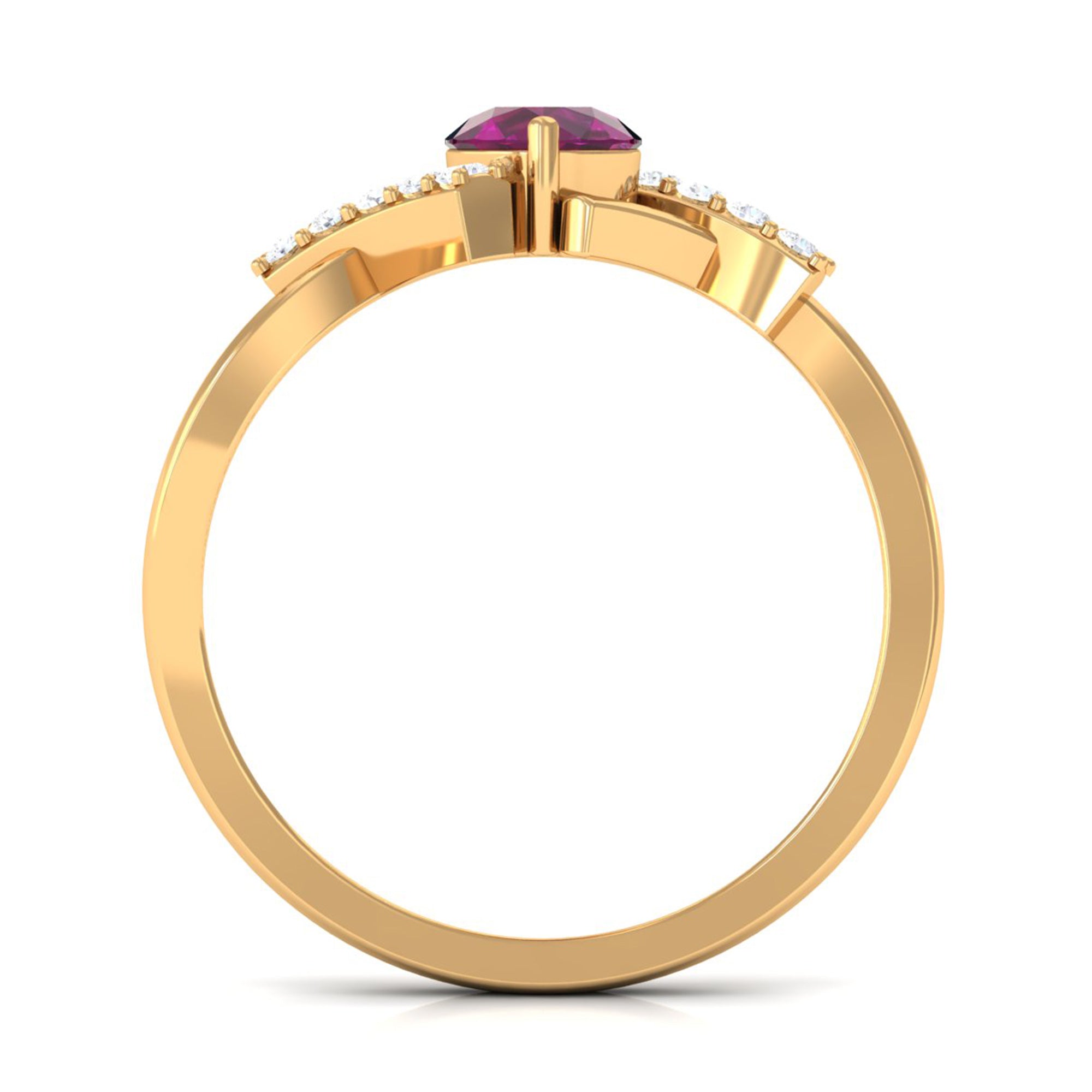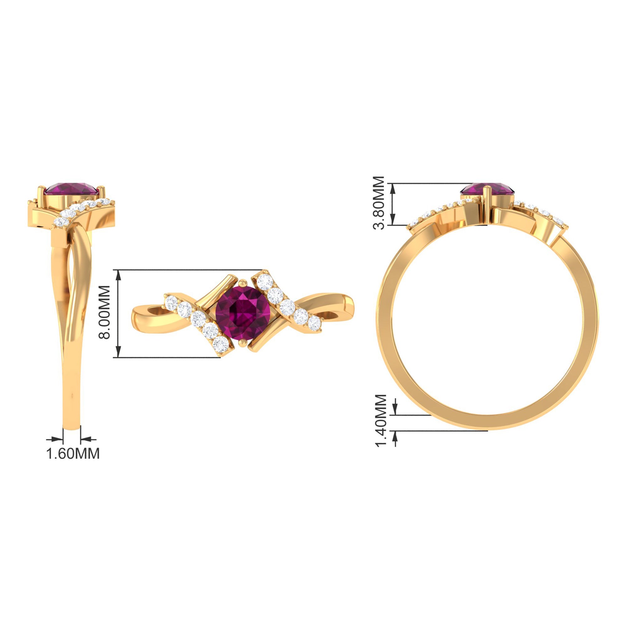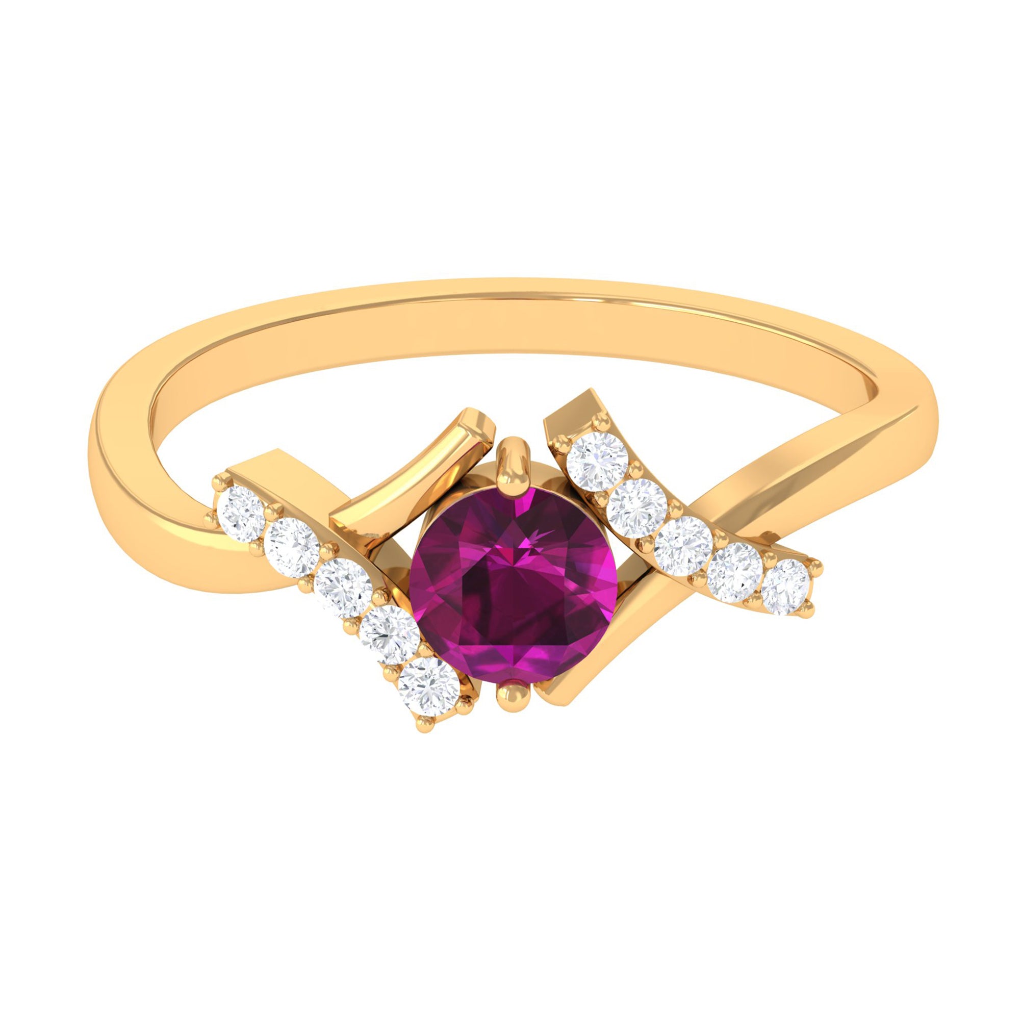 Surprise your girlfriend with this gorgeous Criss Cross Ring, the perfect Solitaire Promise Ring that is sure to take her breath away. Featuring a dazzling Round Shape Diamond and a 5 MM Round Shape Rhodolite, both securely set in Solid Gold, this ring is a testament to your everlasting love and commitment. The unique crisscross design adds a touch of modern elegance to this timeless piece. Give her a present that she will cherish forever and let this exquisite Engagement Ring be a symbol of your unwavering devotion to each other.