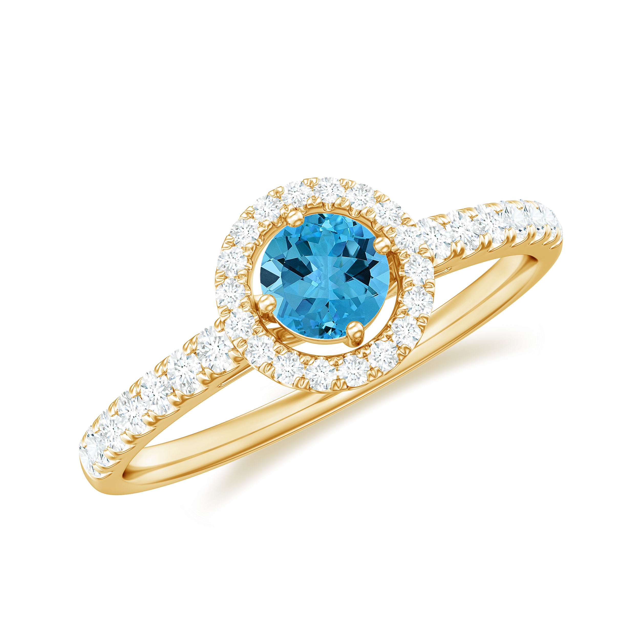 Classic Engagement Ring is the captivating piece encased with Round Shape Swiss Blue Topaz set as Solitaire and Diamond are Studded as in halo and Side Stones. This Lovely Engagement Ring is crafted in Solid Gold.