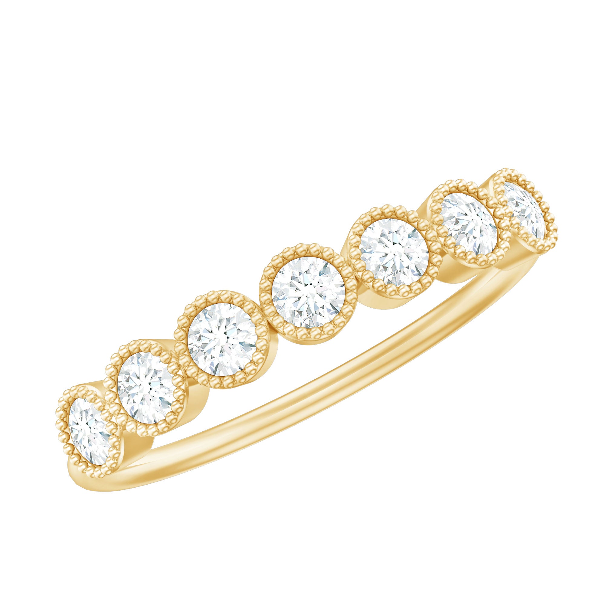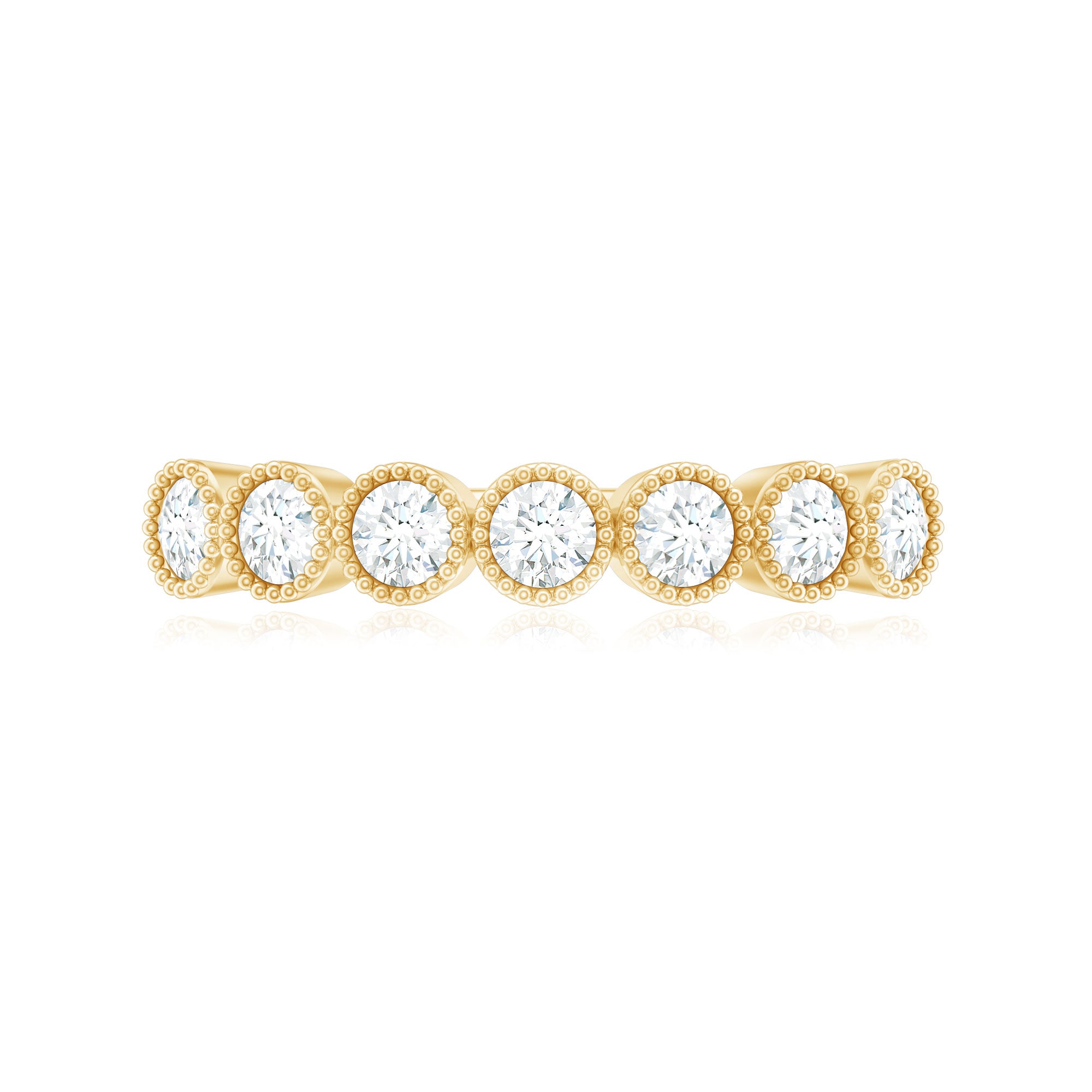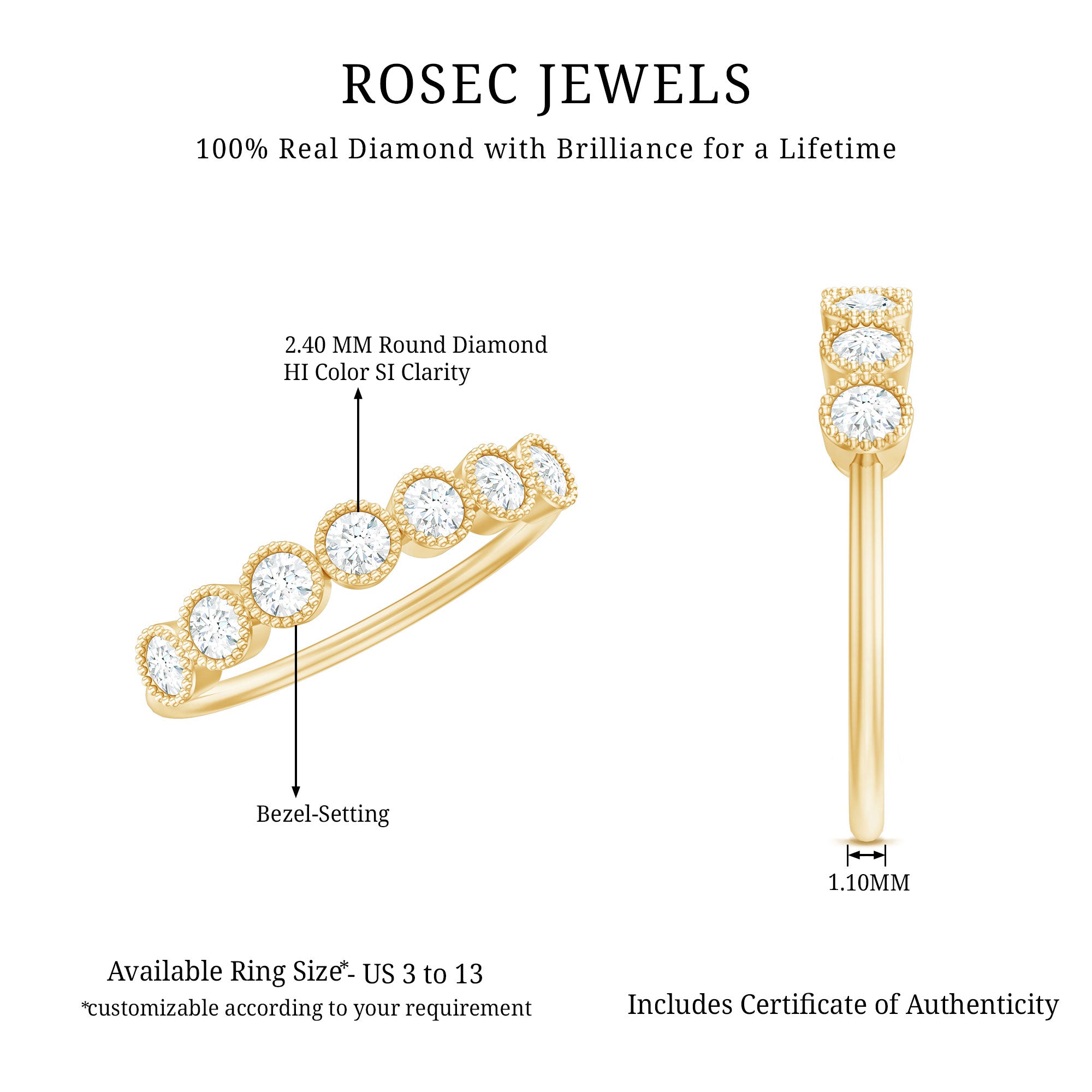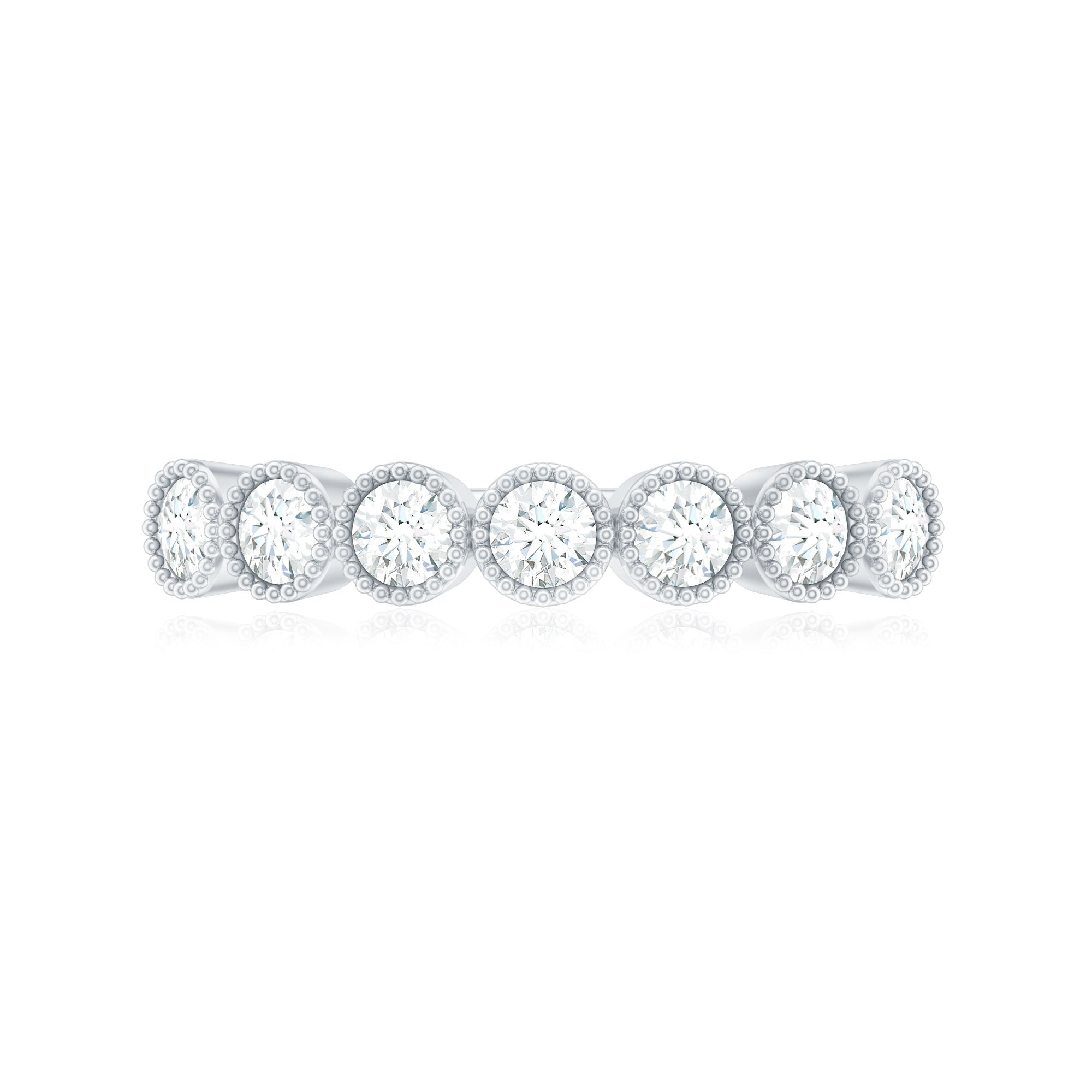 Exuding elegance and sophistication, this Diamond Wedding Ring has a modern allure on the vintage take, celebrating the unending love. The woman who prefers minimal elegance, this ring provides an example of beauty, giving it an understated and endlessly wearable. The symmetric arrangement of Round brilliant cut Diamond in Bezel Setting, along with the round beaded details, gives it a vintage look. Forged in a continuous band of brilliance, this Diamond Eternity Ring is a timeless expression of devotion. Its contemporary design allows it to wear as an everyday accessory. The uninterrupted sparkle of the Bezel Set Diamond Ring celebrates a unique bond or simply indulging in a symbol of luxury. Having an uninterrupted sparkle, this Half Eternity Ring embodies a love that lasts forever, allowing it to be beautifully paired with an engagement ring for a complete bridal set or worn solo for a statement of refined elegance.