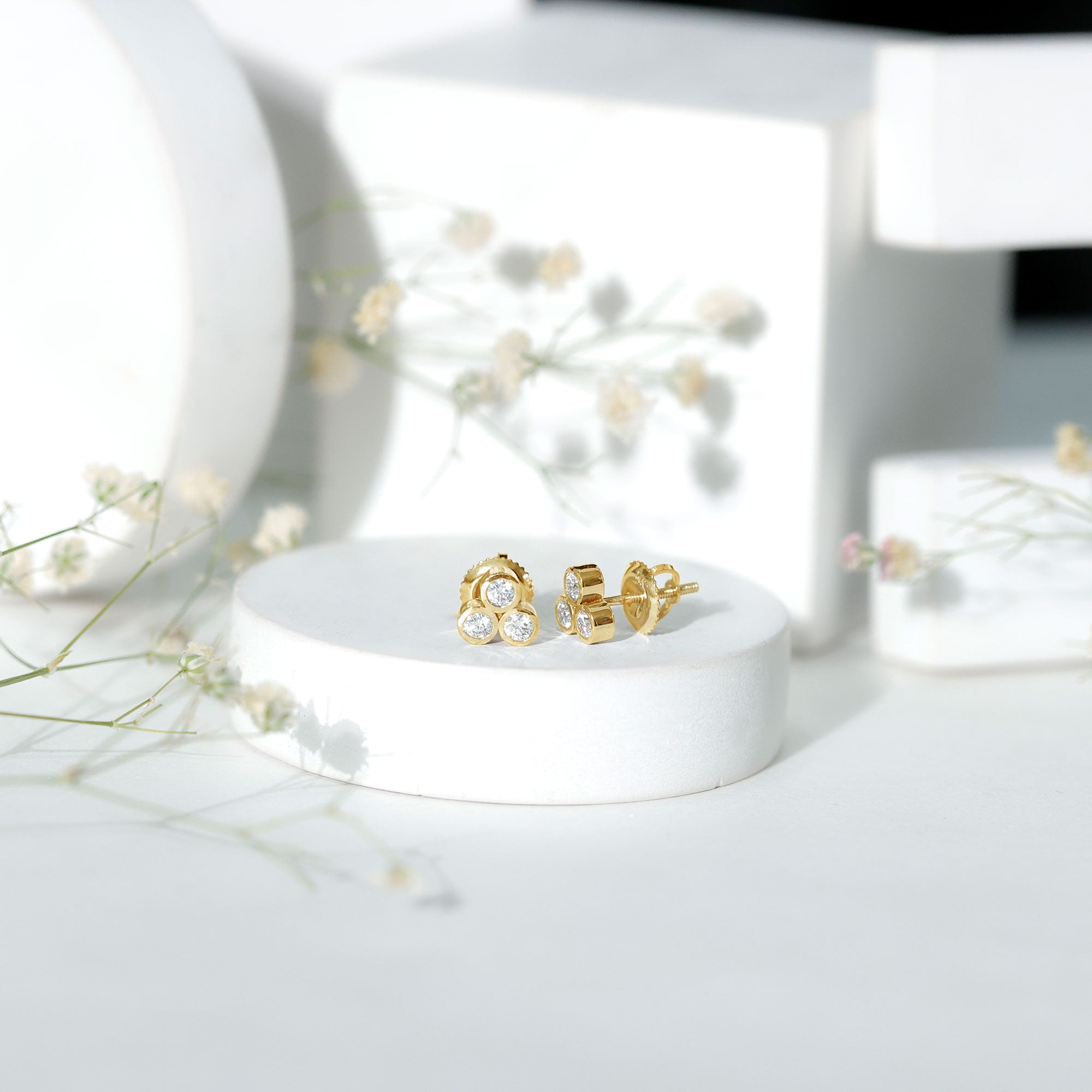 Add a touch of sophistication to your wardrobe with these stunning Stud Earrings adorned with Round Cut Moissanite in Bezel Setting. These Moissanite Earrings feature a classic 3-stone design and are secured with screw-back closures to ensure a comfortable and secure fit. Whether youre headed to the office or out for a night on the town, these versatile earrings are sure to make a statement. Surprise your loved one with these elegant earrings and make their day even more special.