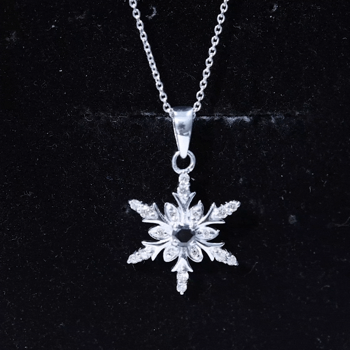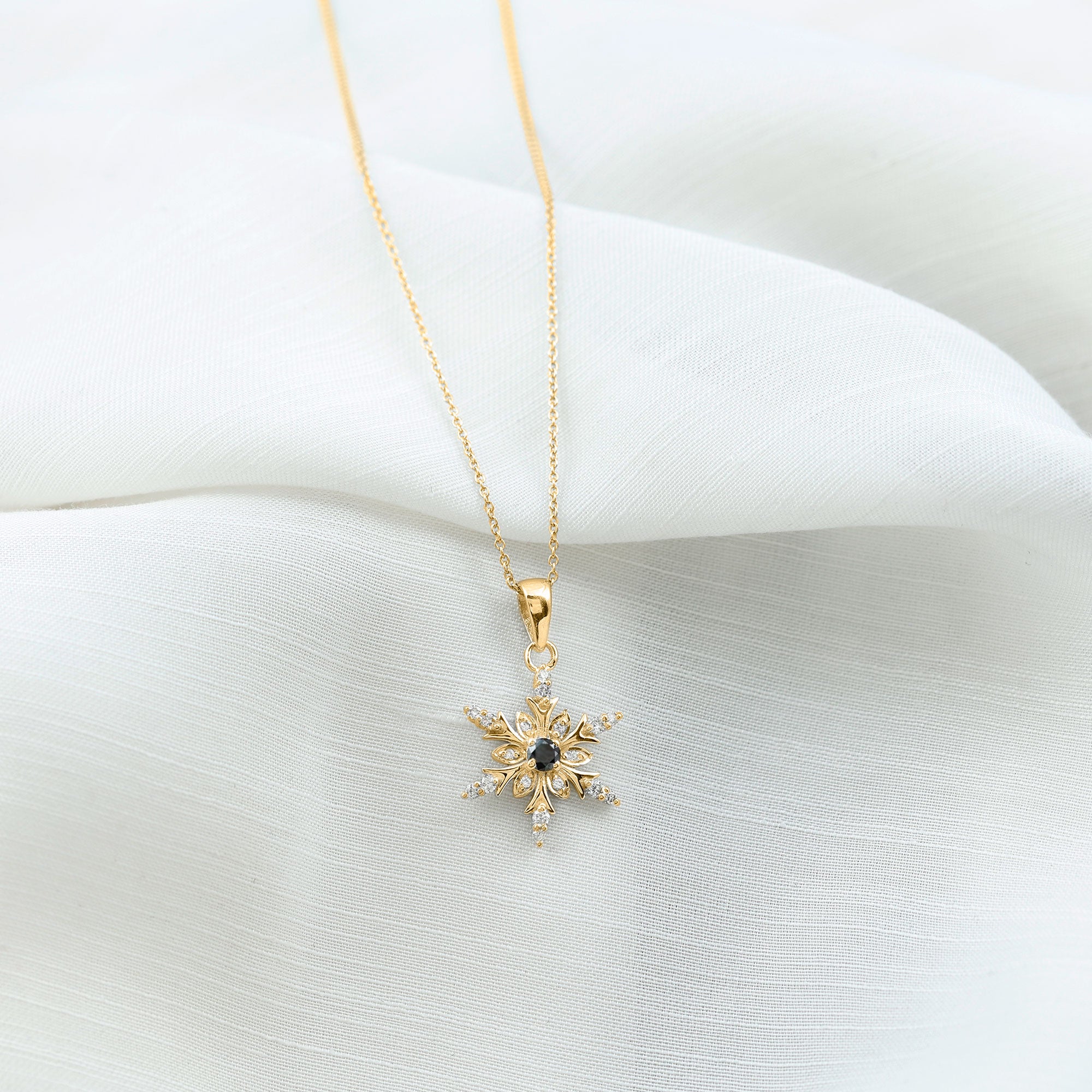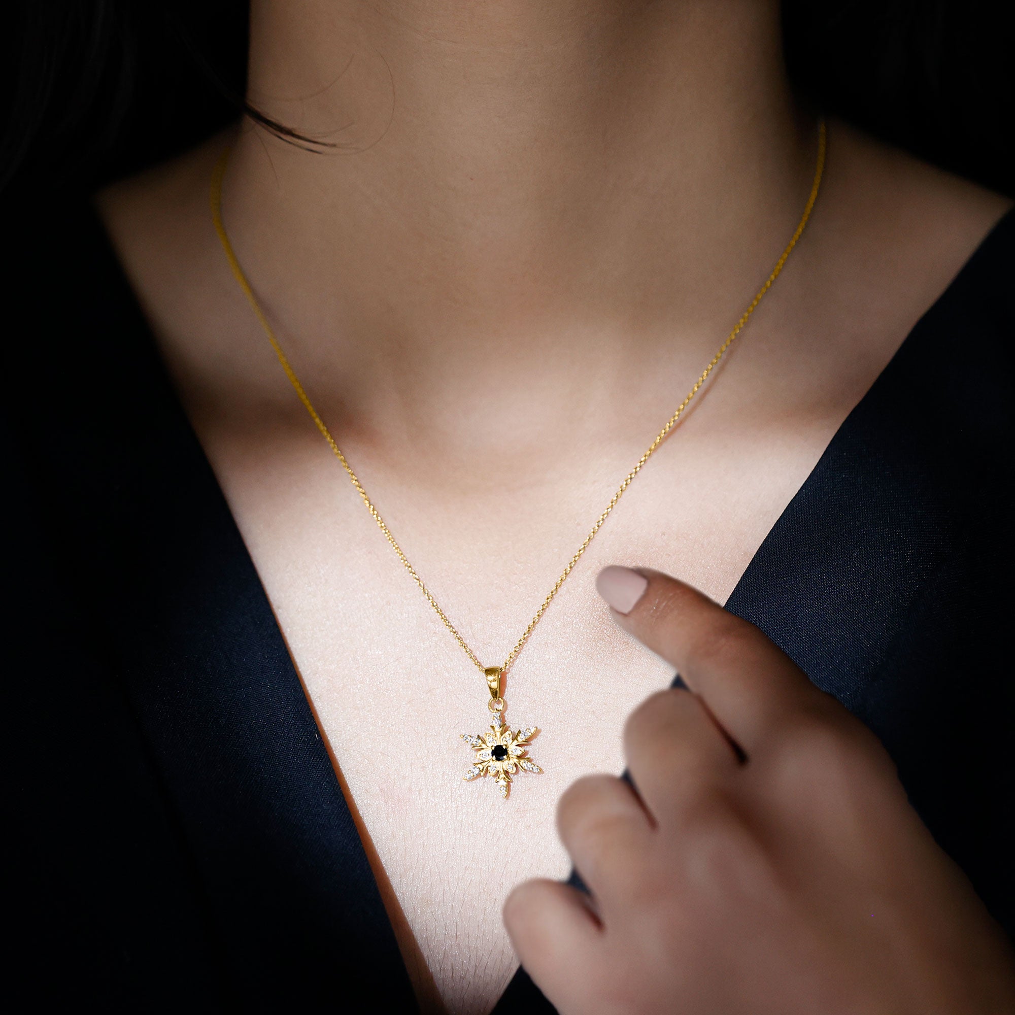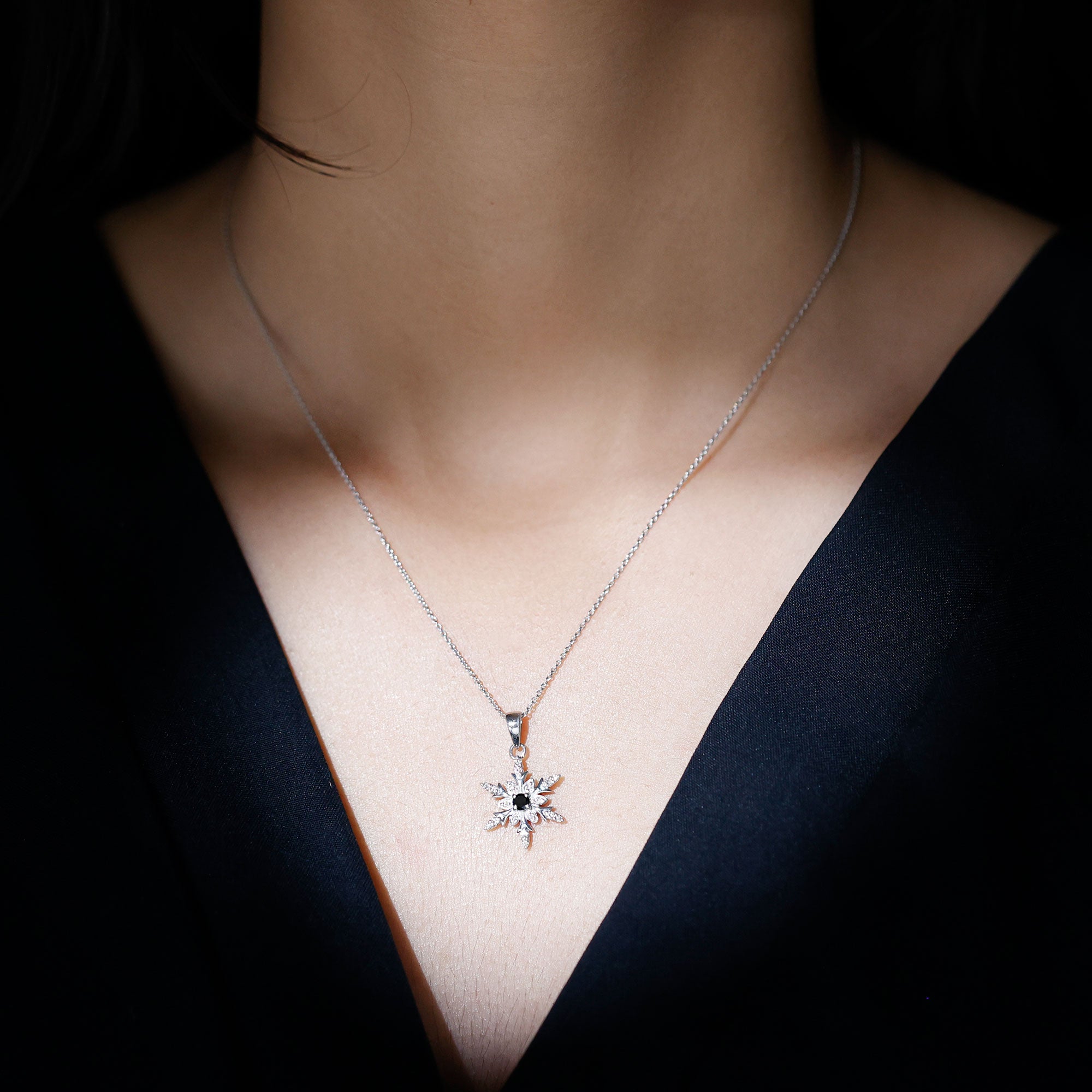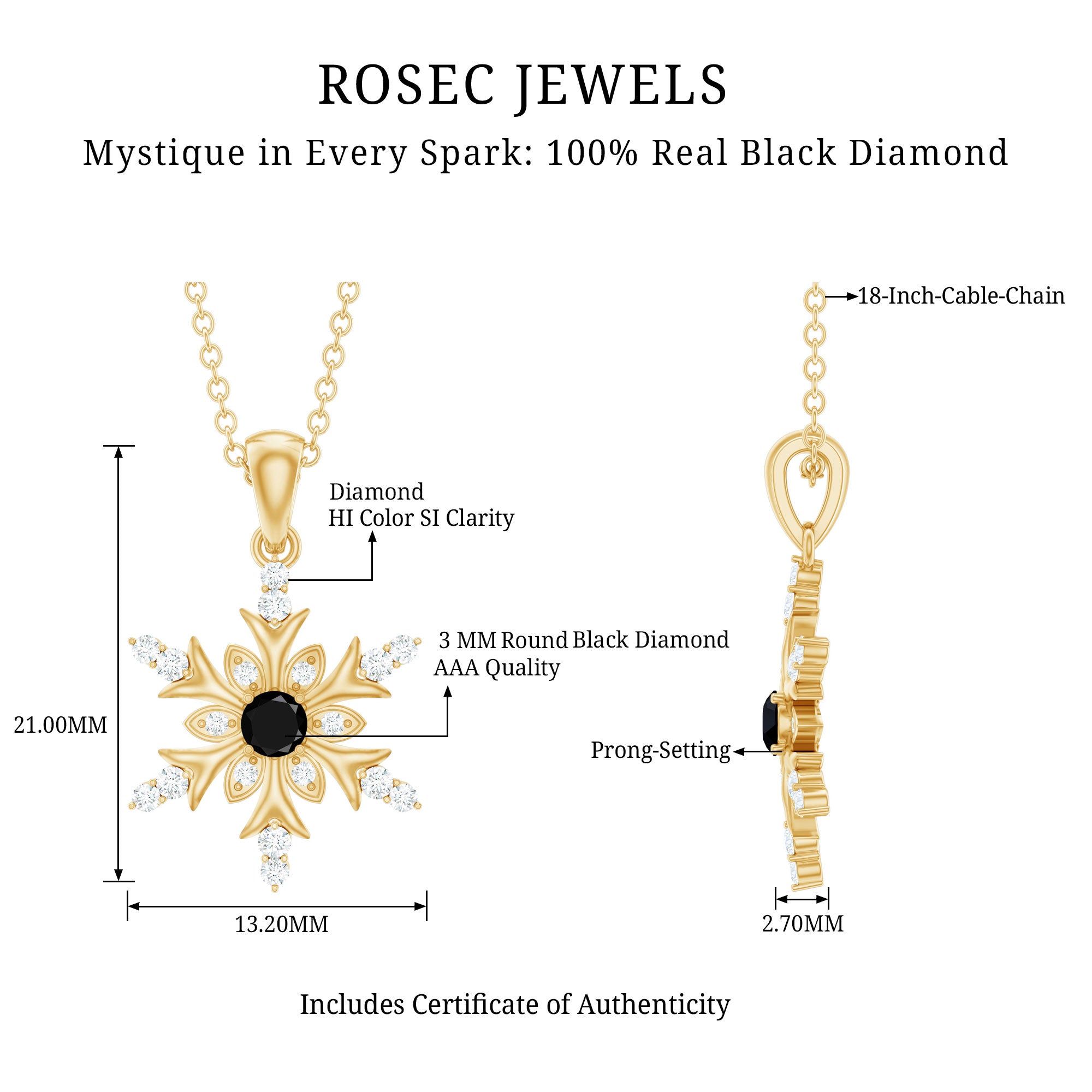 Make your everyday special with our Snowflake pendant featuring Round Shape Black Diamond as Solitaire in Prong Setting with Round Shape Diamond set in Prong Setting and adorned in Solid Gold.