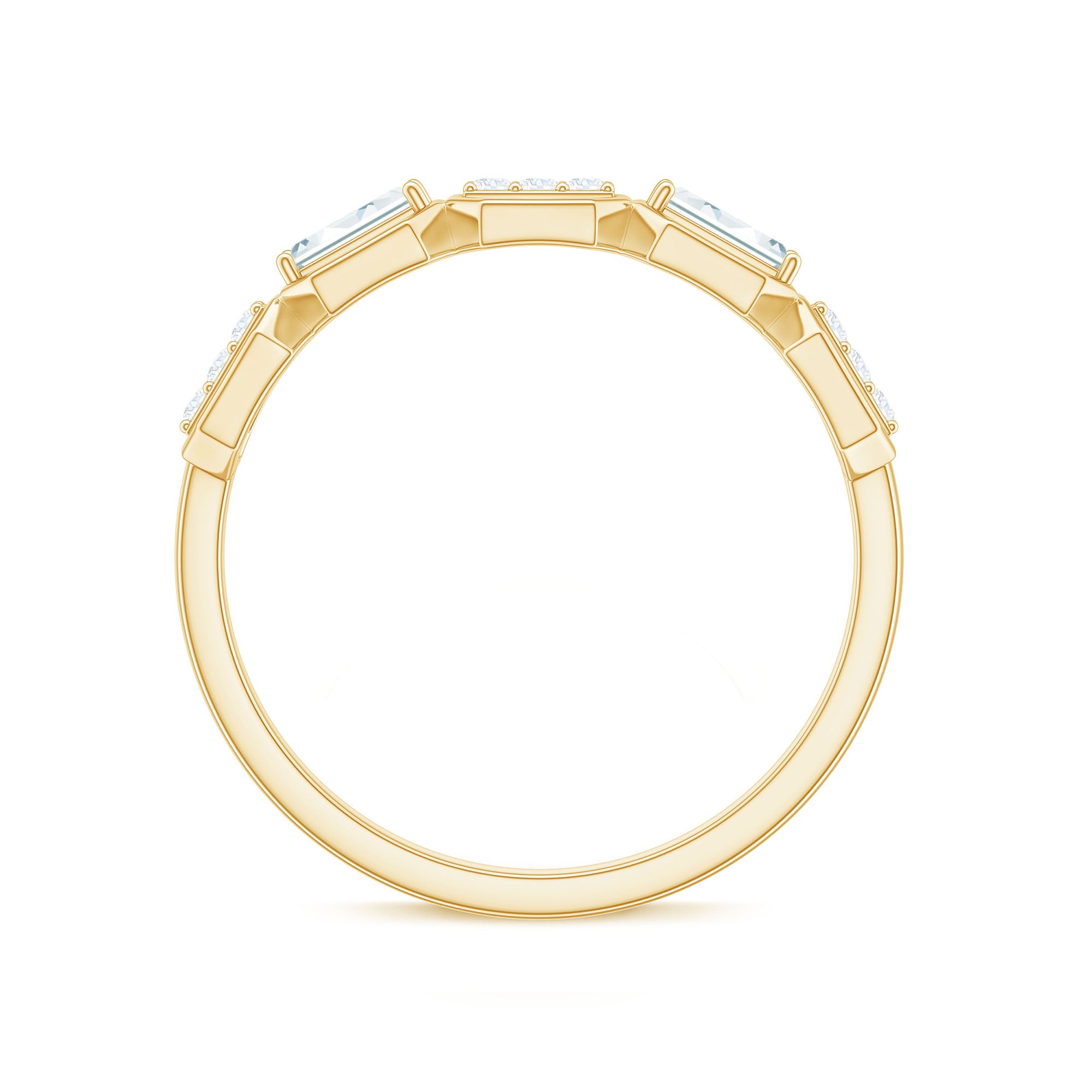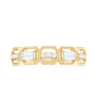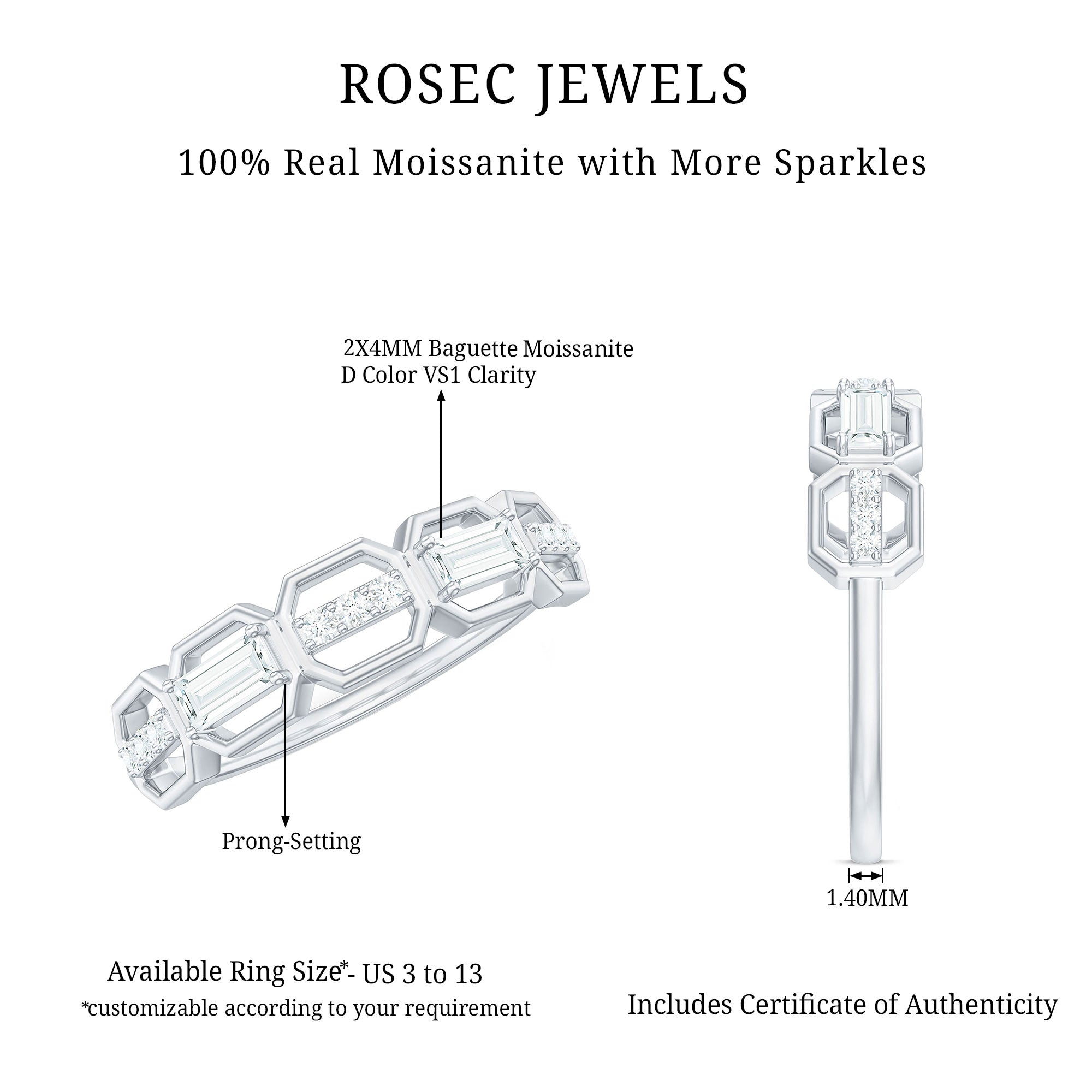 This stylish Moissanite Eternity Band brings together modern design and classic sparkle, making it a perfect choice for any woman who loves geometric designs. Featuring a row of alternating round and baguette cut moissanites, each set within bold hexagon shaped frames, this Half Eternity Band Ring creates a unique geometric pattern that catches the light beautifully from every angle. All moissanite stones are of high-quality D color and VS1 clarity, offering a brilliant, ethical alternative to diamonds. Designed for comfort and everyday wear, the Moissanite Wedding Band is slim enough to stack with other rings but bold enough to stand out on its own. Whether worn as a wedding band, anniversary gift, or stylish statement piece, it suits any occasion with ease. The Wedding Anniversary Ring comes in a full range of sizes and is delivered in an elegant jewelry box, along with a certificate of authenticity for a smooth and trustworthy shopping experience. Meticulously crafted to blend individuality with timeless charm, this moissanite band is a meaningful and versatile addition to any jewelry collection.