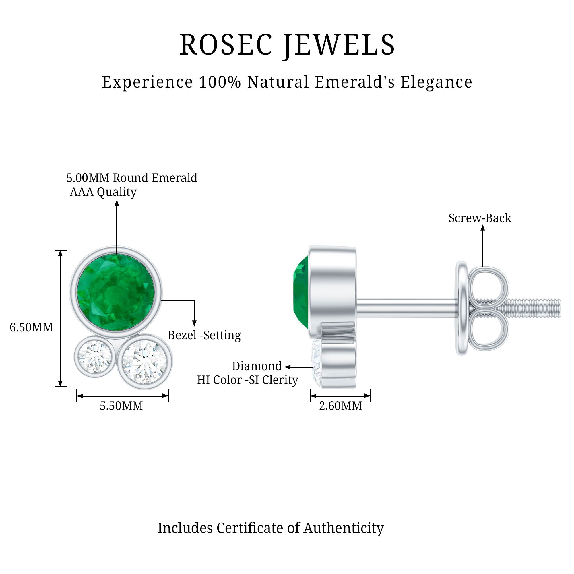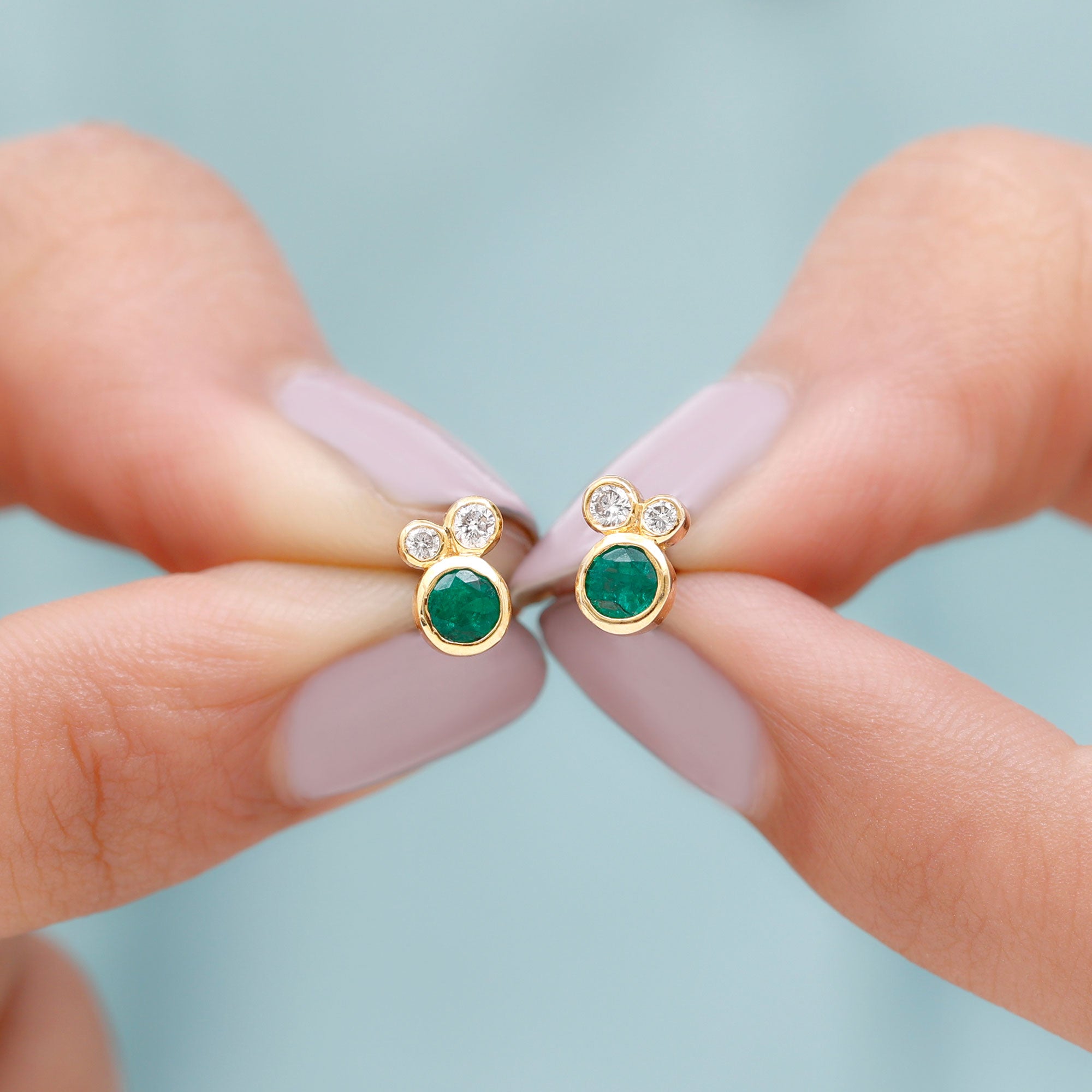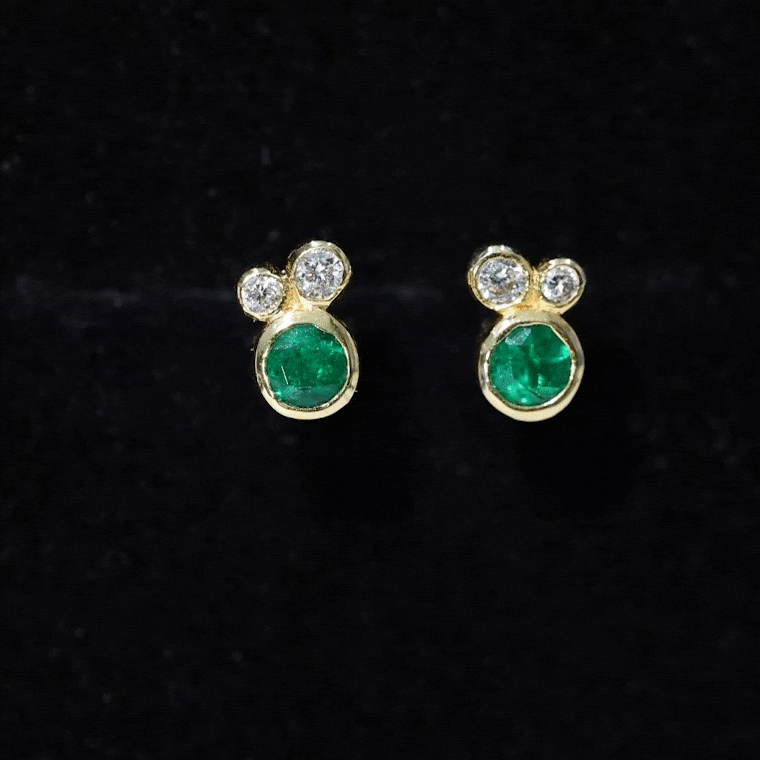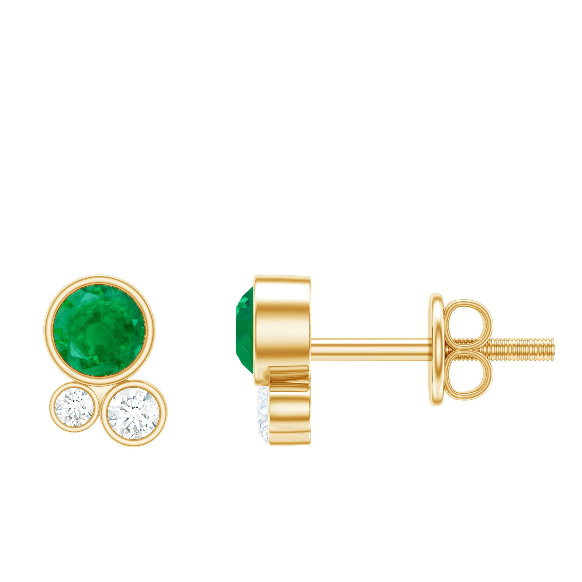 Grab this shinning Three Stone Stud Earrings for your loved one. These Dainty Earrings are embellished with Round Shape Emerald and Diamond in Solid Gold with Bezel Setting.