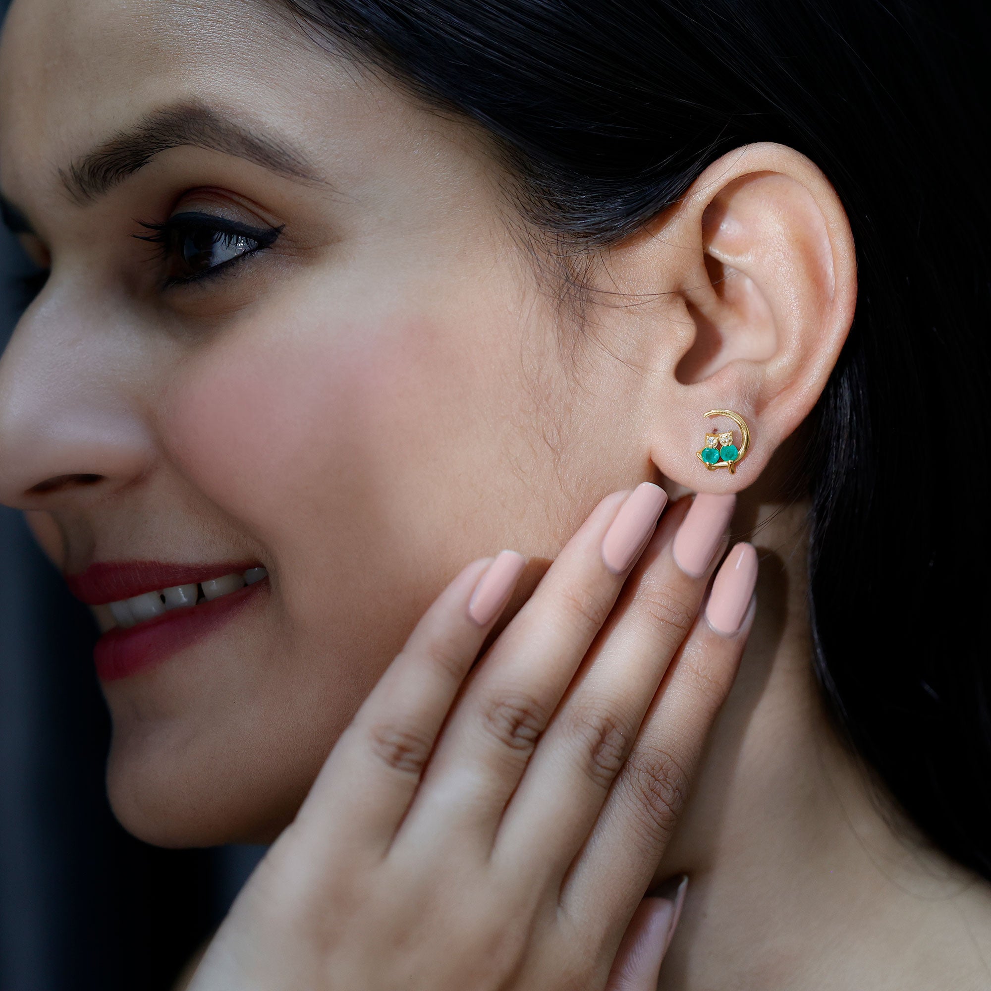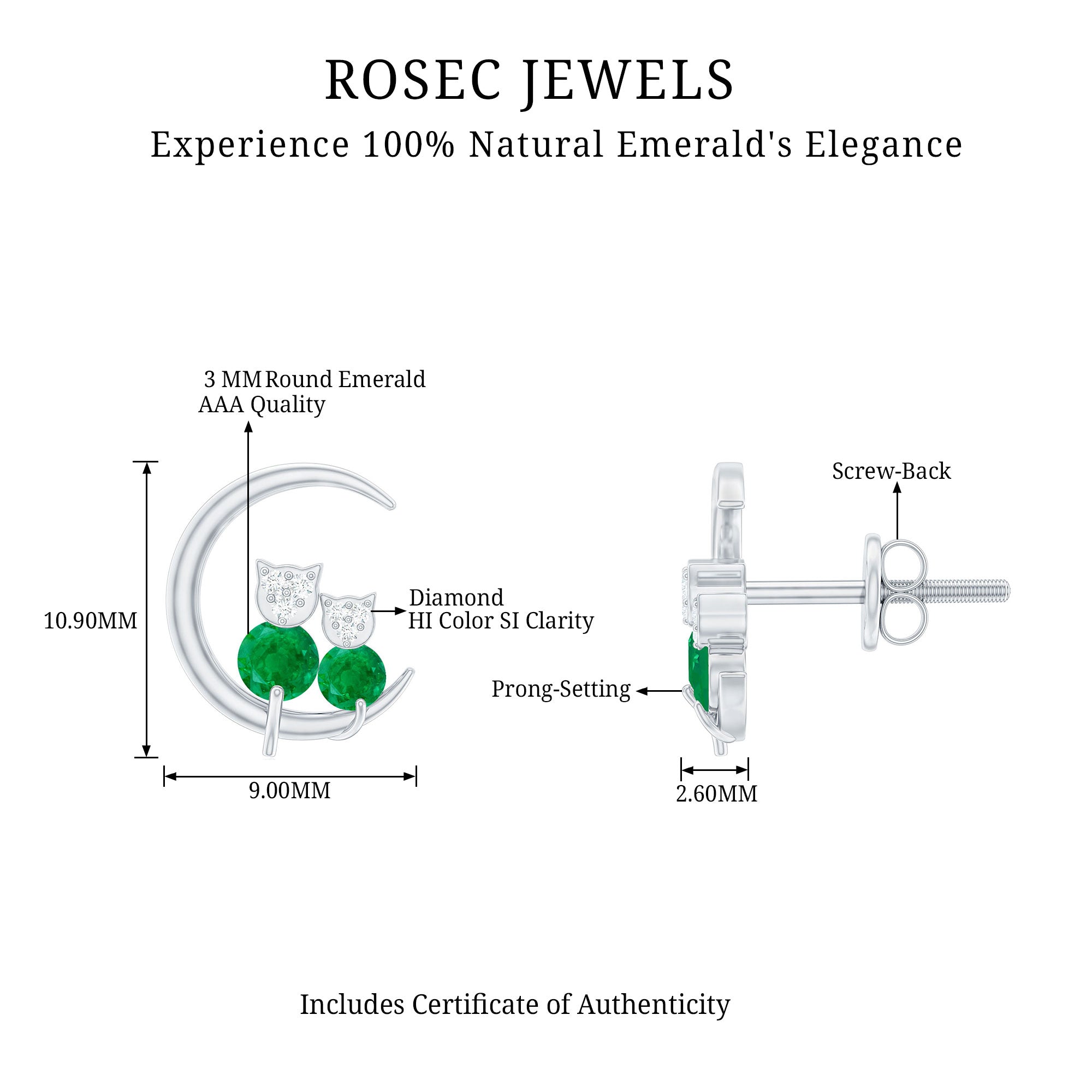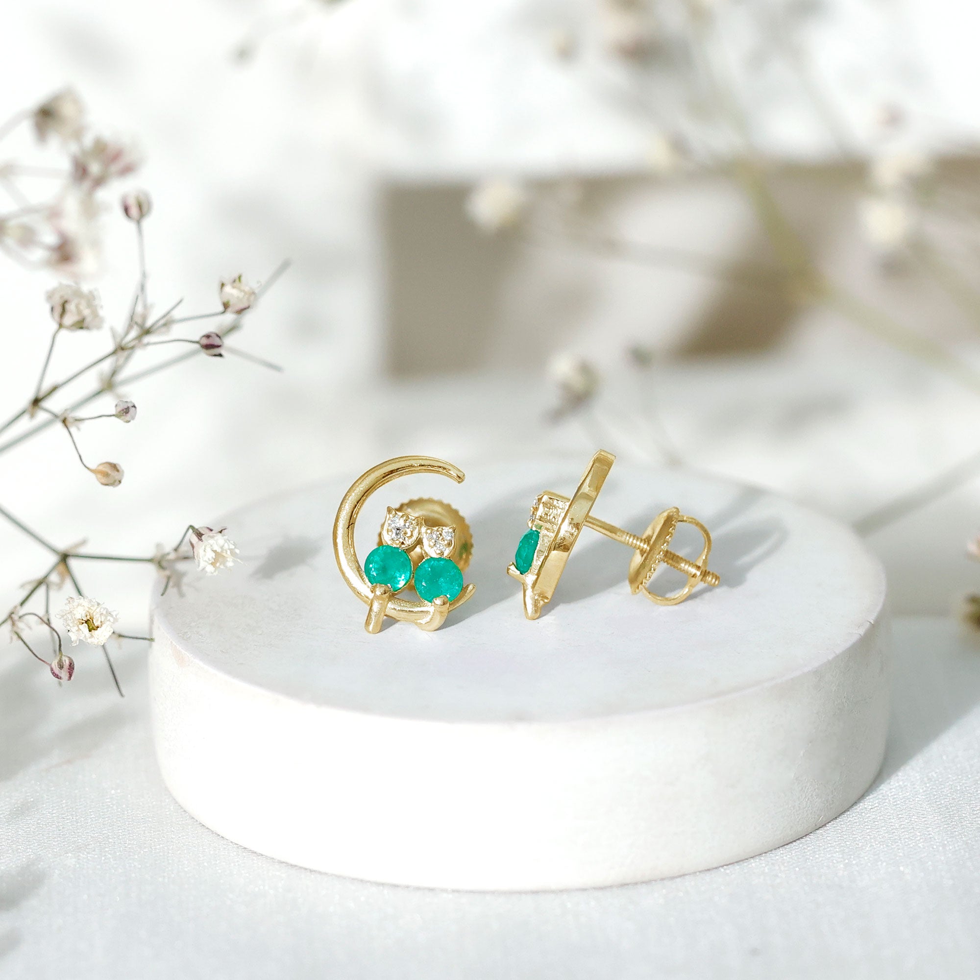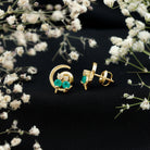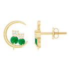 This Cat and Moon Stud Earrings embellished with Round Shape Emerald and Diamond stones in Prong Setting, crafted in Solid Gold.