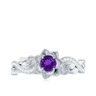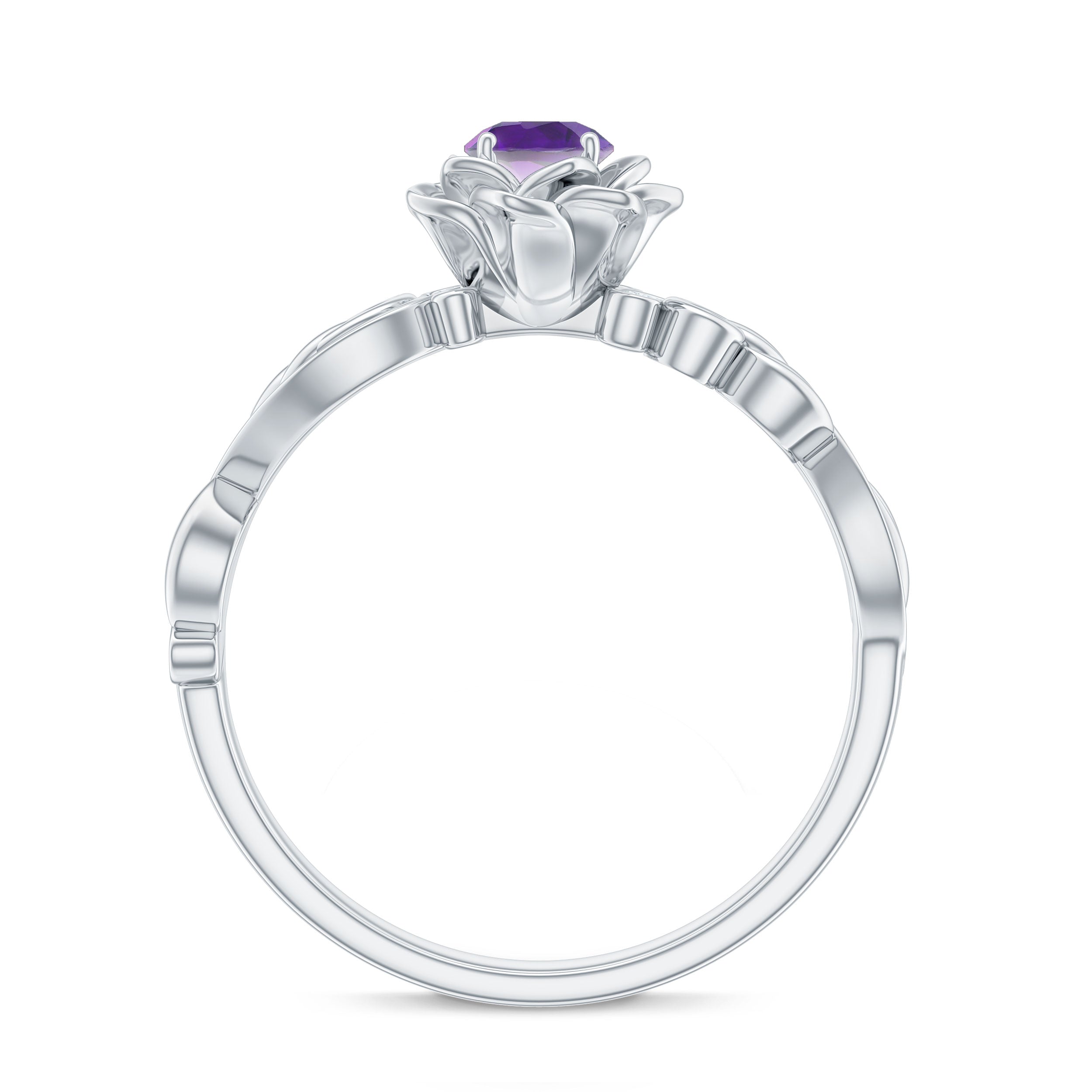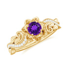 It is a Floral Inspired Engagement Ring for Women, adorned in Solid Gold and features a Round Shape Amethyst embellished in Prong Setting with Round Shape Diamond embellished in Pave Setting.