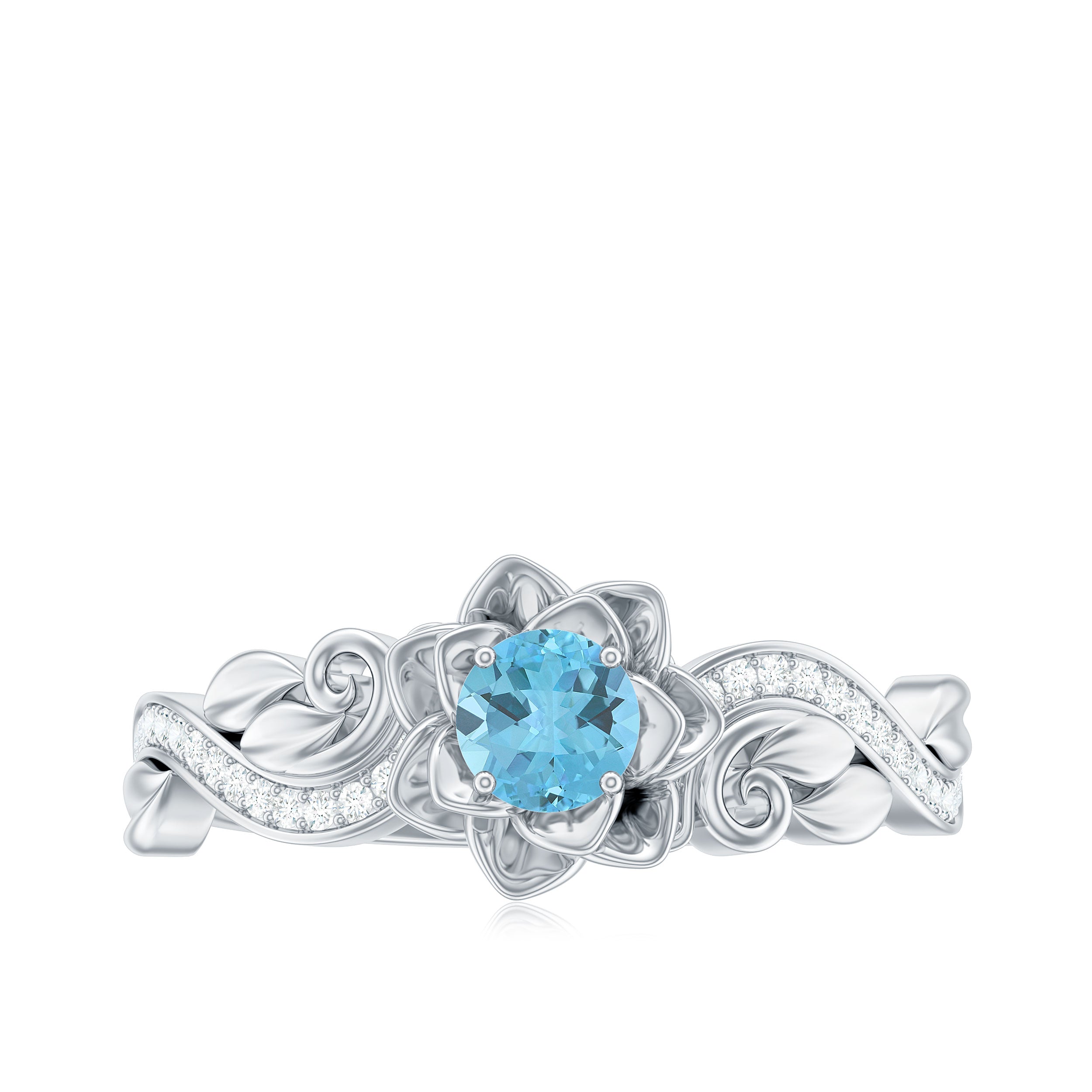 It is a Floral Inspired Engagement Ring for Women, adorned in Solid Gold and features a Round Shape Sky Blue Topaz embellished in Prong Setting with Round Shape Diamond embellished in Pave Setting.