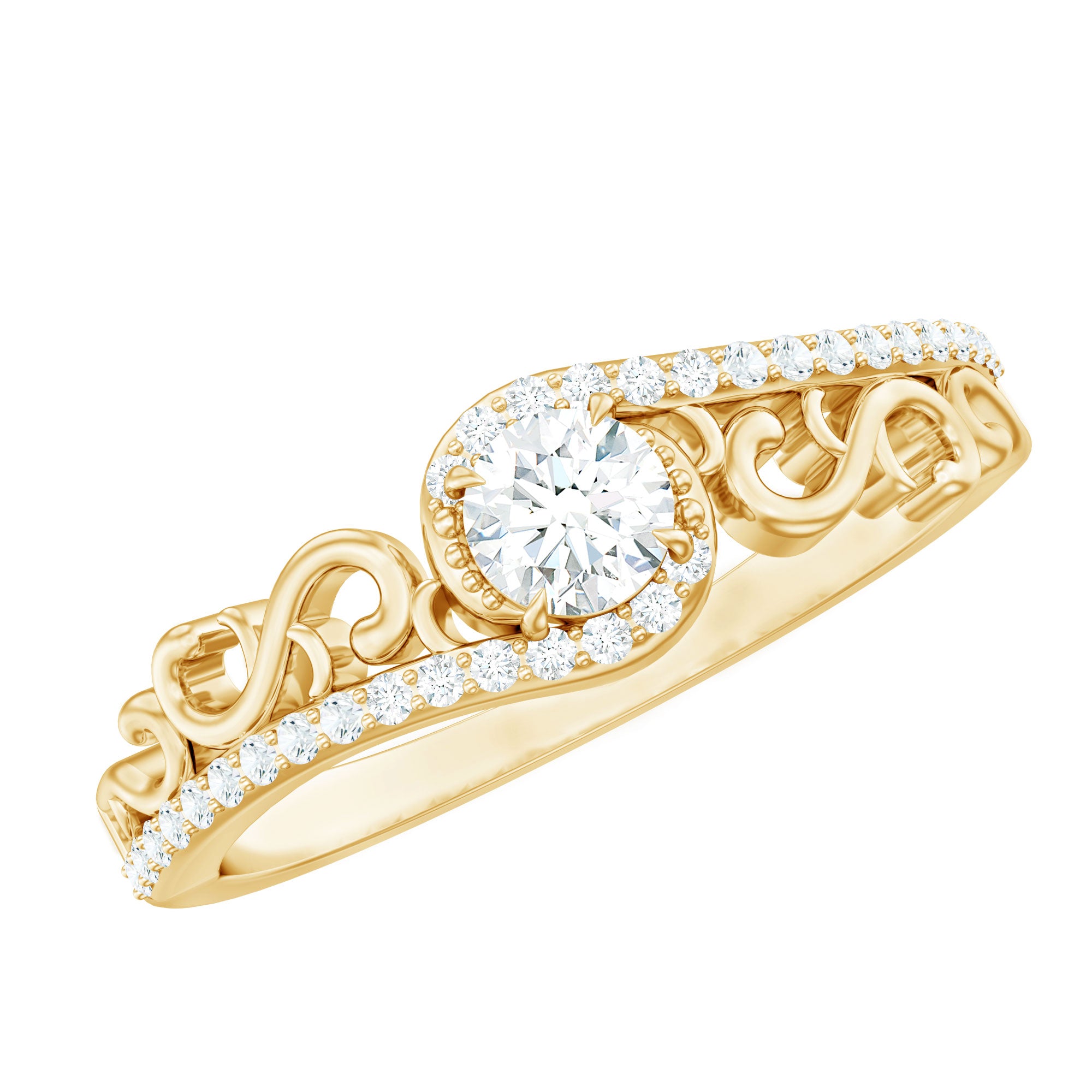 Ensuring a romantic proposal, our Diamond Engagement Ring embedded with Round Cut Diamond in the center in Claw Setting and gracefully bypassing shank glistens with smaller round accent diamonds. Crafted in Gold, this Engagement Ring is something no woman can resist.