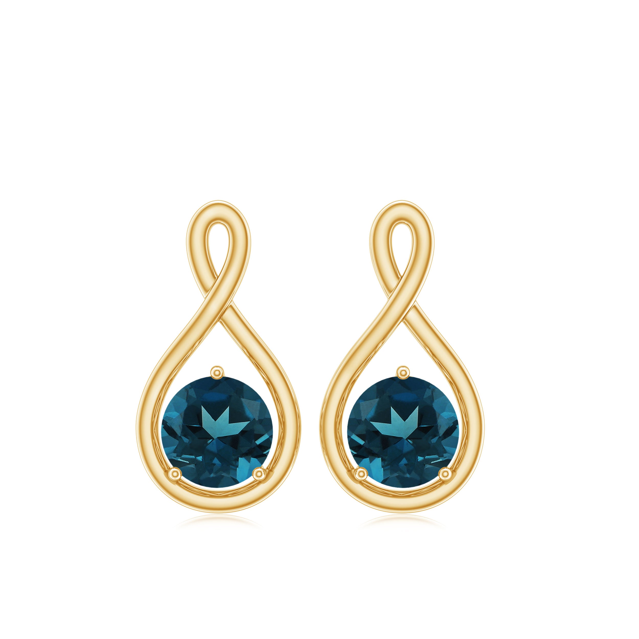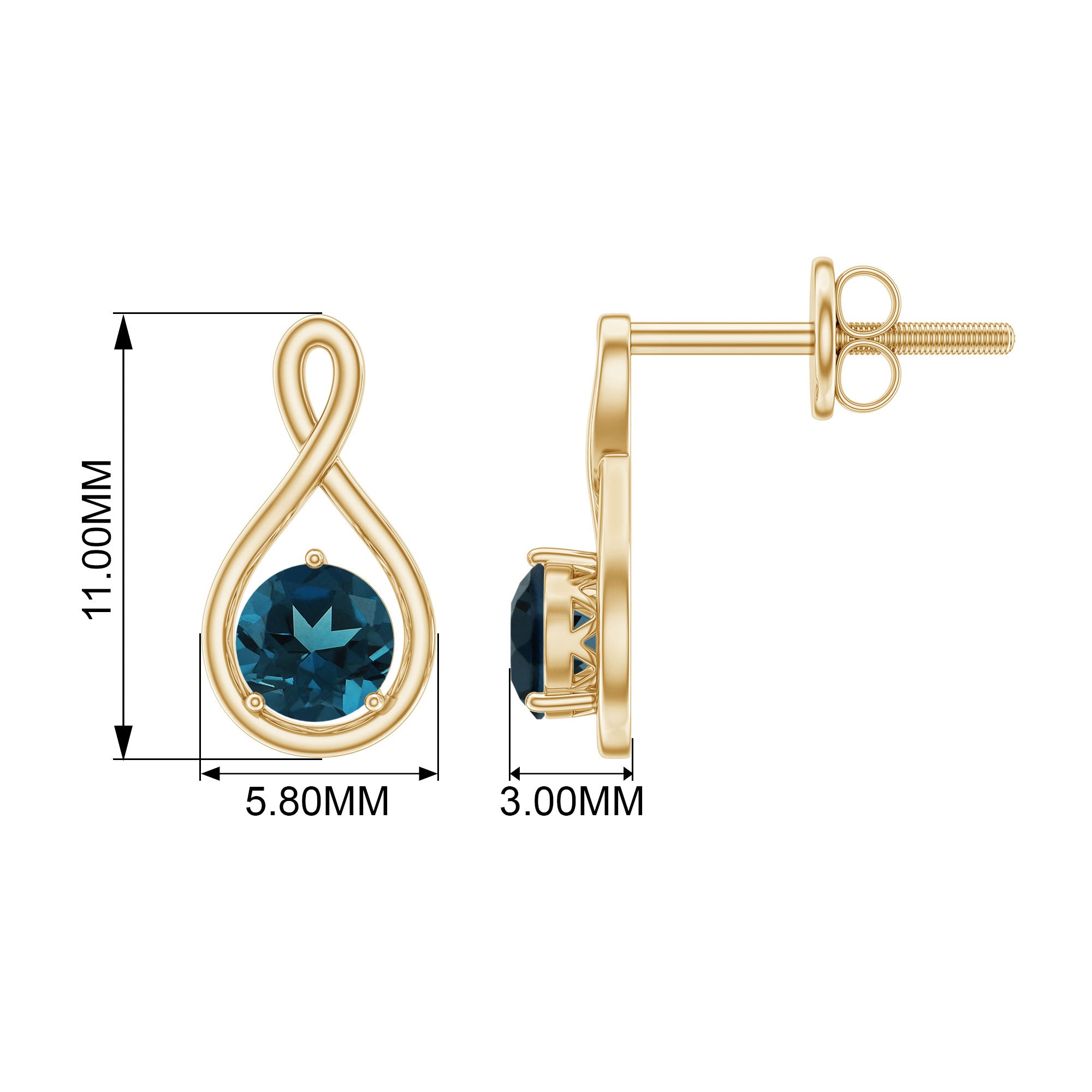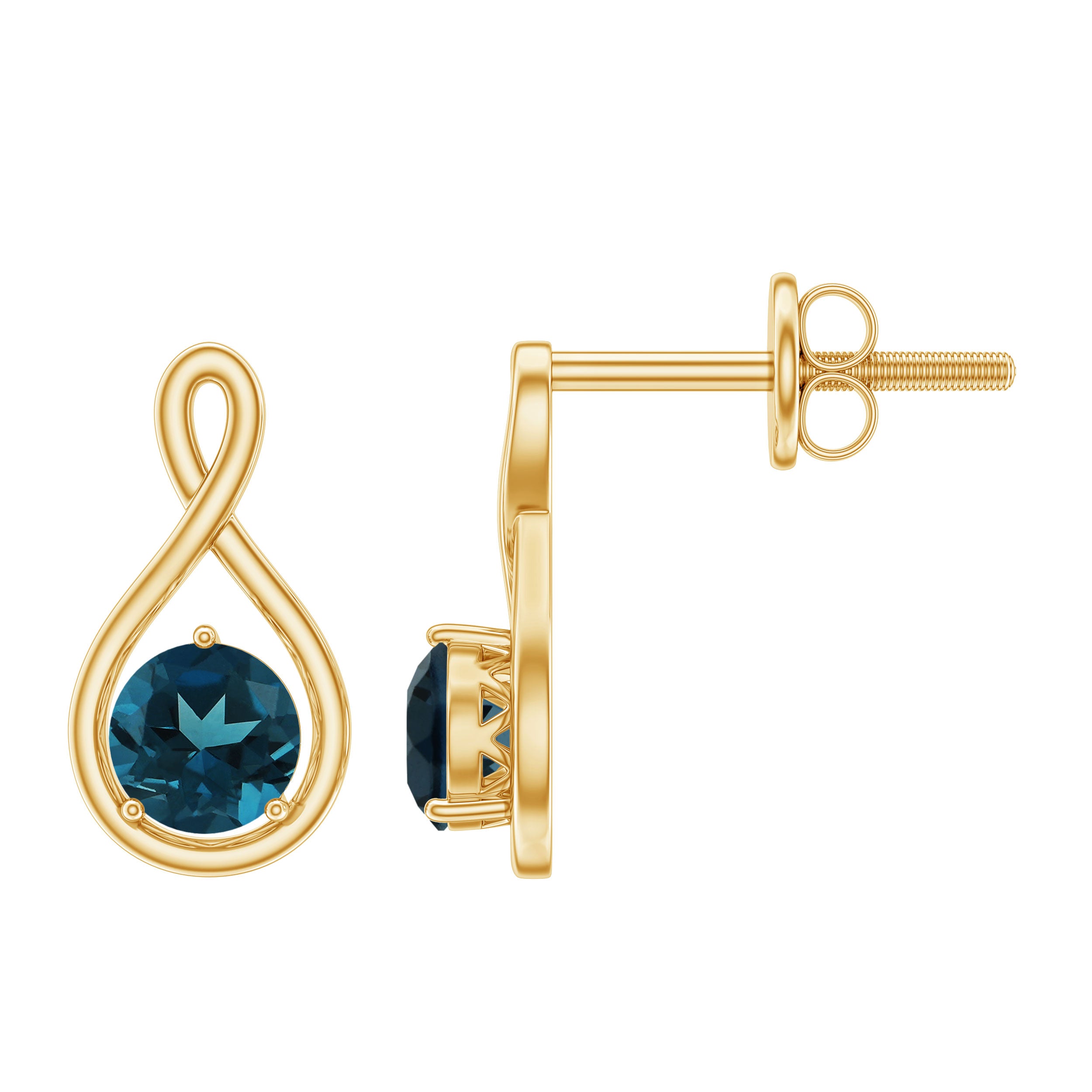 These Infinity Pattern Stud Earrings are embellished with Round Cut London Blue Topaz Gemstone is set as Solitaire in a Prong Setting, crafted in a Solid Gold.