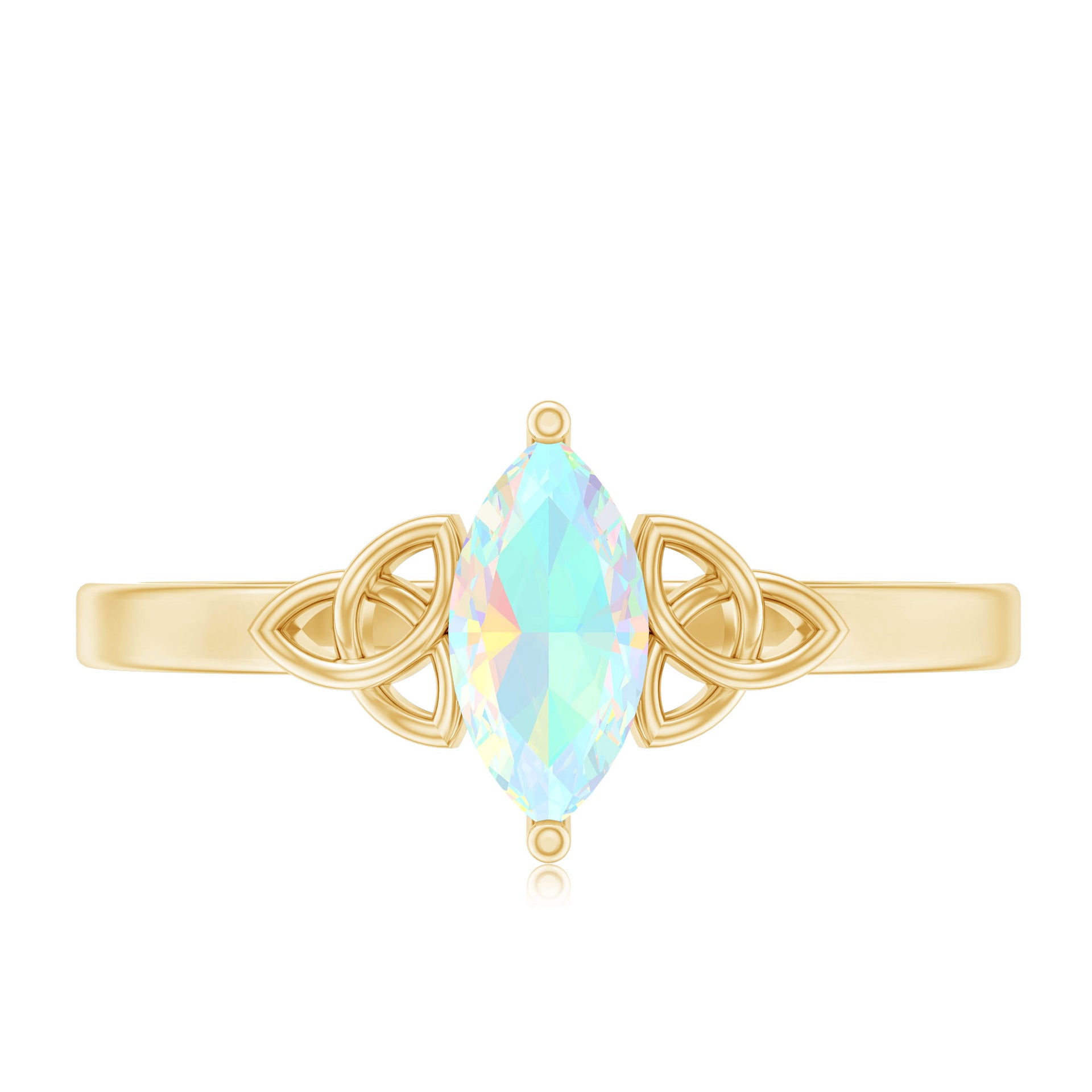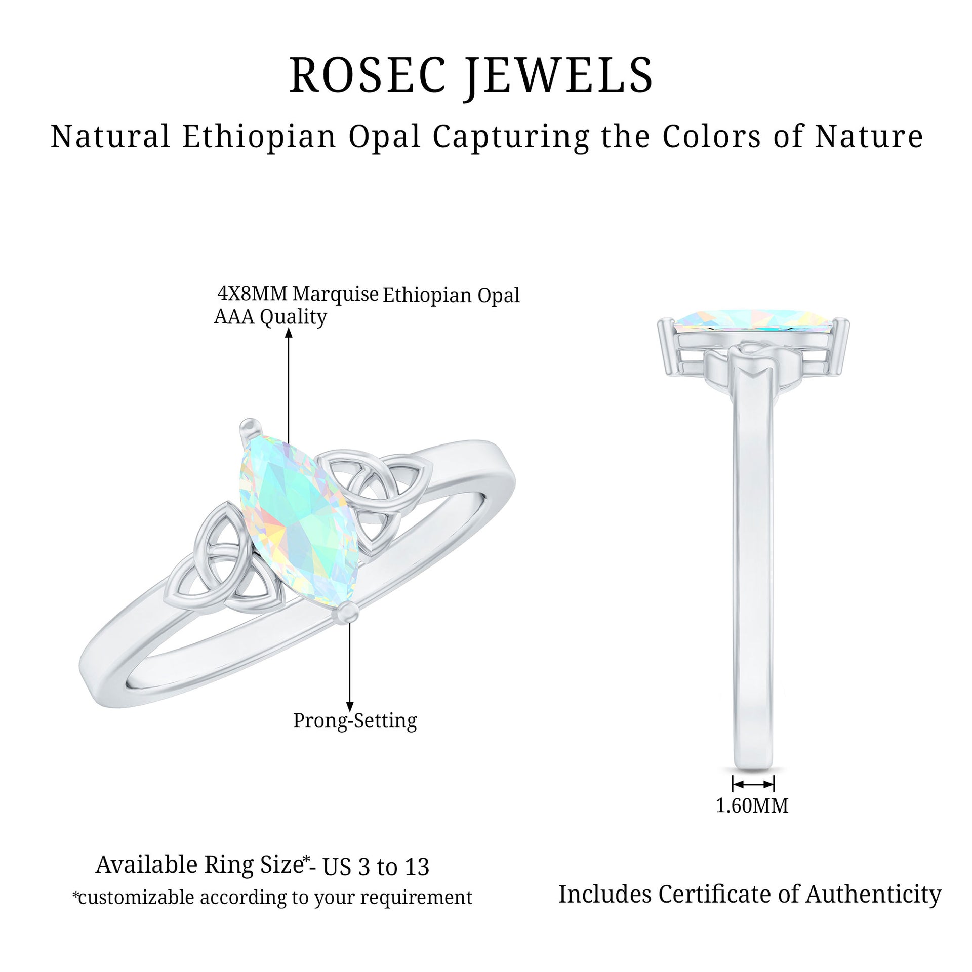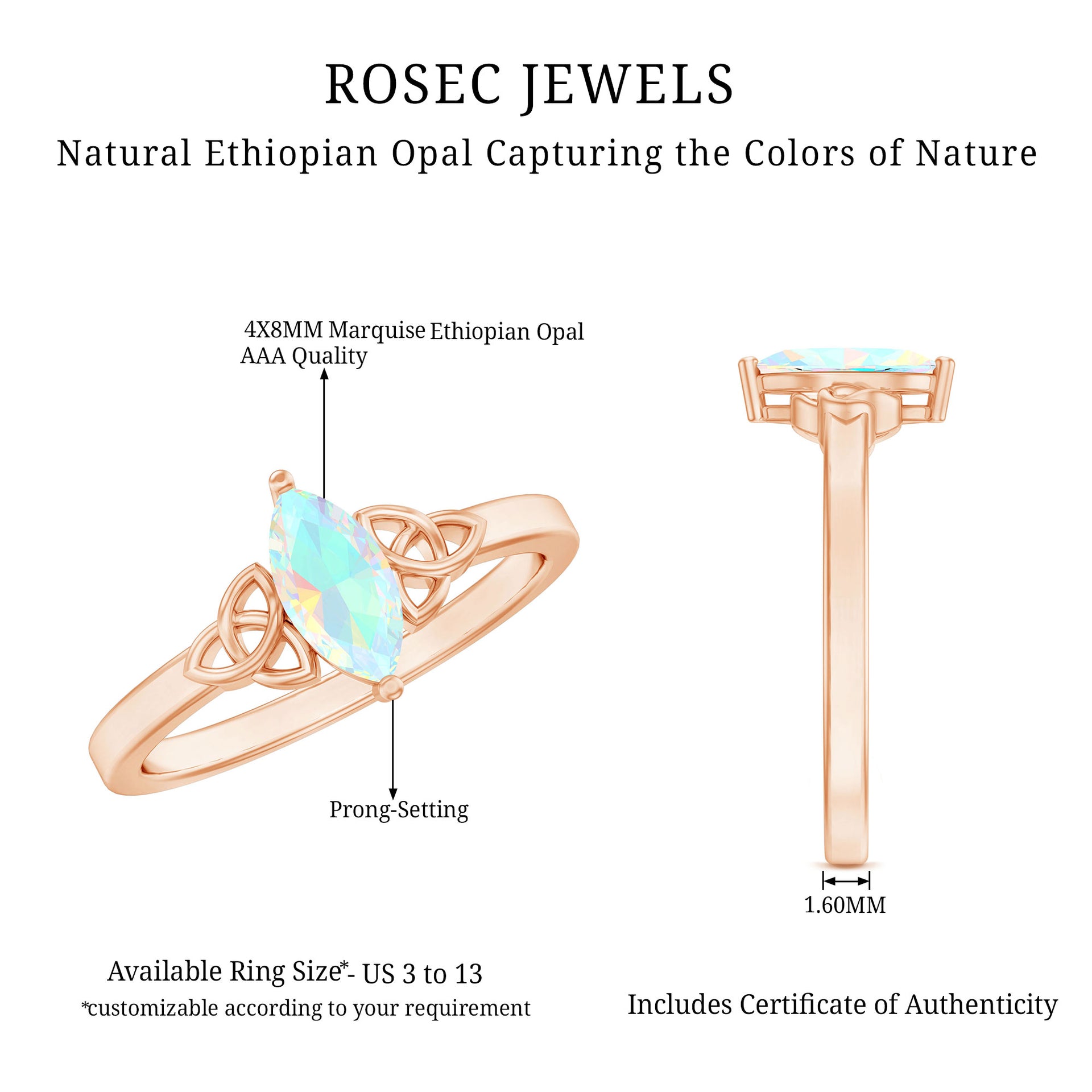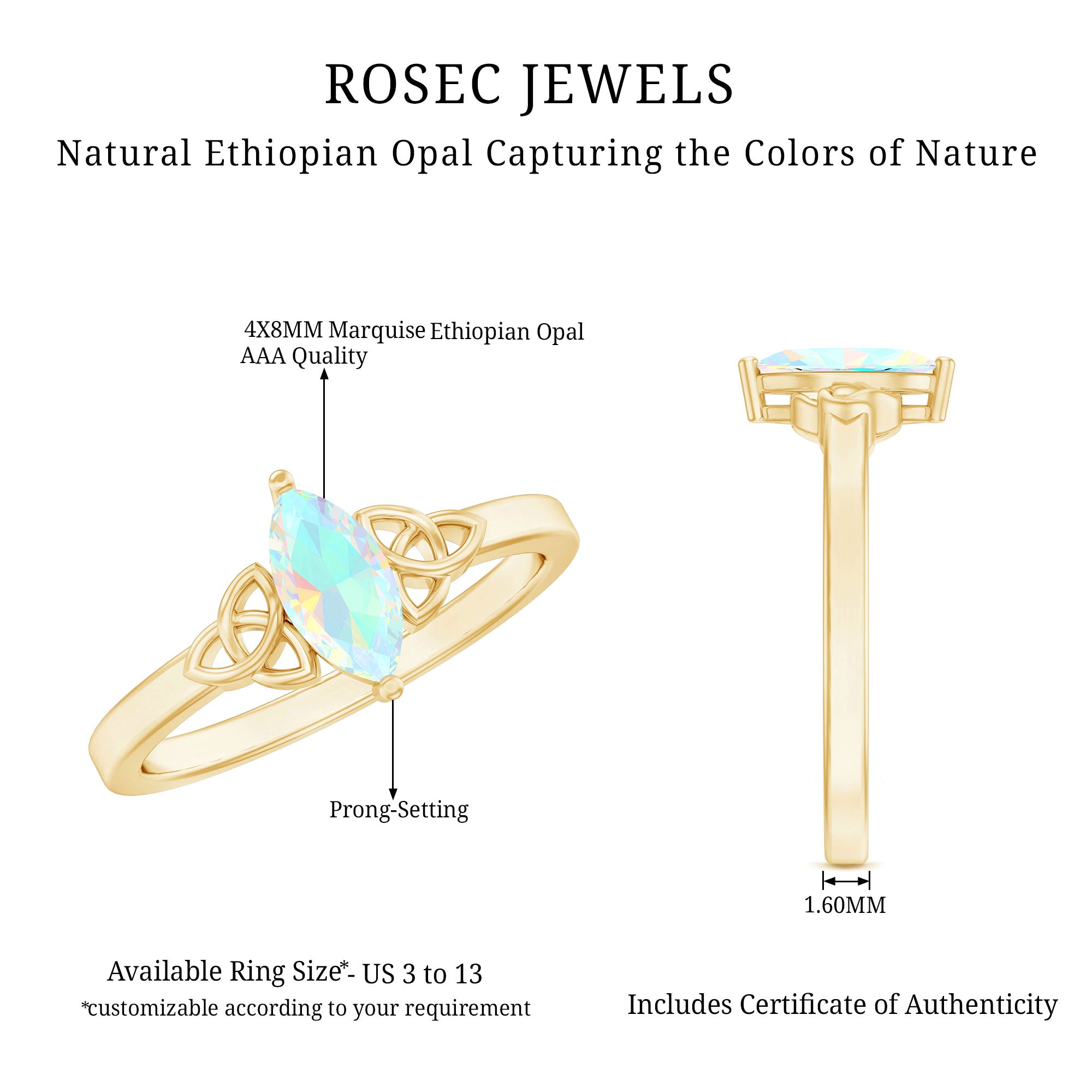 Add a touch of mystique and meaning to your jewelry collection with this Ethiopian Opal Ring, a captivating tribute to love, connection and individuality. Featuring a 4X8 mm Marquise Shape Ethiopian Opal set in Prong Setting, this Opal Solitaire Ring dazzles with a rainbow of hues, shifting beautifully with every flicker of light. The gemstone is gracefully set within an intricate Celtic Knot design on either side, symbolizing eternity, unity and the powerful bonds that never break. With its elongated shape and ethereal glow, the opal becomes the centerpiece of a design that feels refreshingly modern. Whether you are gifting it as a promise, a birthday treasure or a meaningful keepsake, this Marquise Opal Ring speaks to the soul. Thoughtfully crafted and full of symbolism, this Celtic Knot Ring is available in a variety of ring sizes to ensure the perfect fit. Arriving in an elegant jewelry box, this October Birthstone Ring is ready to wow from the moment it is unwrapped.