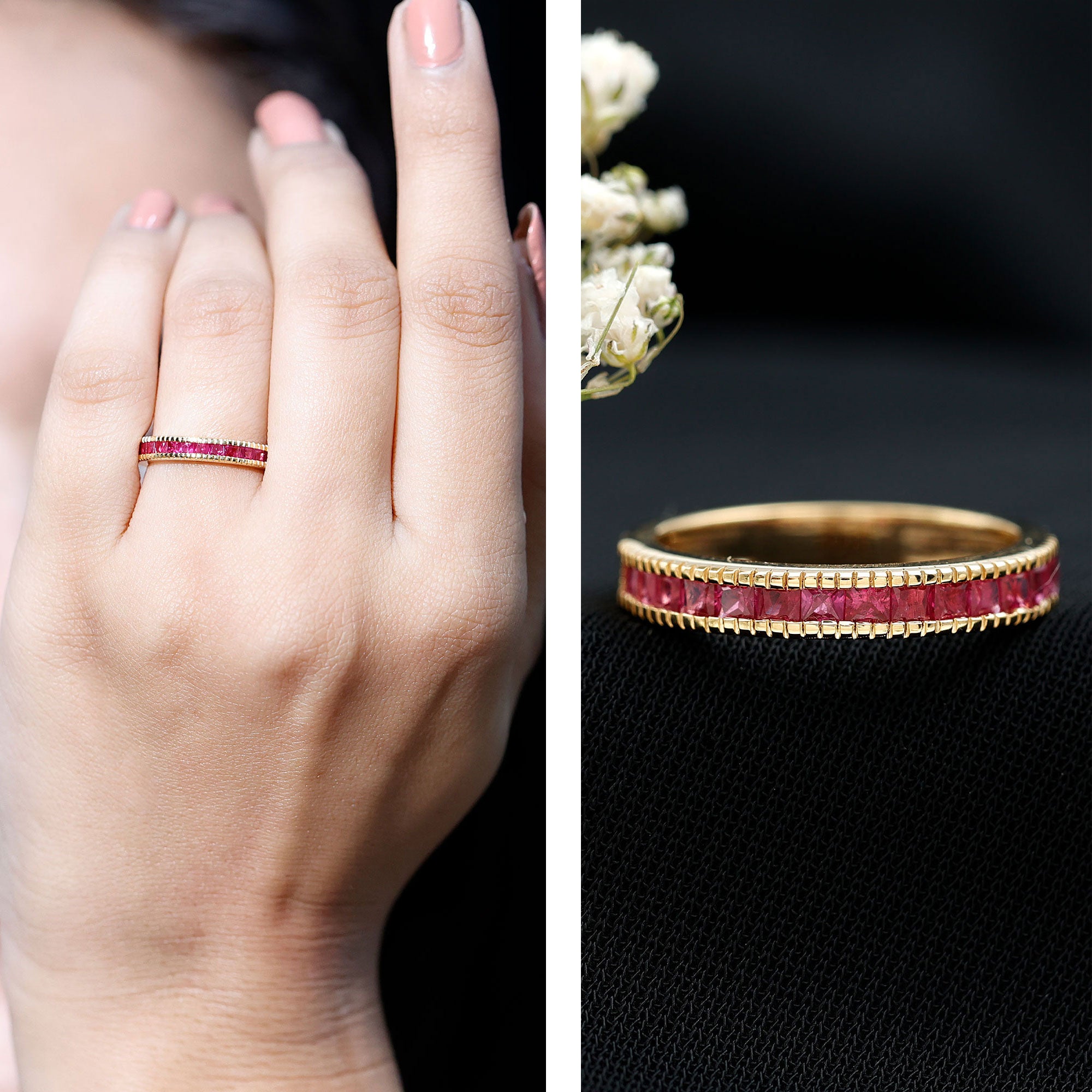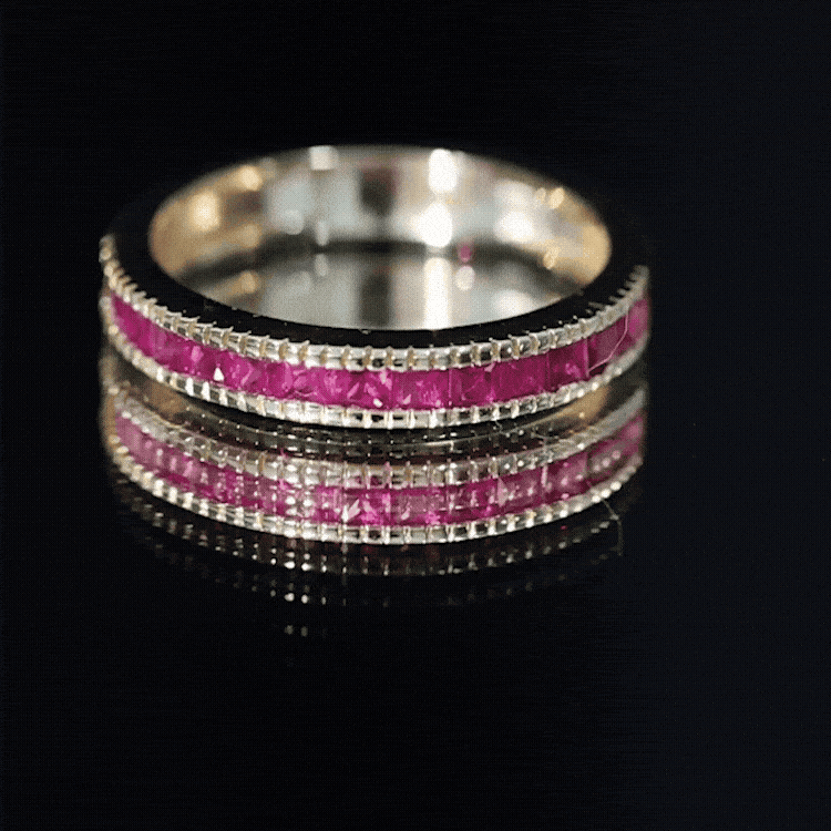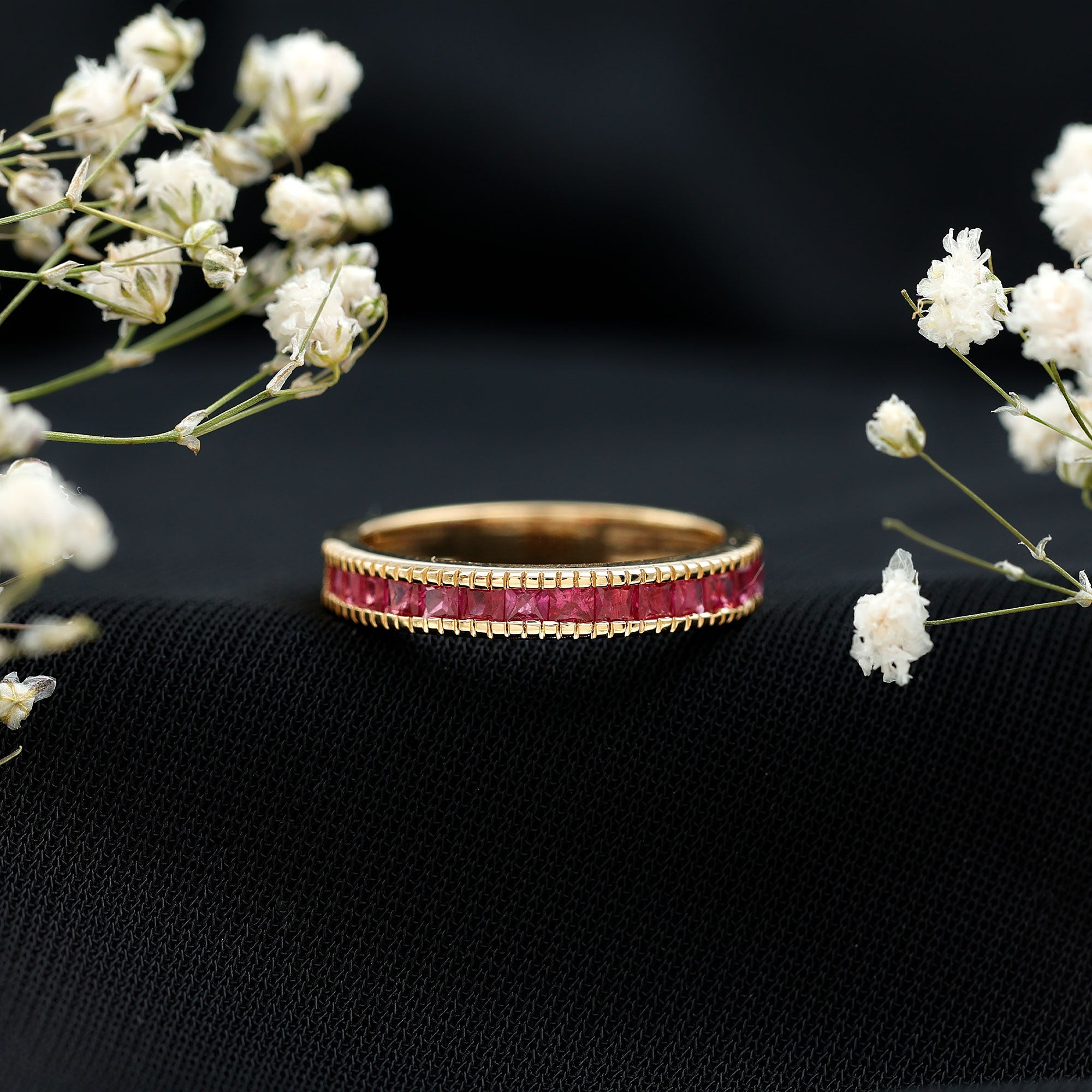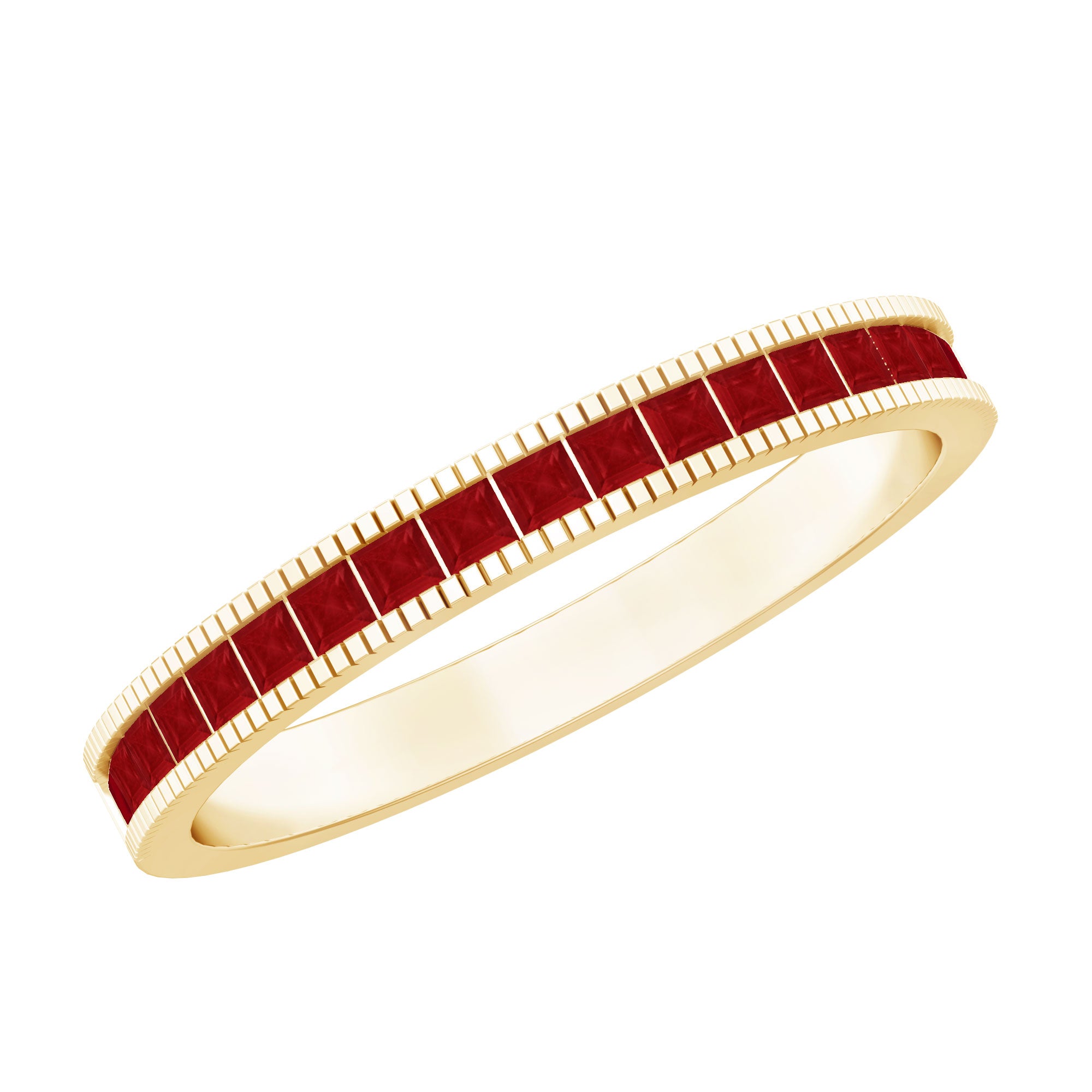 This classic Half Eternity Ring is adorned with Princess Cut Ruby in Channel Setting. This Half Eternity Ring with Milgrain Detailing will be a charming Birthday gift for a woman that will make her day very secial.