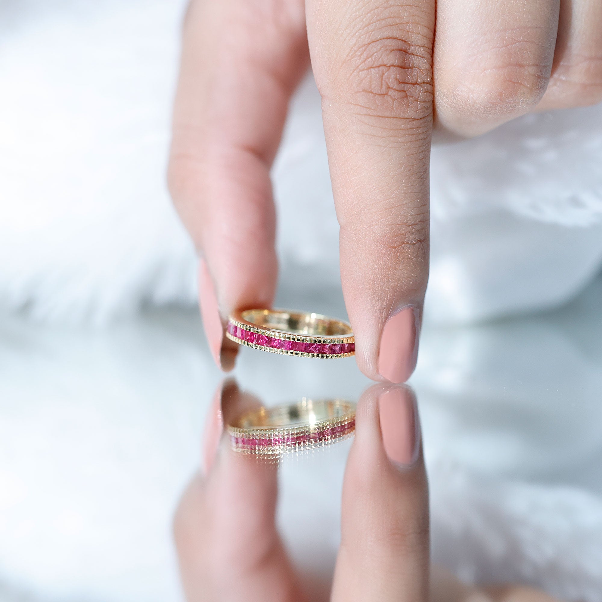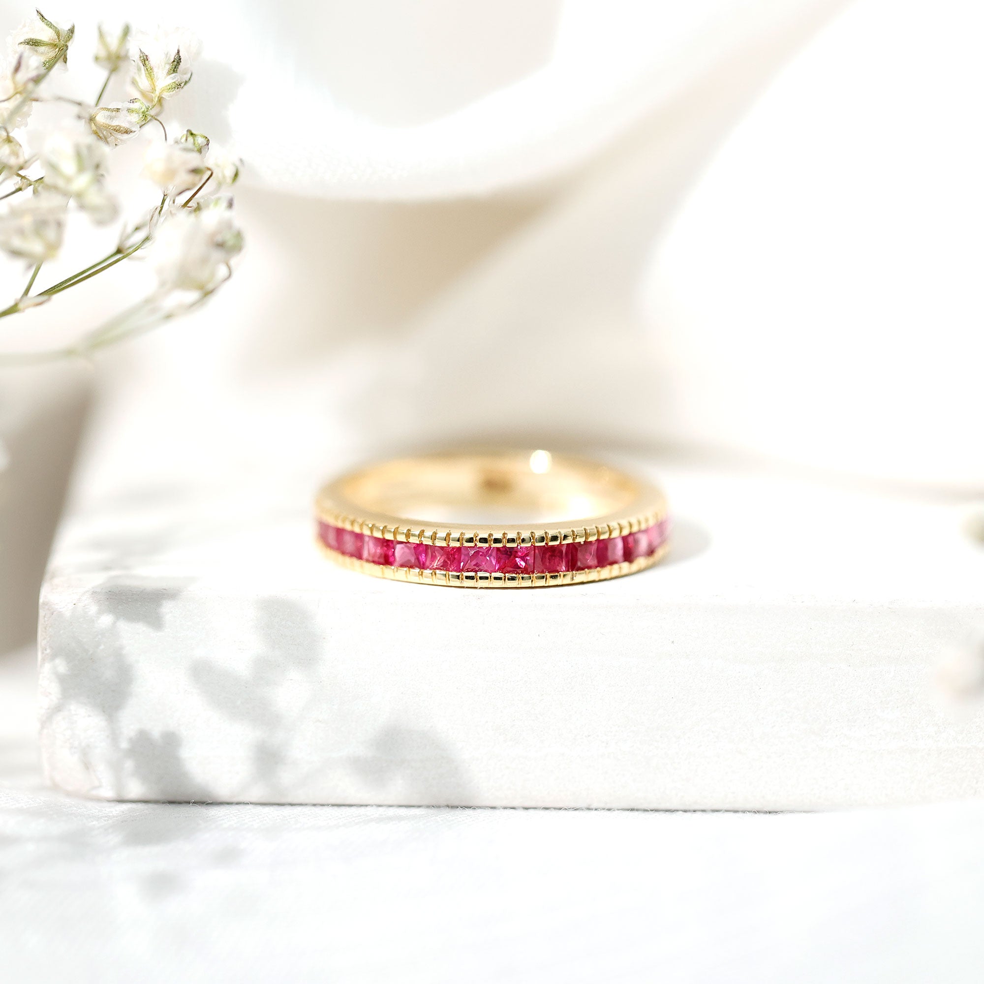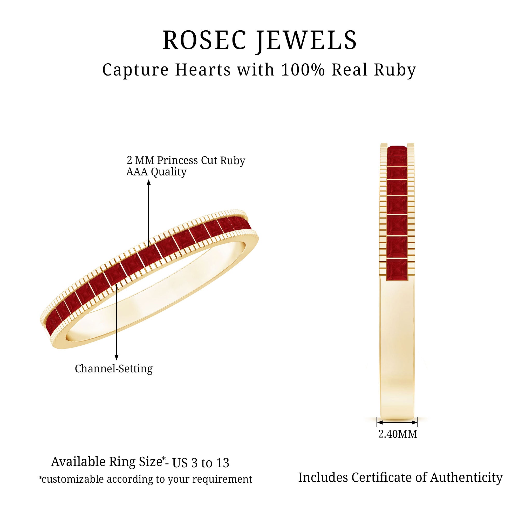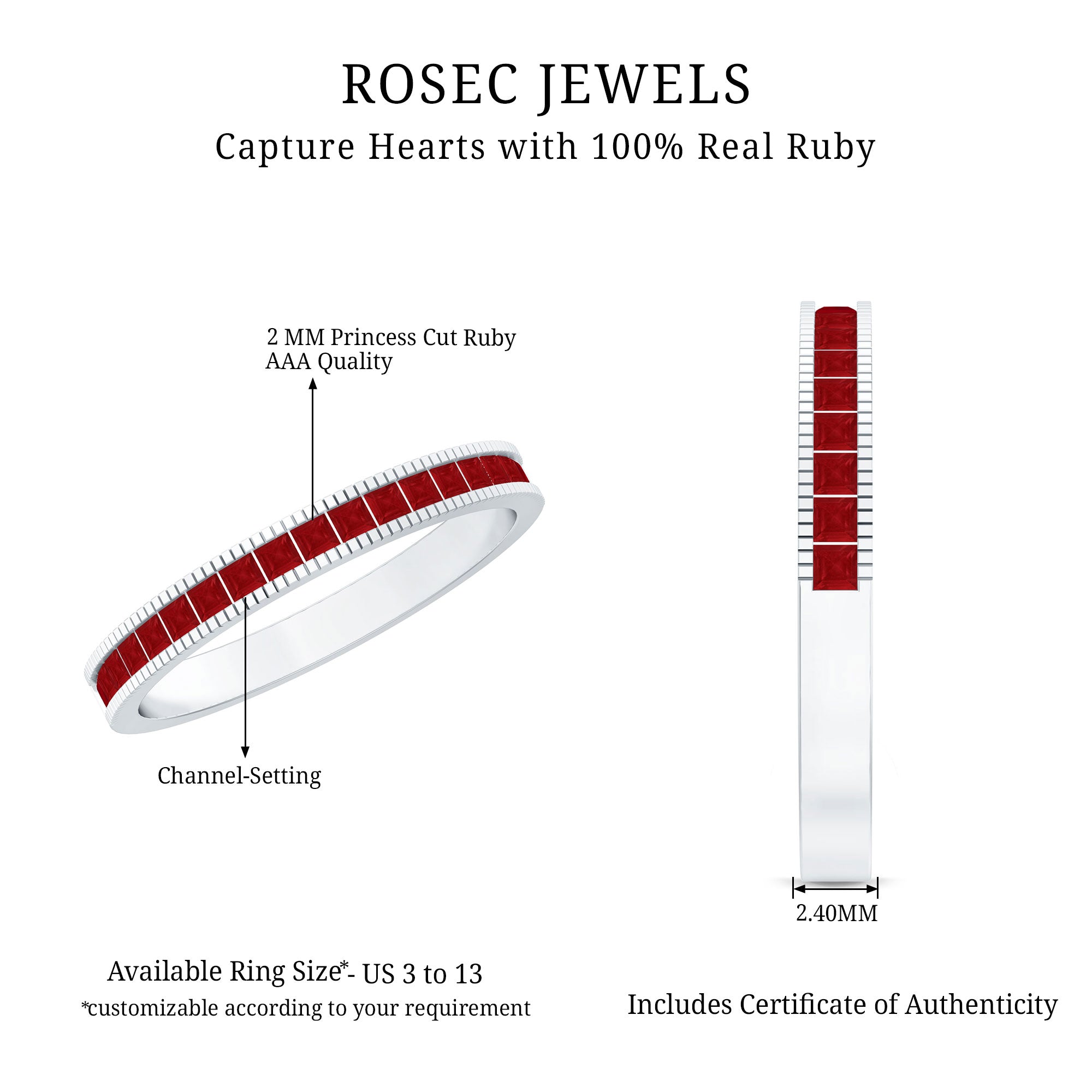 This classic Half Eternity Ring is adorned with Princess Cut Ruby in Channel Setting. This Half Eternity Ring with Milgrain Detailing will be a charming Birthday gift for a woman that will make her day very secial.