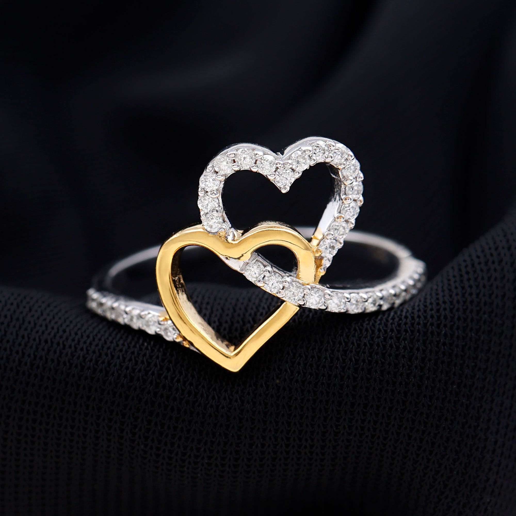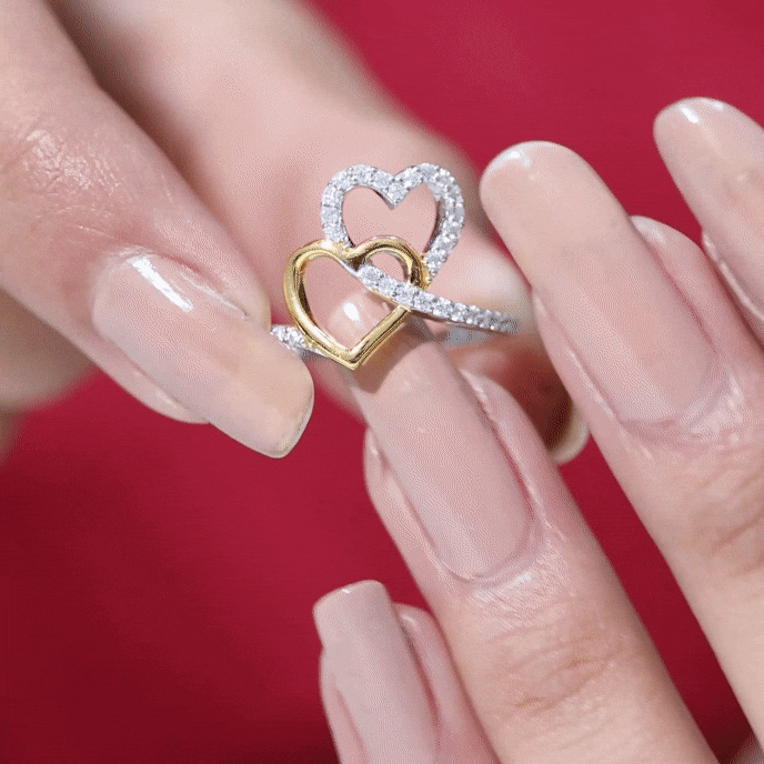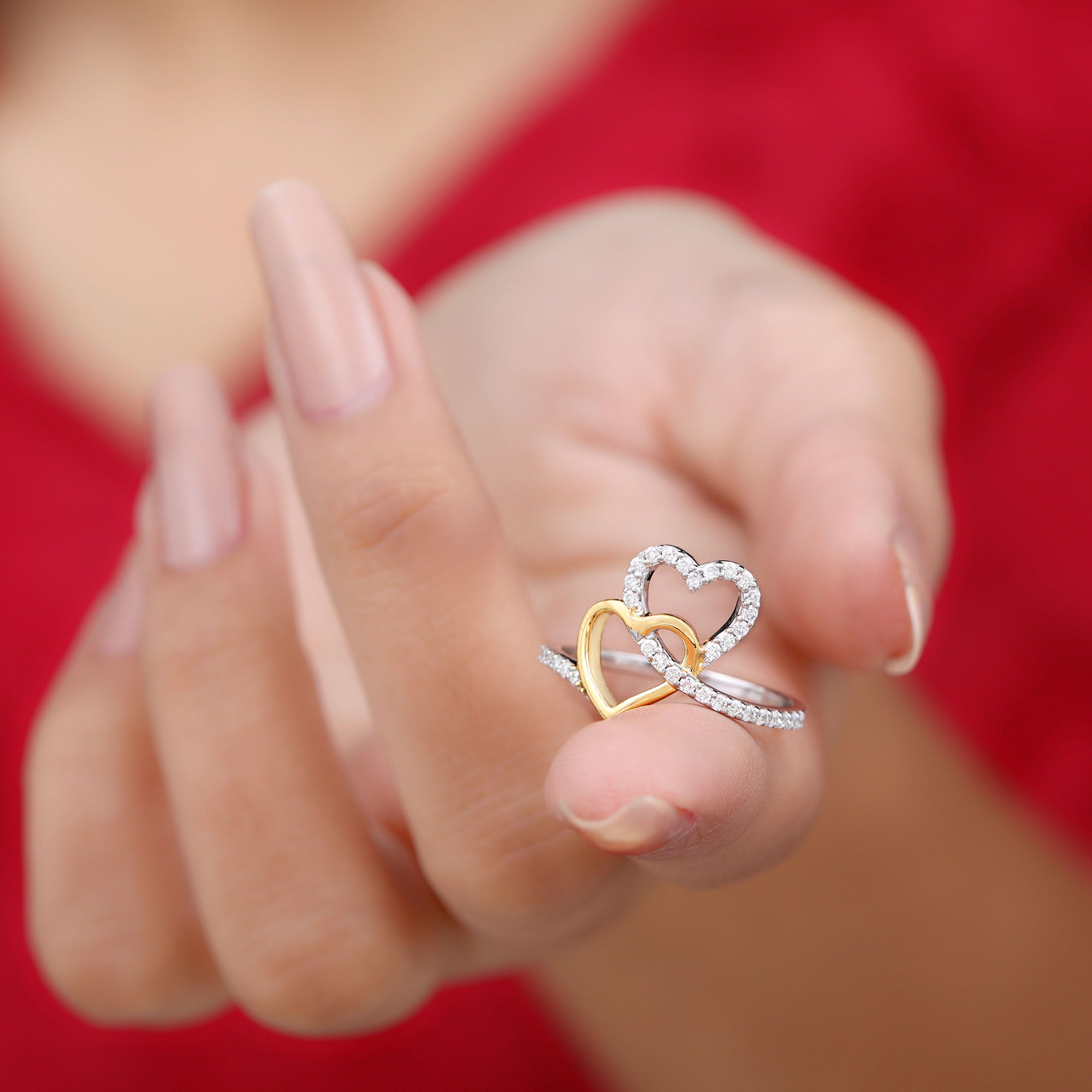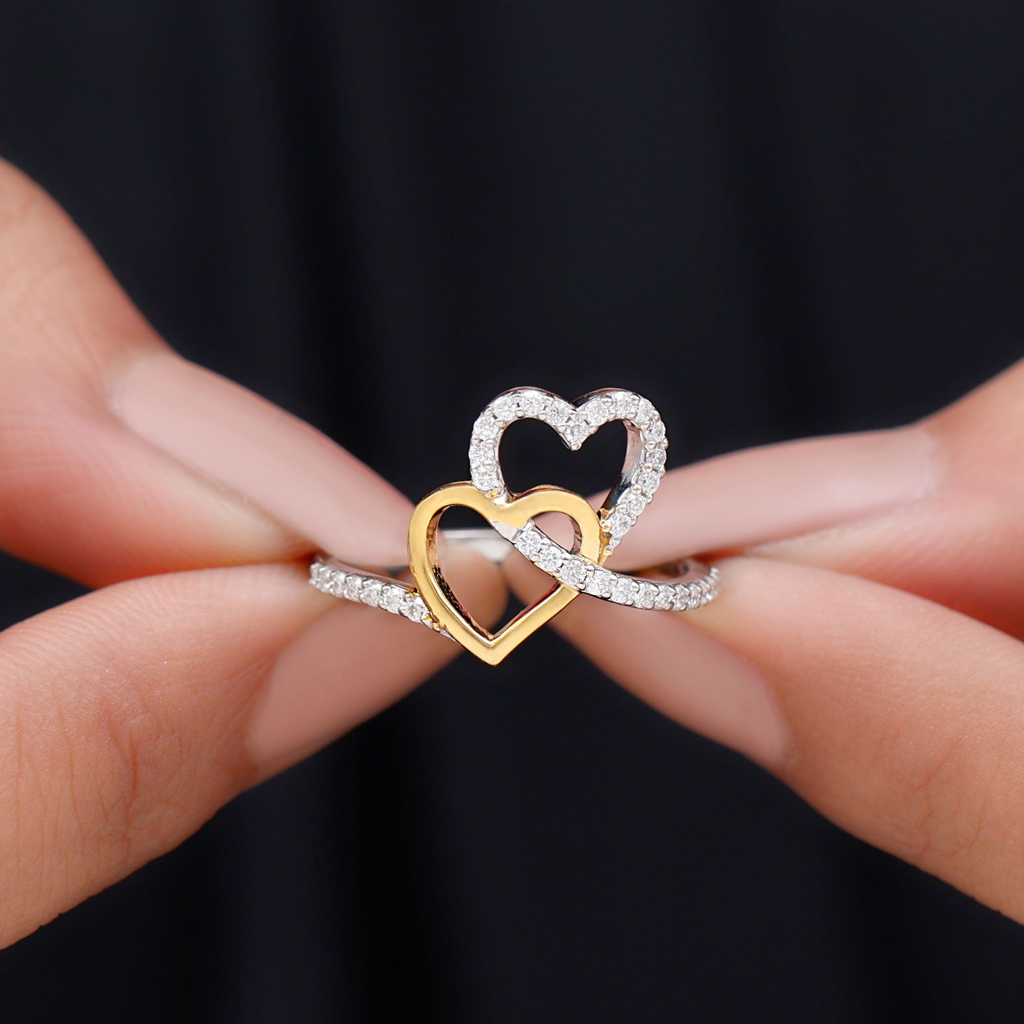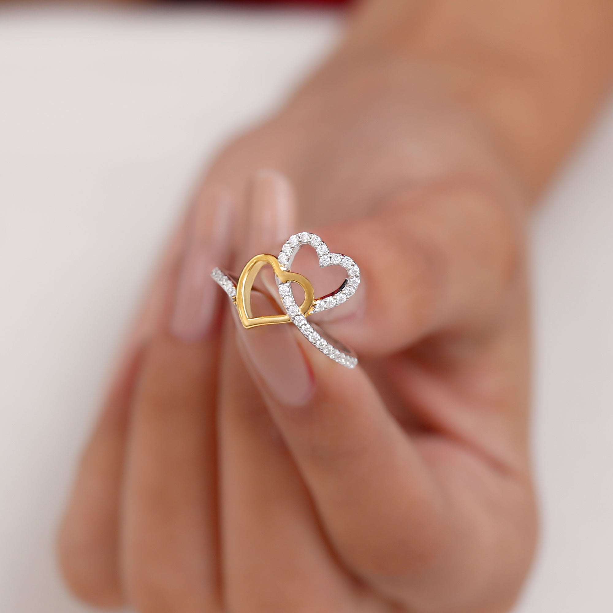 Impress her with this two-tone interlocking heart ring. This ring features a moissanite heart and a solid gold heart, symbolizing the connection between two souls.