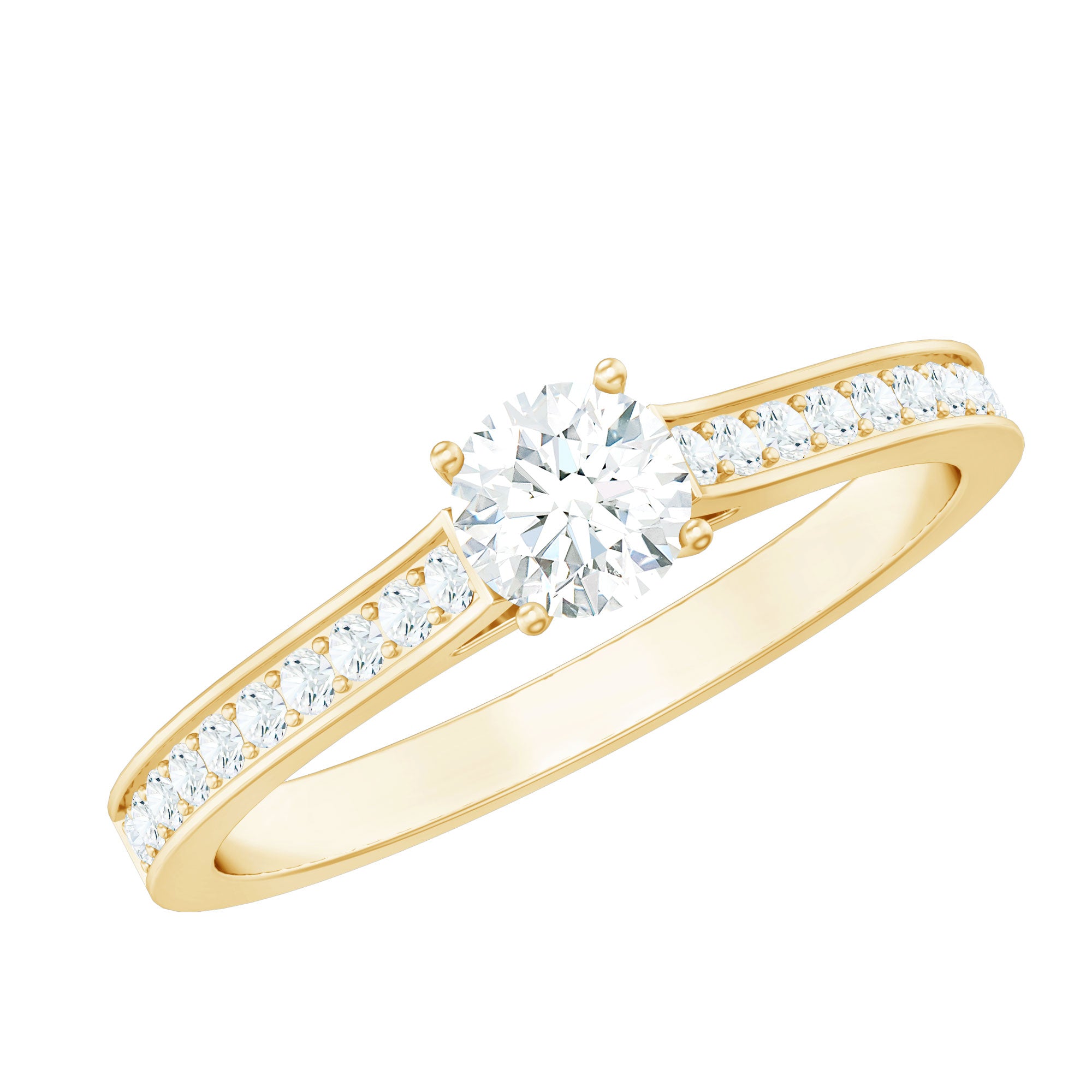 This scintillating Engagement Ring features Round Cut Diamond, held in prong setting and Round Diamond held in Side Stones to create a sumptuous look. This Diamond Engagement Ring is an enchanting piece of fine jewelry, crafted in gold for its luster. Delicate Pure Diamond Ring the first choice of every lady for her special day.