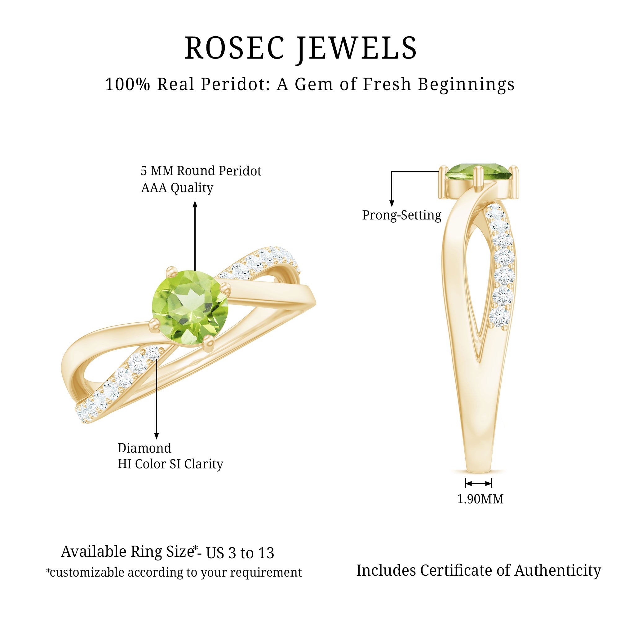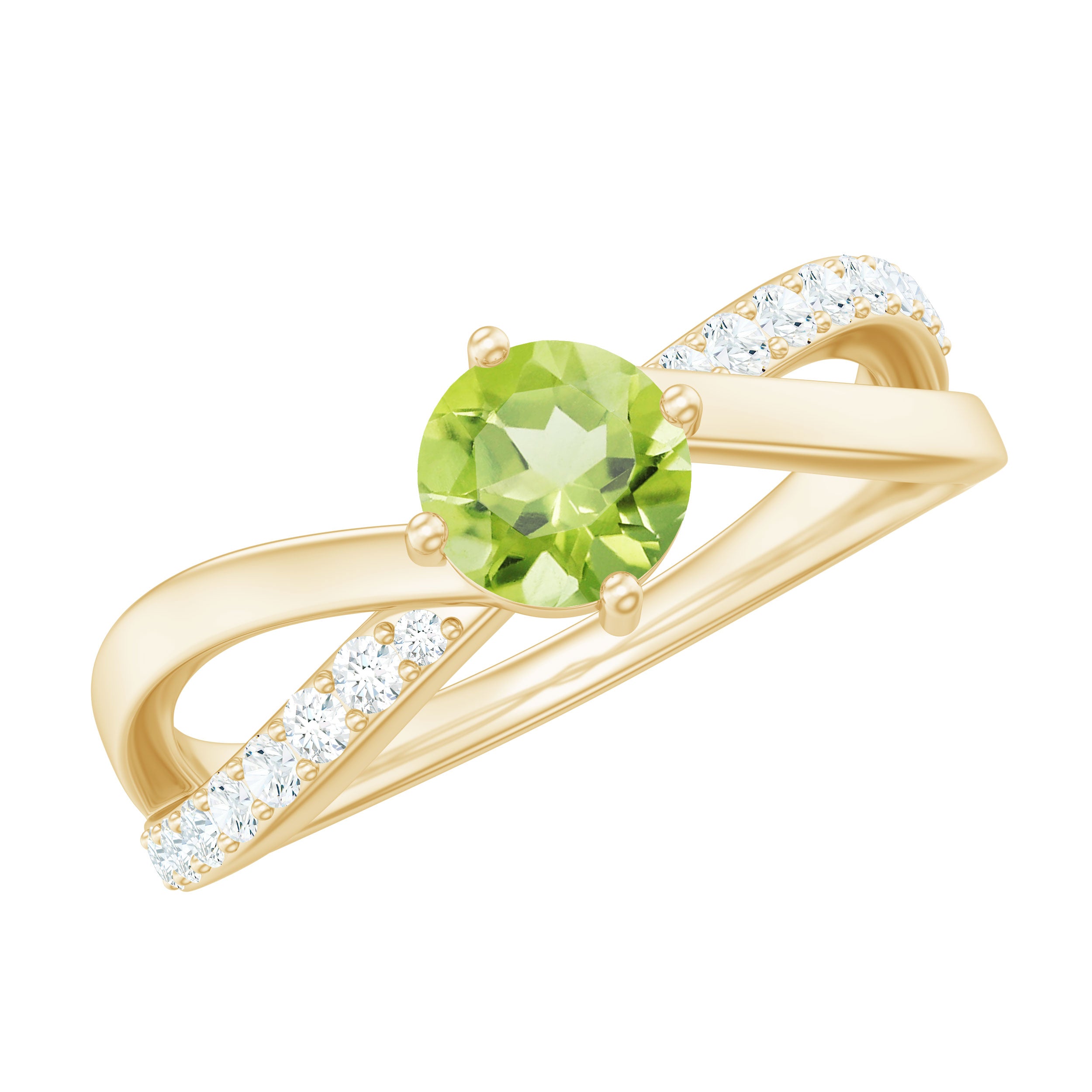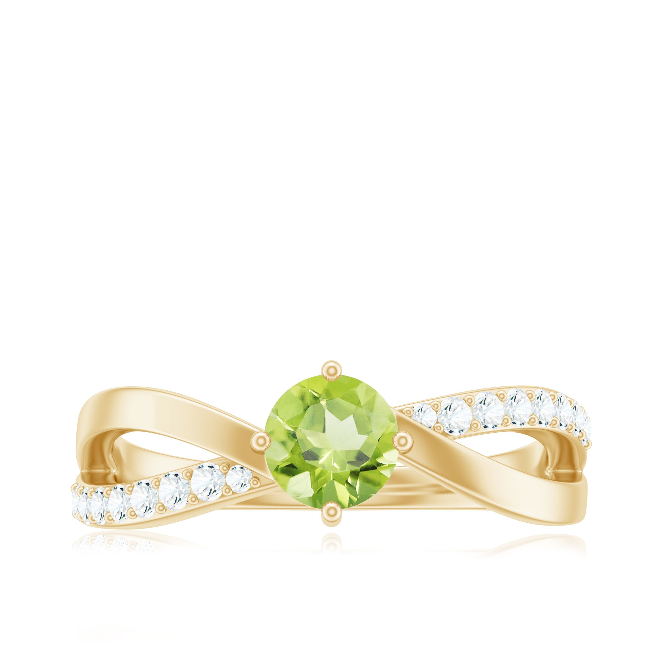 Enhance your love with this Solitaire Ring is adorned with Round Shape Peridot set as a solitaire in a prong setting and Round Shape Diamond in a prong setting. This Gold Infinity Ring is available in solid gold.
