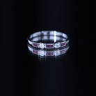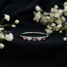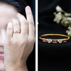 This Stackable Ring is adorned with Baguette Cut Pink Tourmaline stones and Round Shaped moissanite stones in an alternating pattern to create a trendy appearance. The stones are set in Bezel Setting over Solid Gold to make this ring an opulent choice for your everyday style.