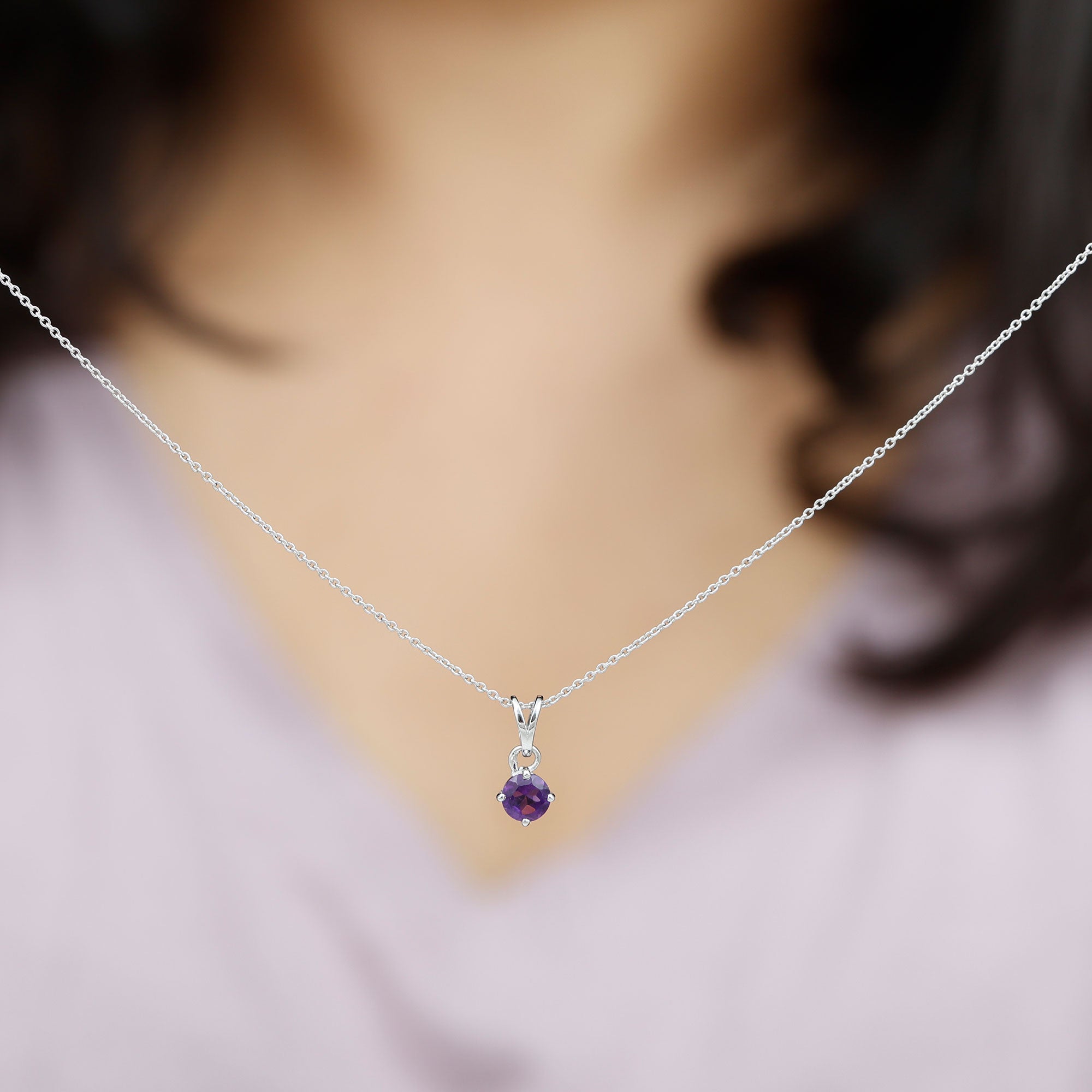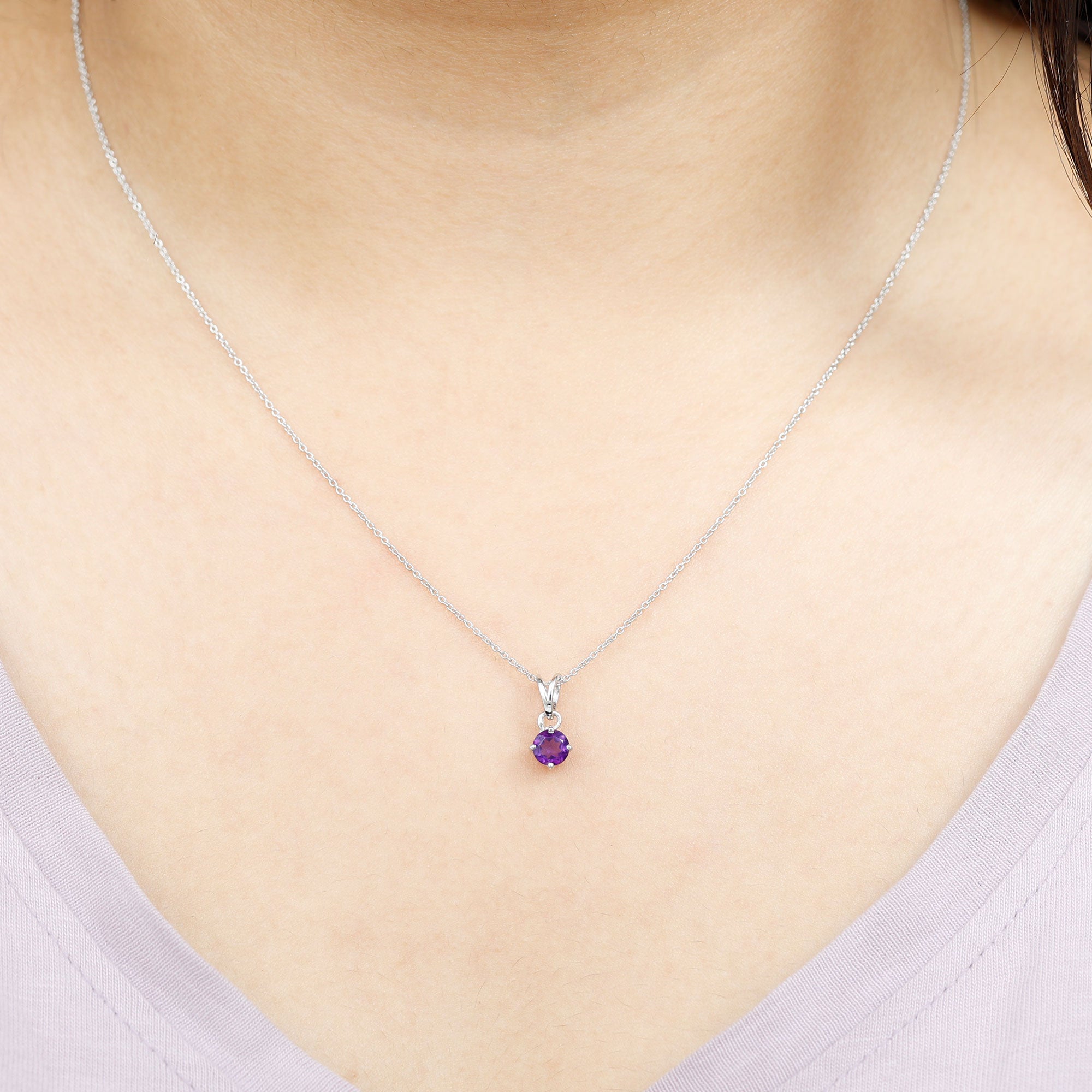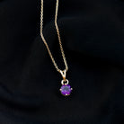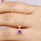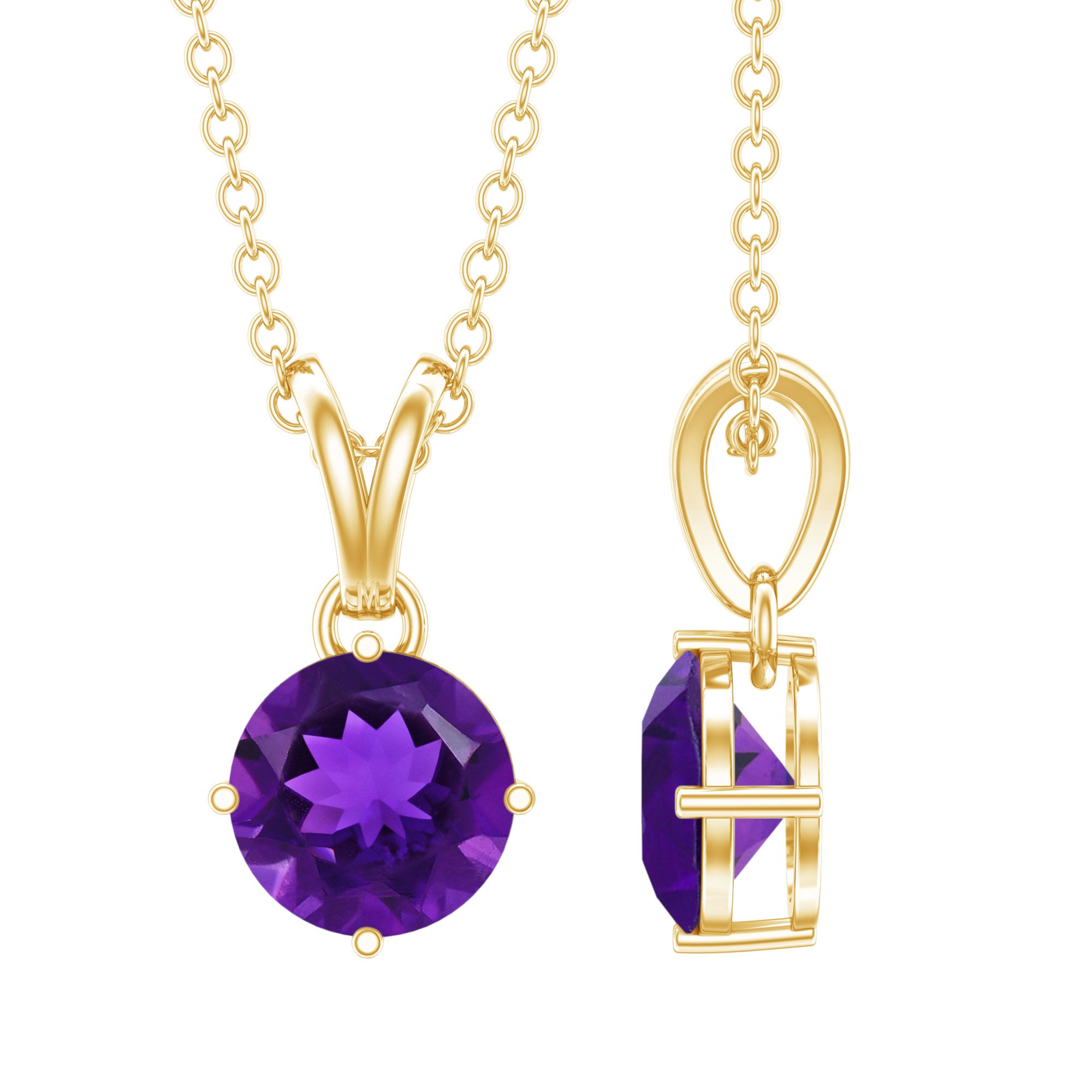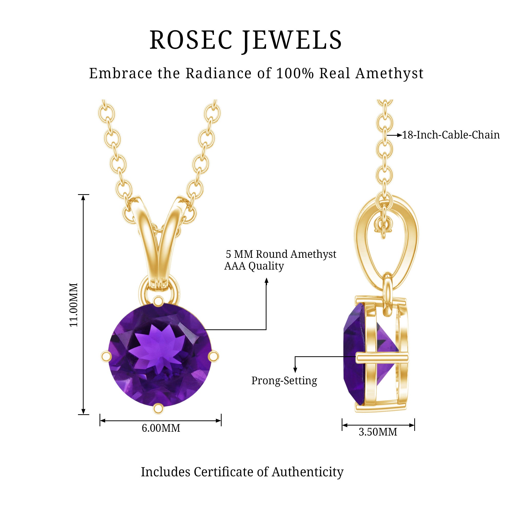 Be Dazzle with this Beautiful Amethyst Solitaire Pendant necklace and get Admiration. The Pendant is embellished with 5 MM Round Shape Amethyst Solitaire as single stone in 4 Prong Diagonal Setting. Solid Gold encasing around Gemstone and Rabbit Ear Bail make this Pendant more Elegant.