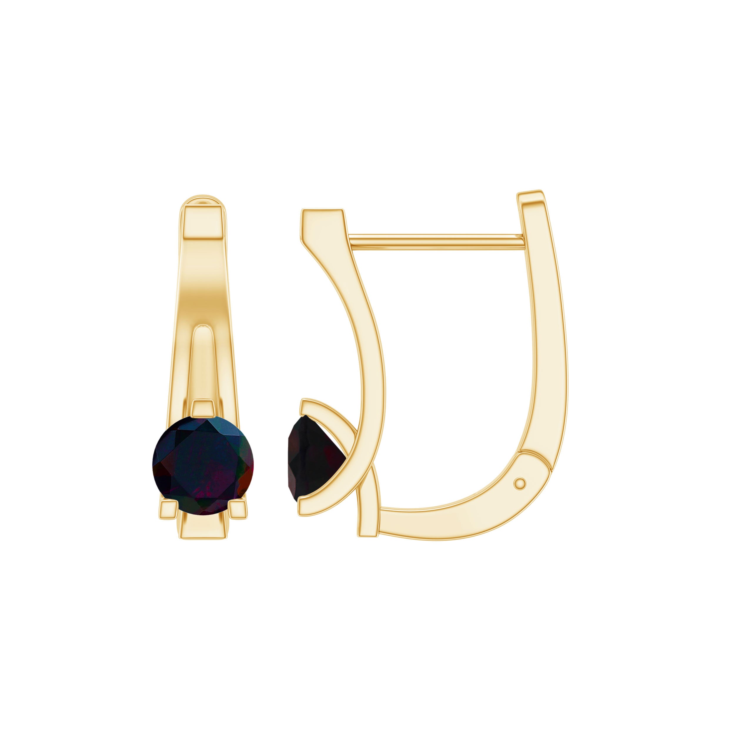 Surprise your special someone with these charming J hoop earrings, featuring a solitary round-cut Black opal gemstone set in a three-peg head setting and a solid gold lever-back finding. These Black Opal earrings are both elegant and simple, making them the perfect gift.