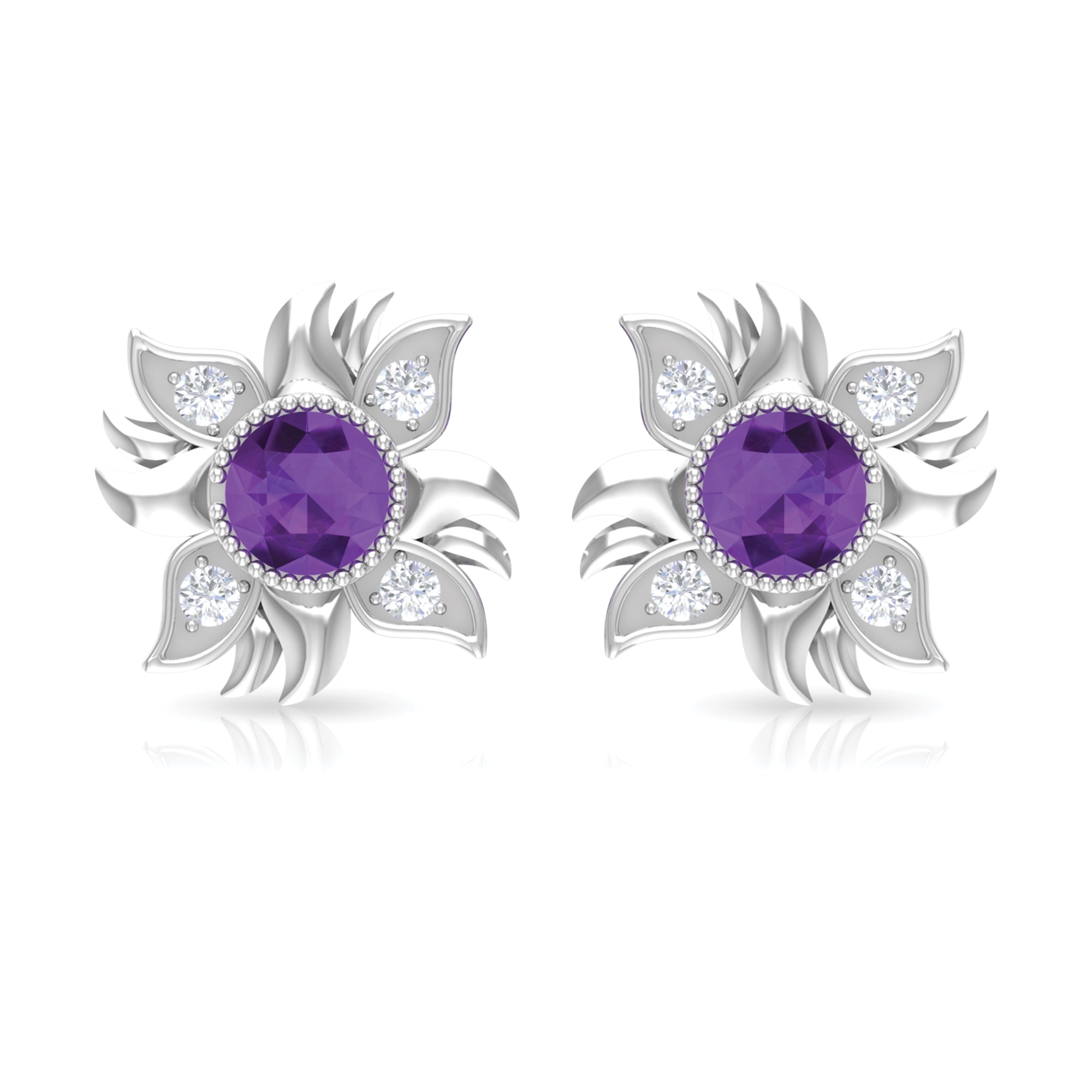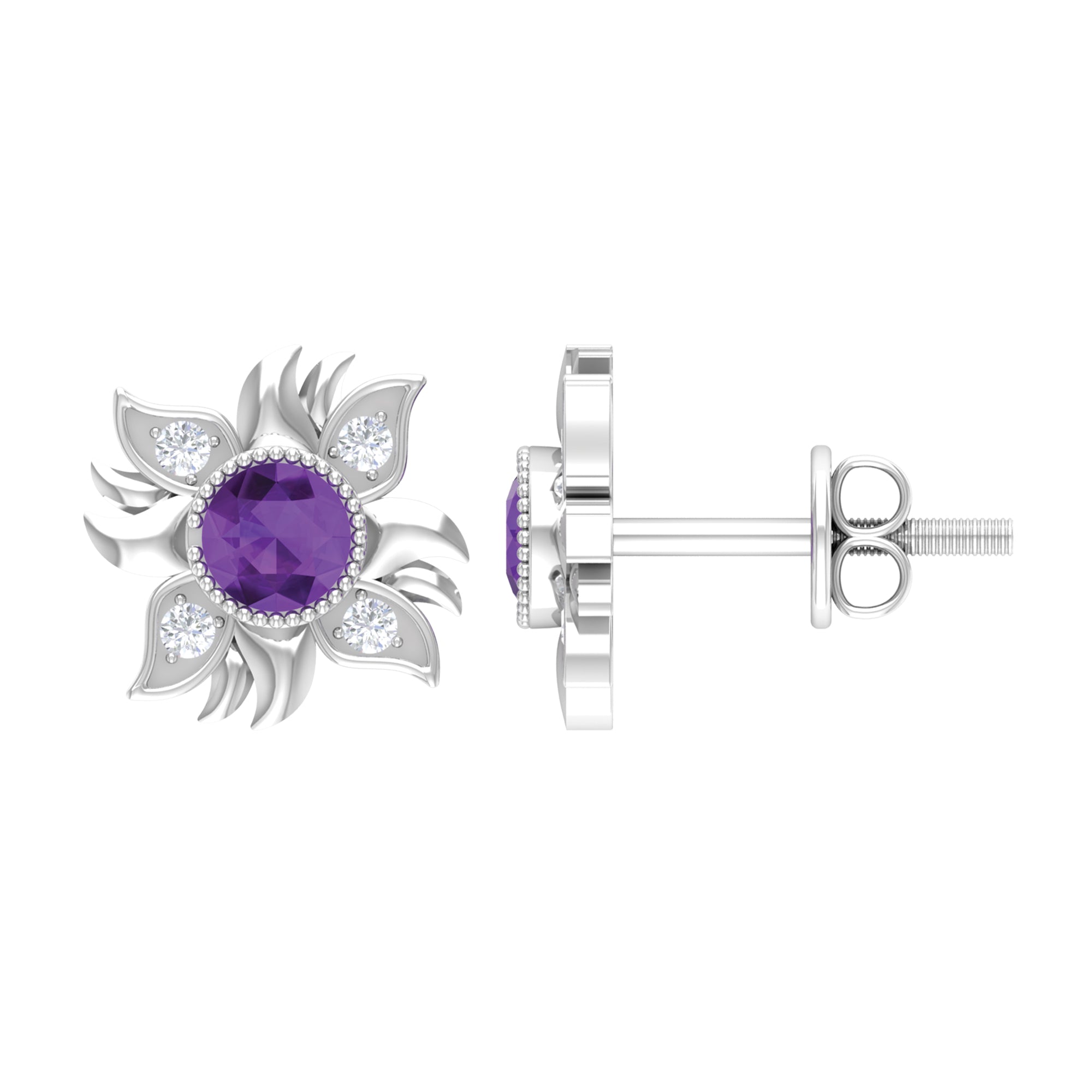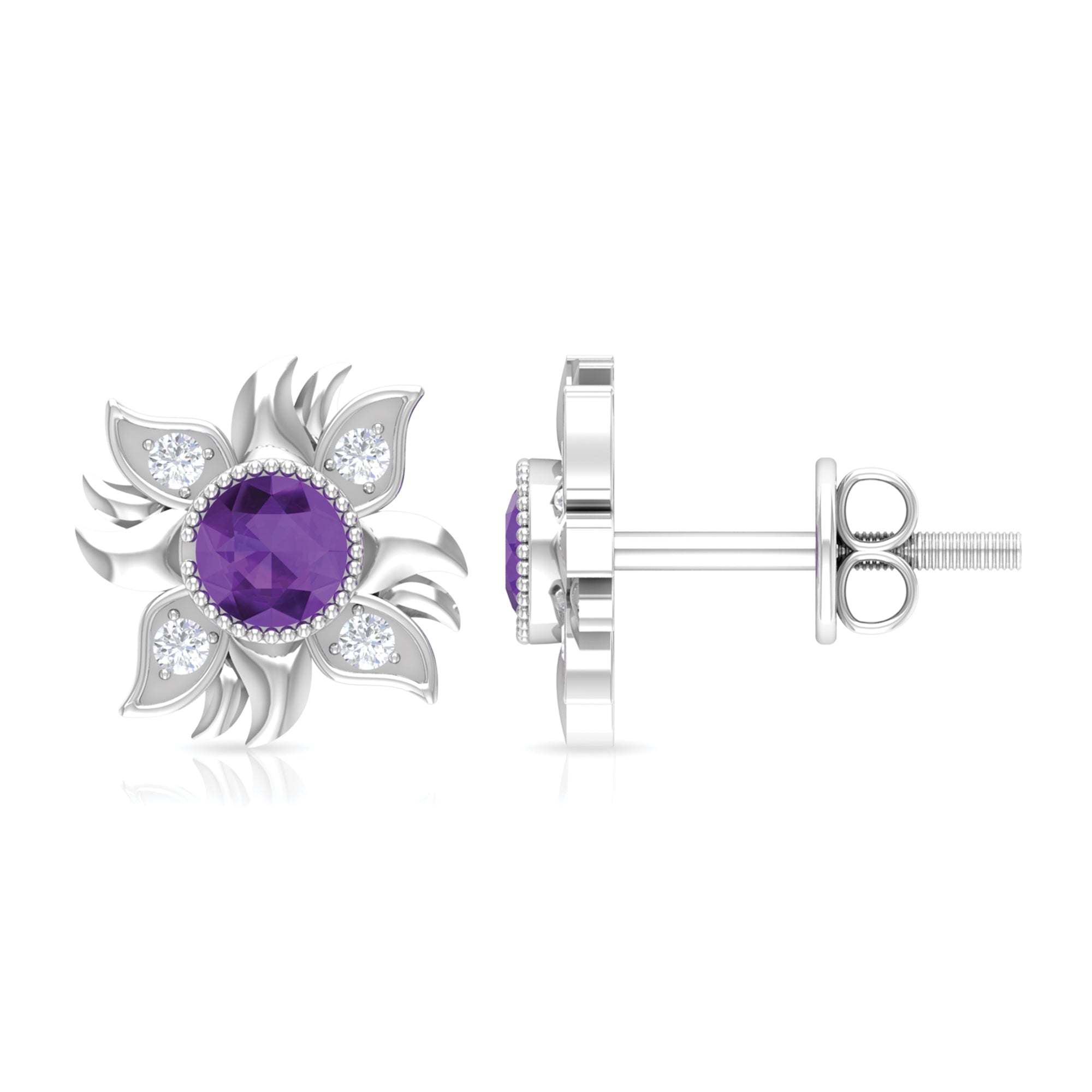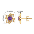 1/2 CT Round Shape Amethyst and Diamond Sunburst Stud Earrings