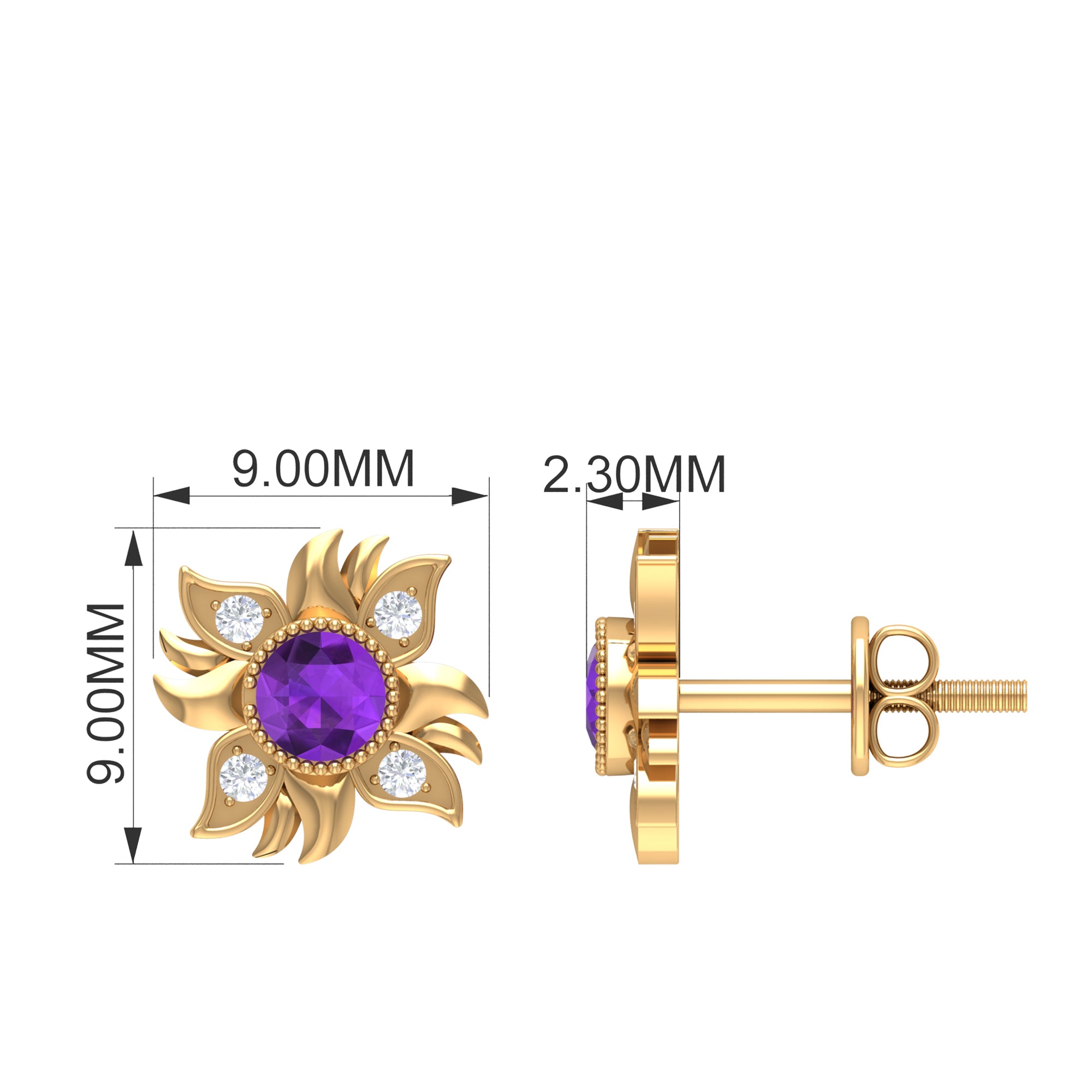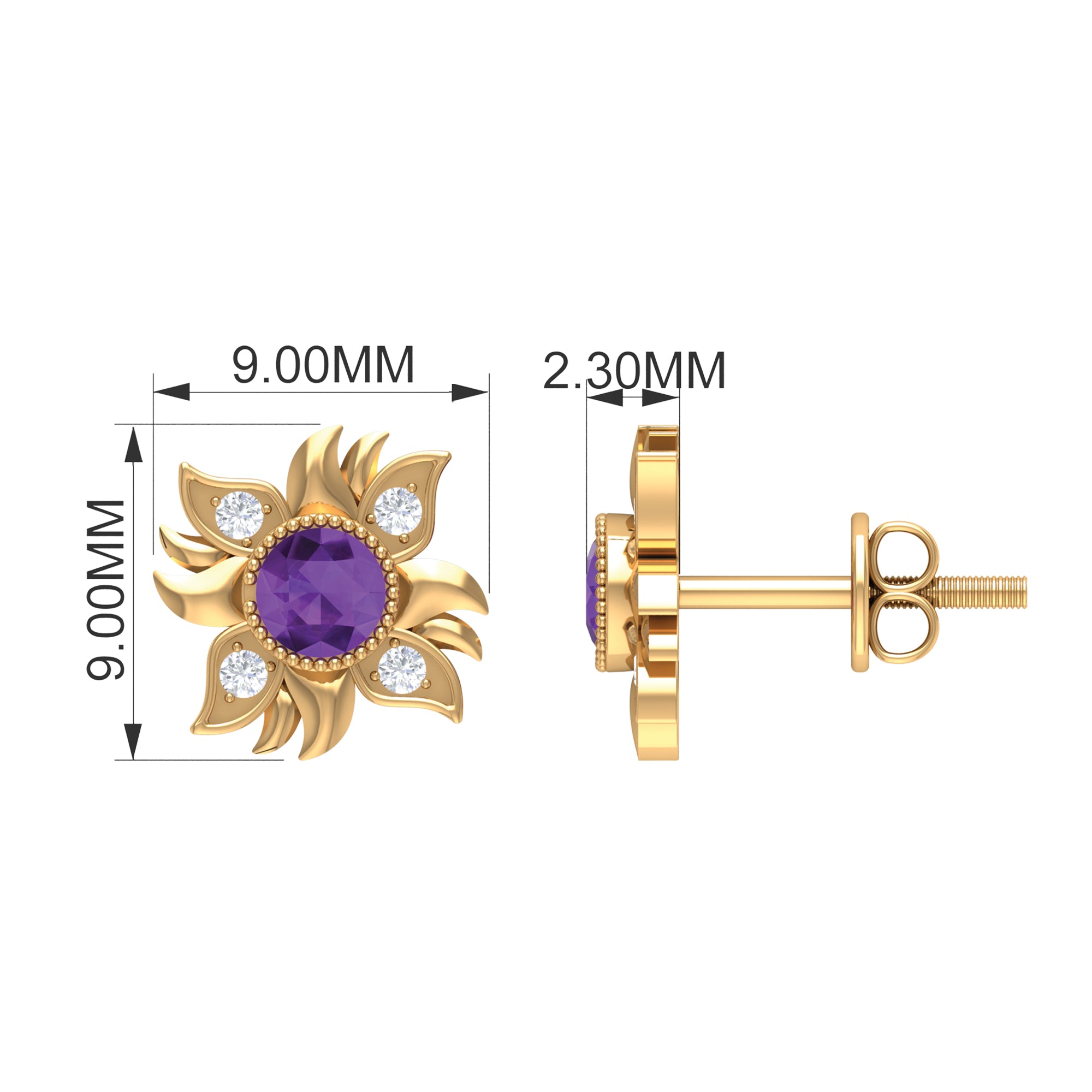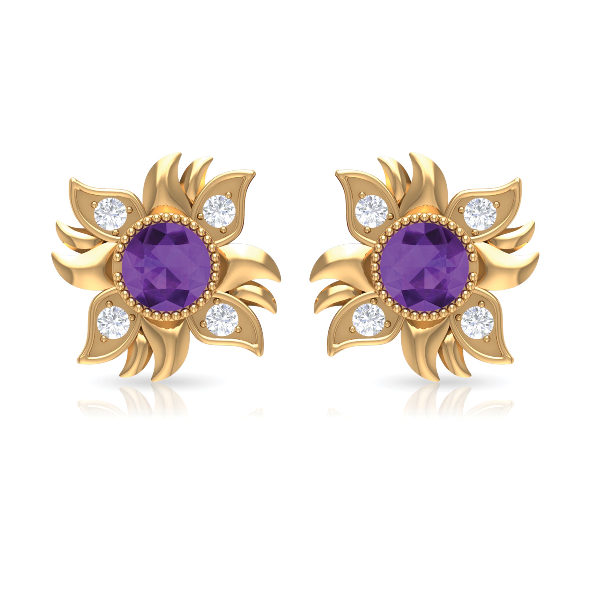 This Sunburst Stud Earrings is embellished with Round Shape Amethyst is set at the center in a Bezel Setting and round shape Diamond are set as floral pattern, crafted in a Solid Gold.