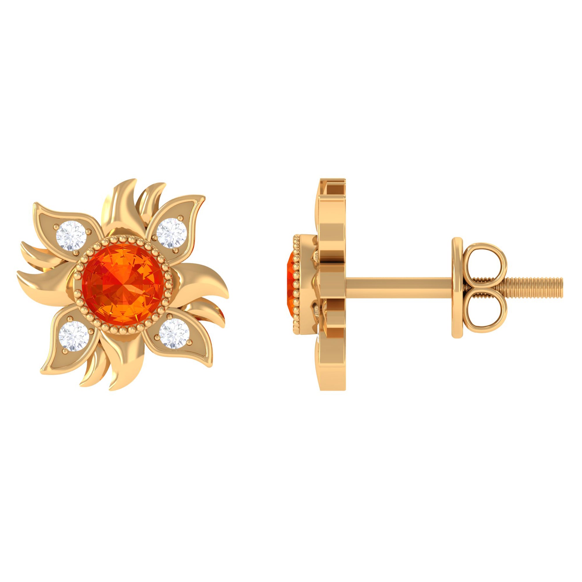 1/2 CT Round Shape Orange Sapphire and Diamond Sunburst Stud Earrings