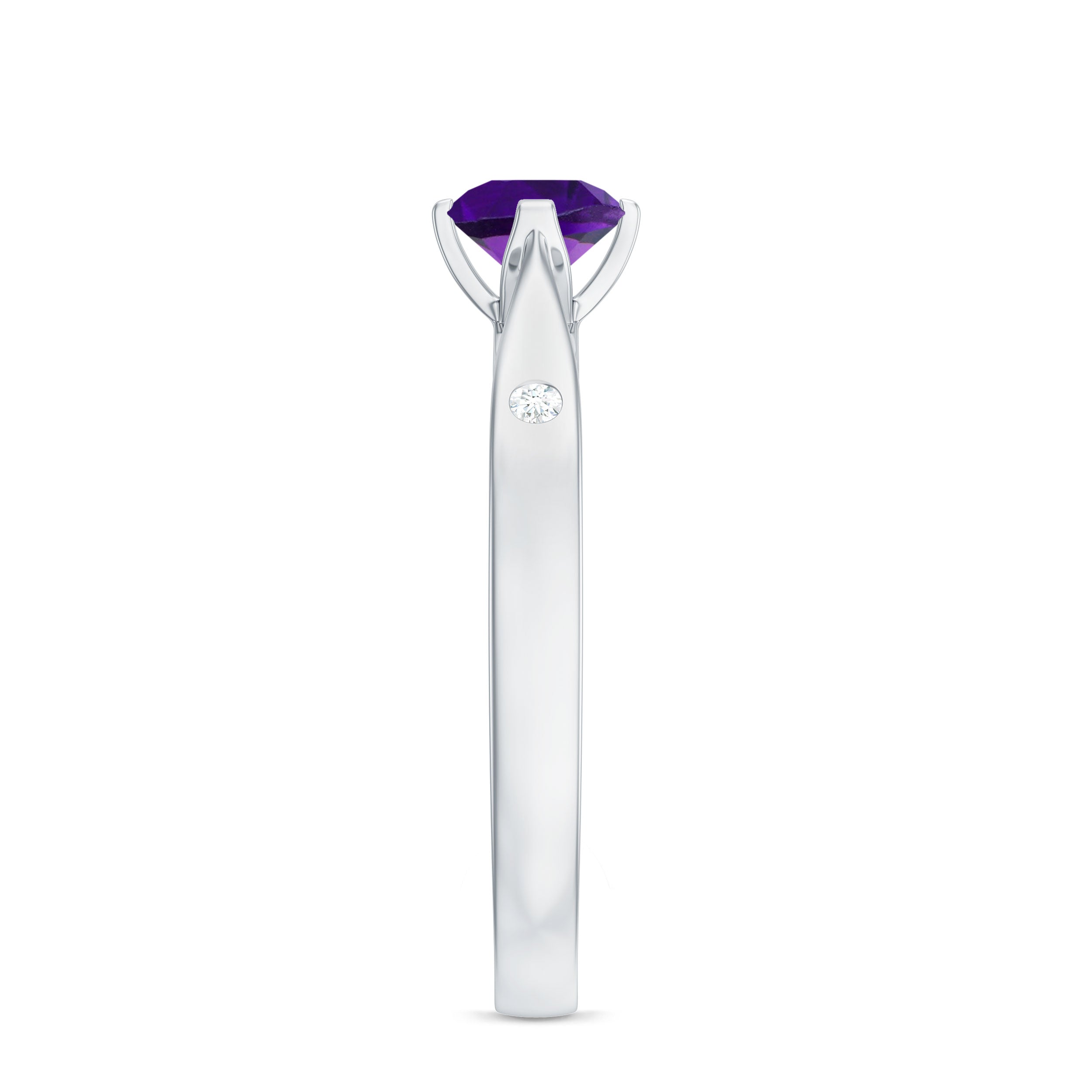 This Solitaire Ring is beautifully set with 5 MM Round Shaped Amethyst as Solitaire in Prong Setting. It also has two 1.5 MM Round Diamond in a unique Side Style in Flush Setting gives an attractive look to this Ring.