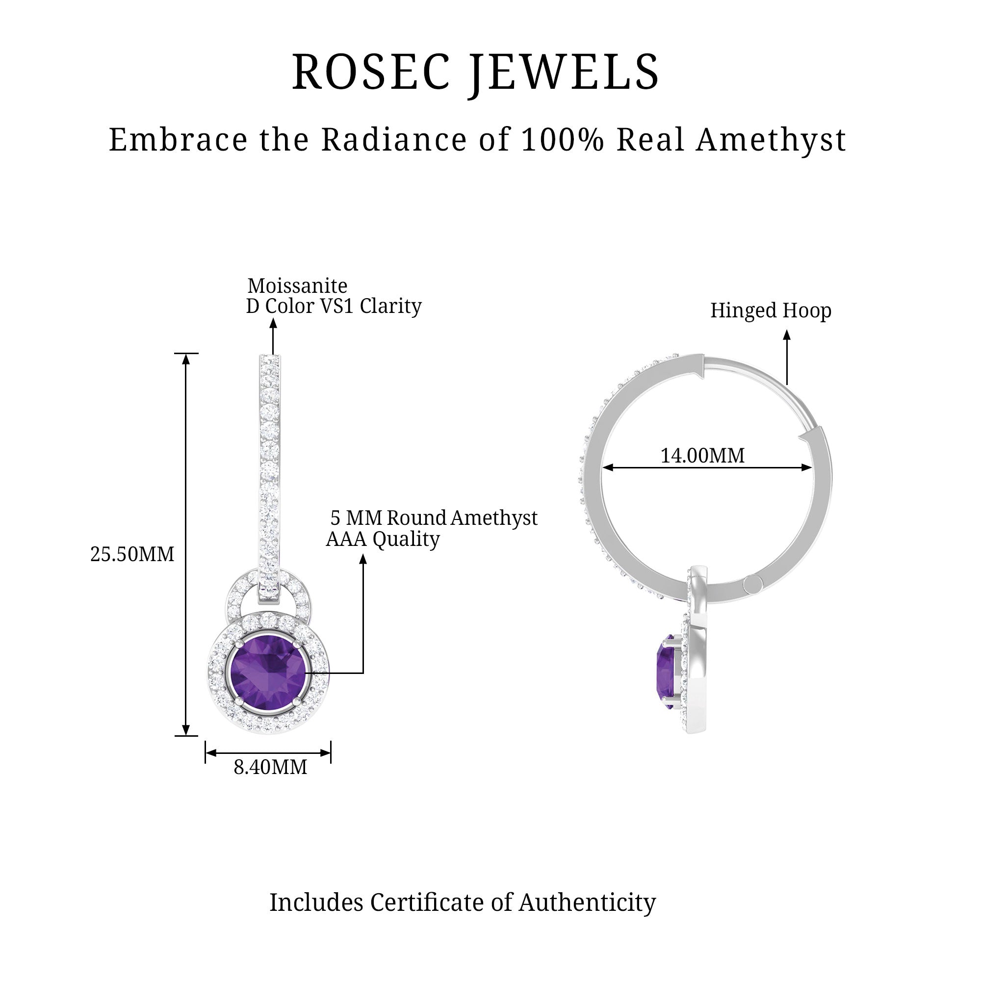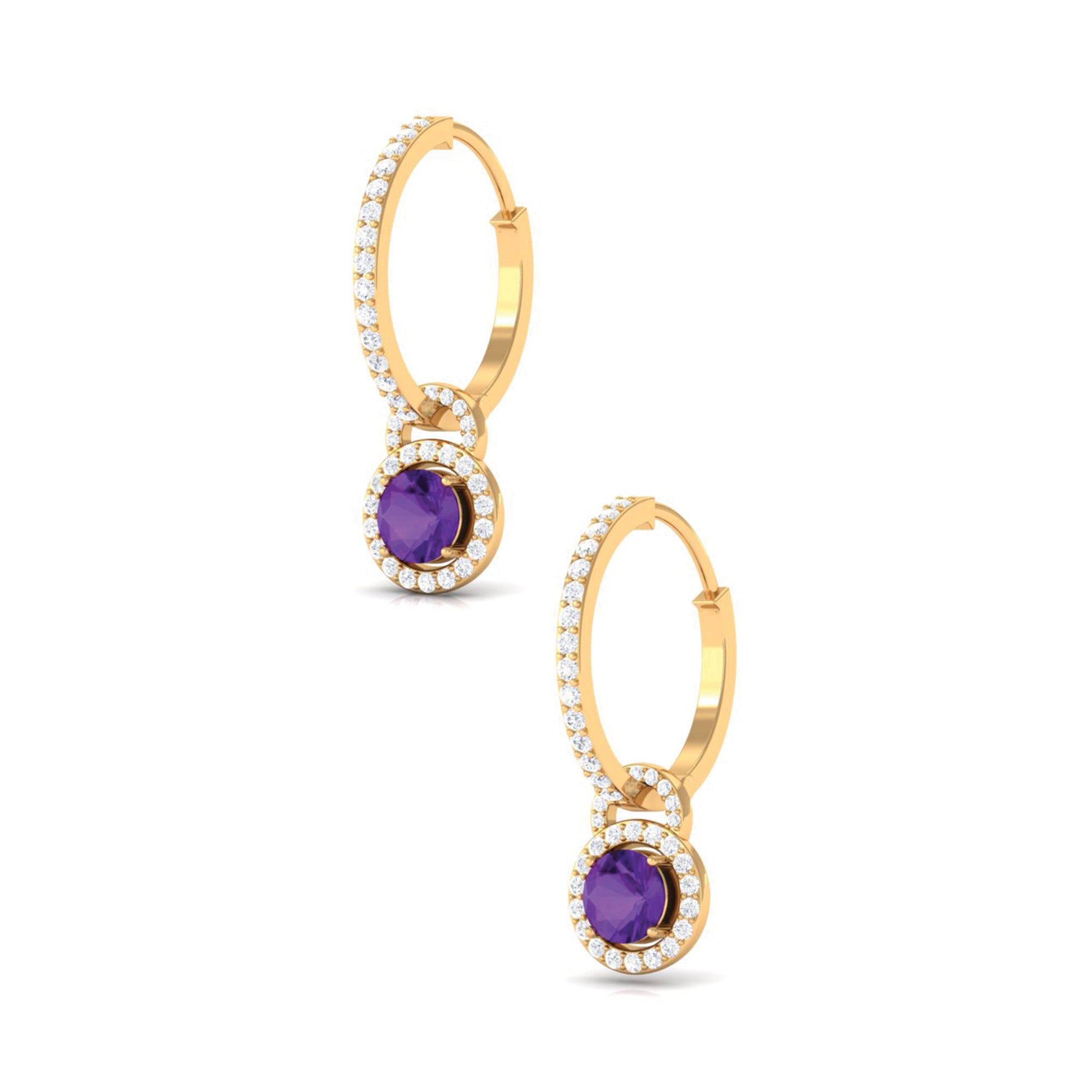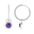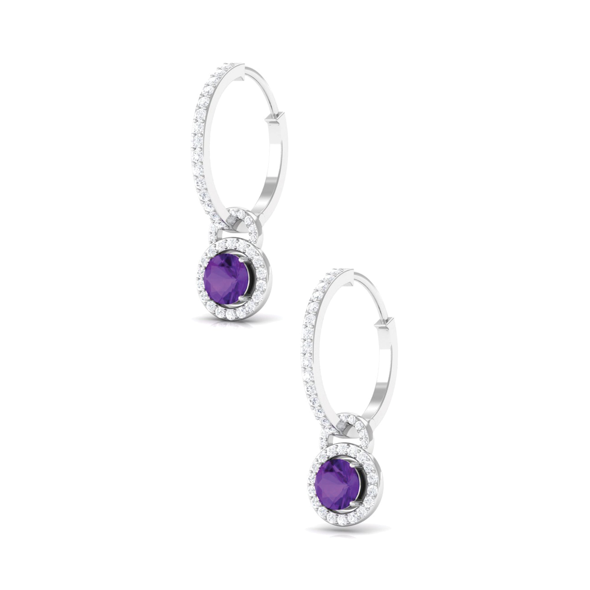 They are known as Hoop Drop Earrings adorned with round shape Amethyst adorned in Prong Setting with Round Brilliant Moissanite embellished in Pave Setting. It makes an ideal Wedding earring for Women.