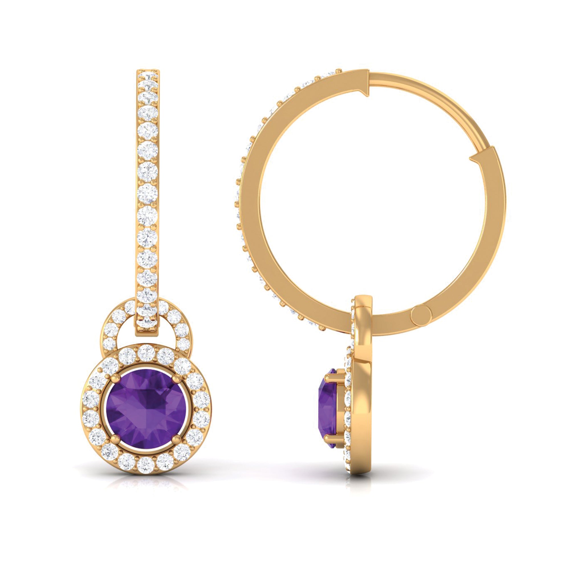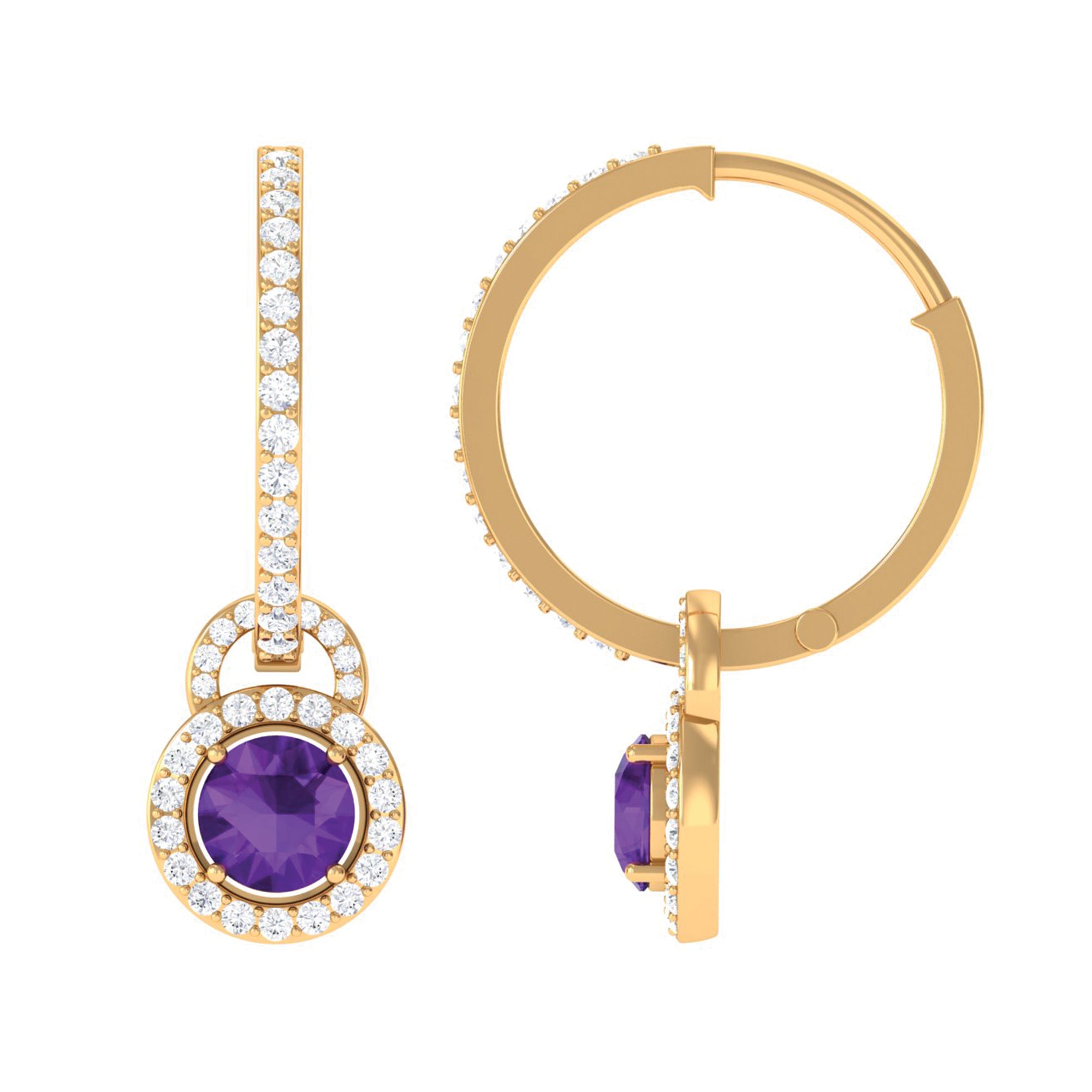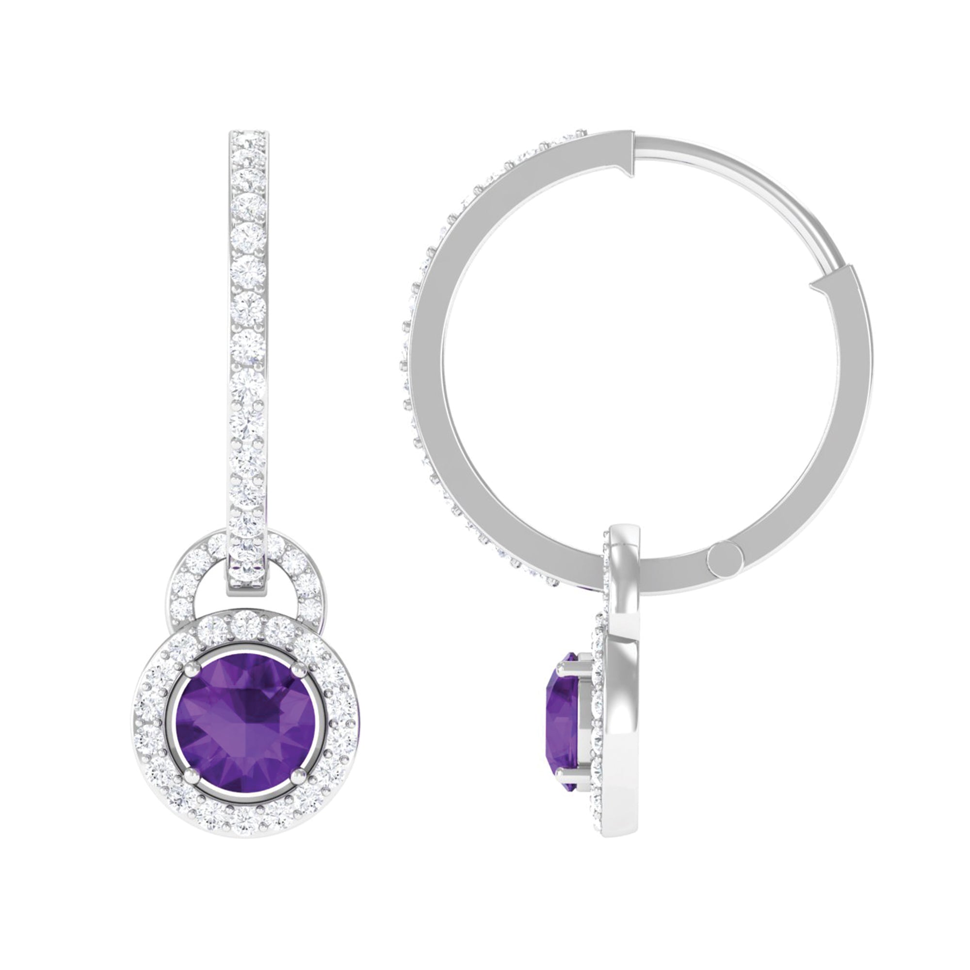They are known as Hoop Drop Earrings adorned with round shape Amethyst adorned in Prong Setting with Round Brilliant Moissanite embellished in Pave Setting. It makes an ideal Wedding earring for Women.