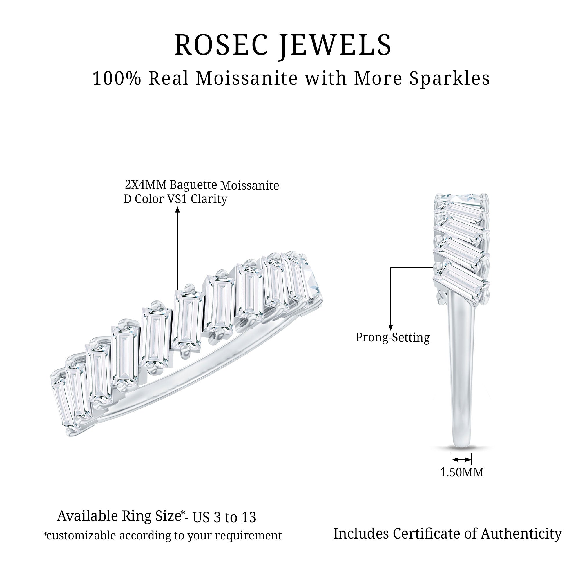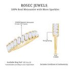 This Baguette Wedding Band symbolizes a lasting promise to your beloved. It features 2X4 MM baguette cut moissanites securely held in 2-prong setting and set in a slightly tilted style. The band showcases a half-eternity design that embodies a timeless and sophisticated style. This Eternity Wedding Band sparkles with the exceptional brilliance of D-VS1 quality moissanites, making it a perfect choice for the special occasion. The Moissanite Anniversary Ring flows gracefully, representing everlasting love beautifully. Designed for your memorable moments, it will come in a classic jewelry box for safe keeping. Rosec Jewels offers a variety of metal colors and purity options to select from. With its classic yet striking design, this Moissanite Eternity Ring is ideal as a wedding band or anniversary ring, marking the beginning of a new journey. It blends elegance with a contemporary touch, making it perfect for those who desire a touch of luxury.