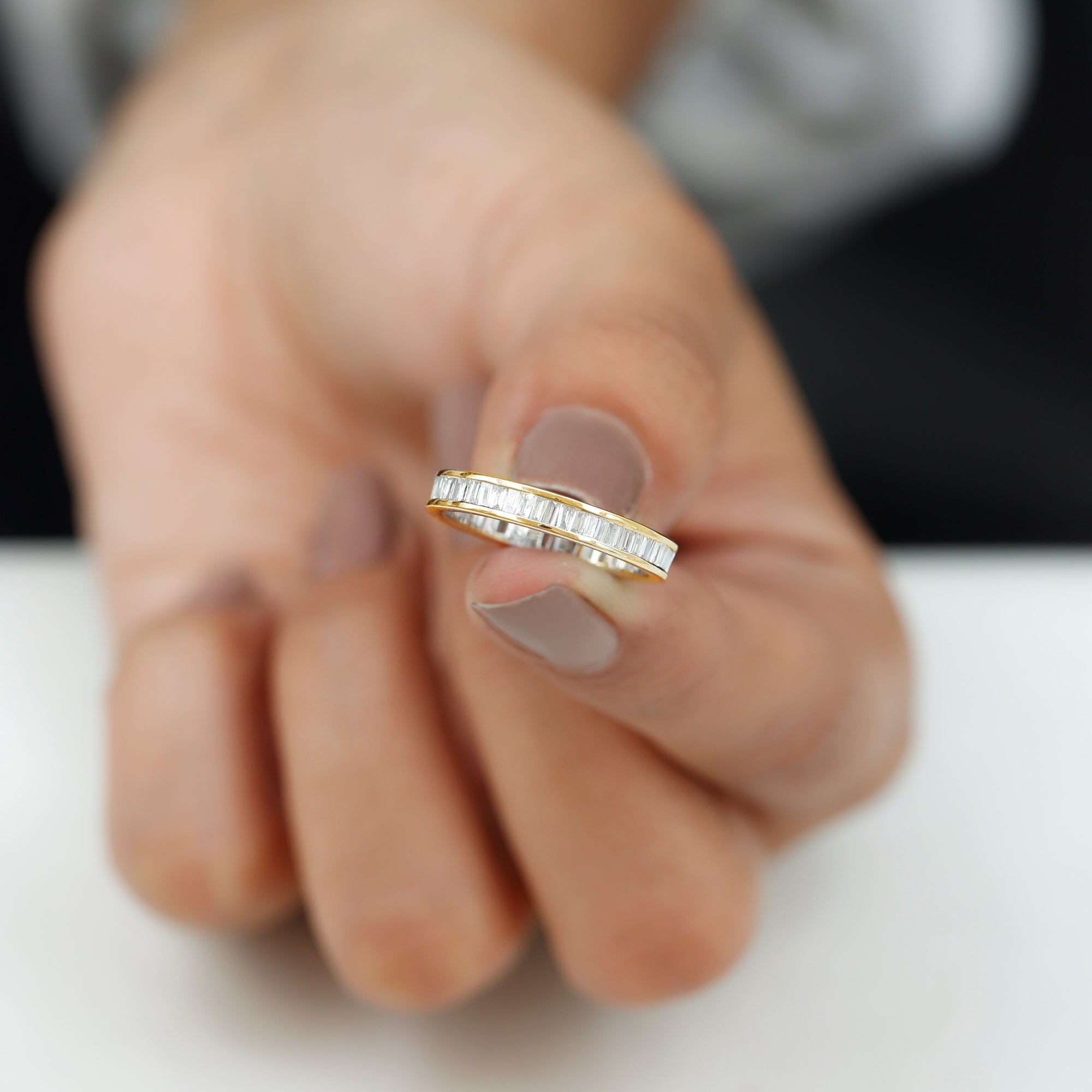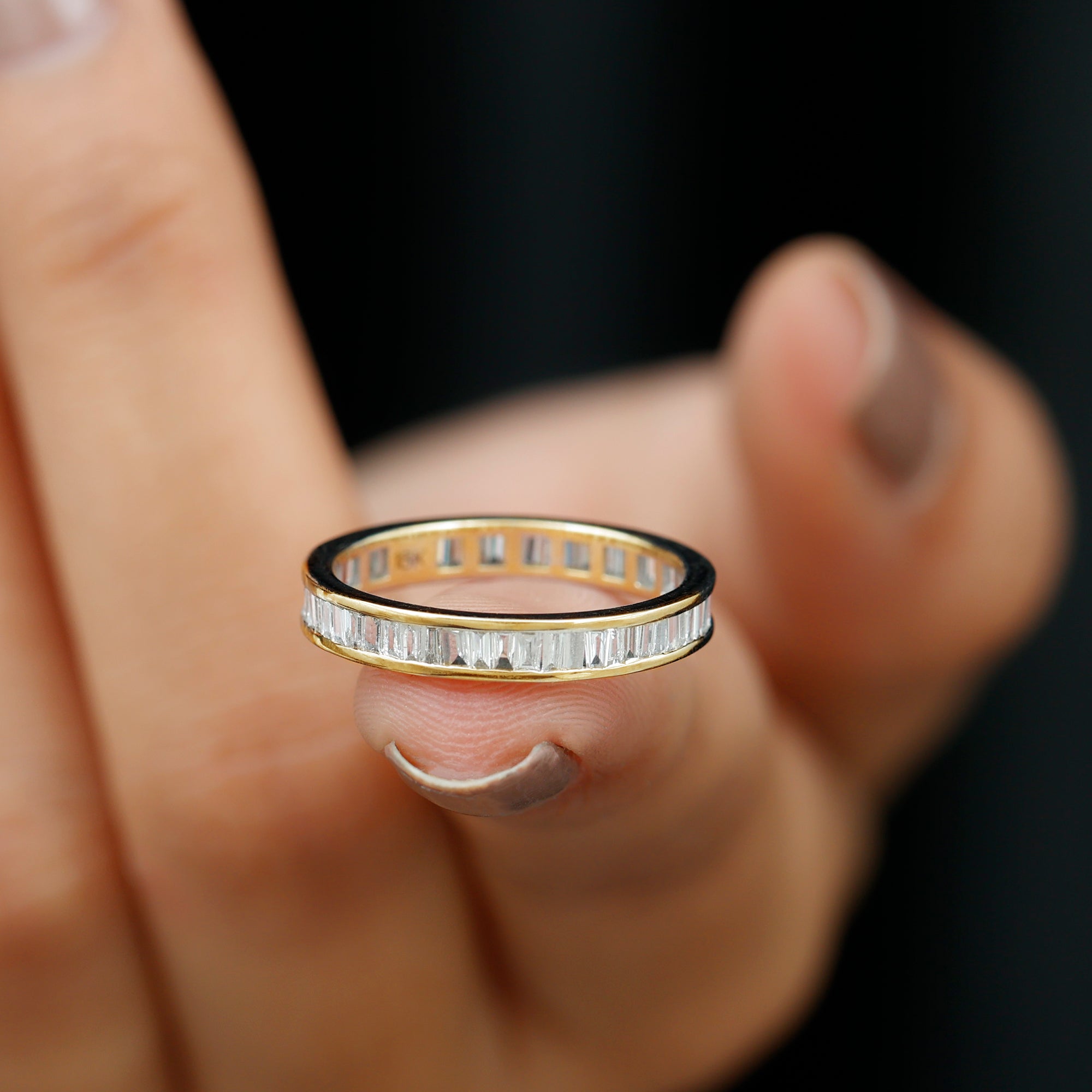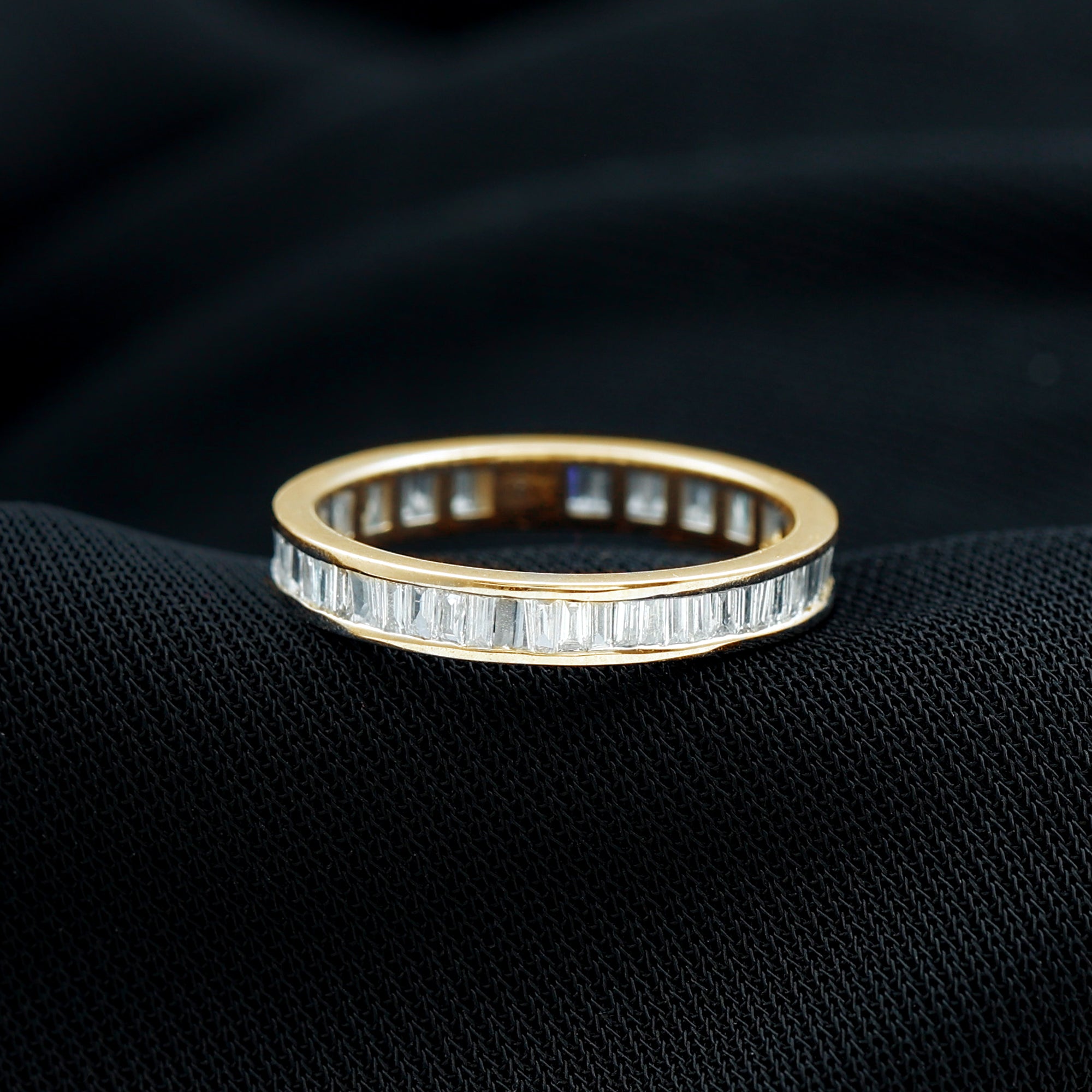 Impress your lady with this distinctive Diamond Eternity Ring, featuring Baguette Cut Diamonds set in channel setting to give this eternity band ring a captivating look. This Diamond Band Ring is a glistening piece of fine jewelry crafted in gold. Get this classic Gold Eternity Ring for your lady and win her heart.