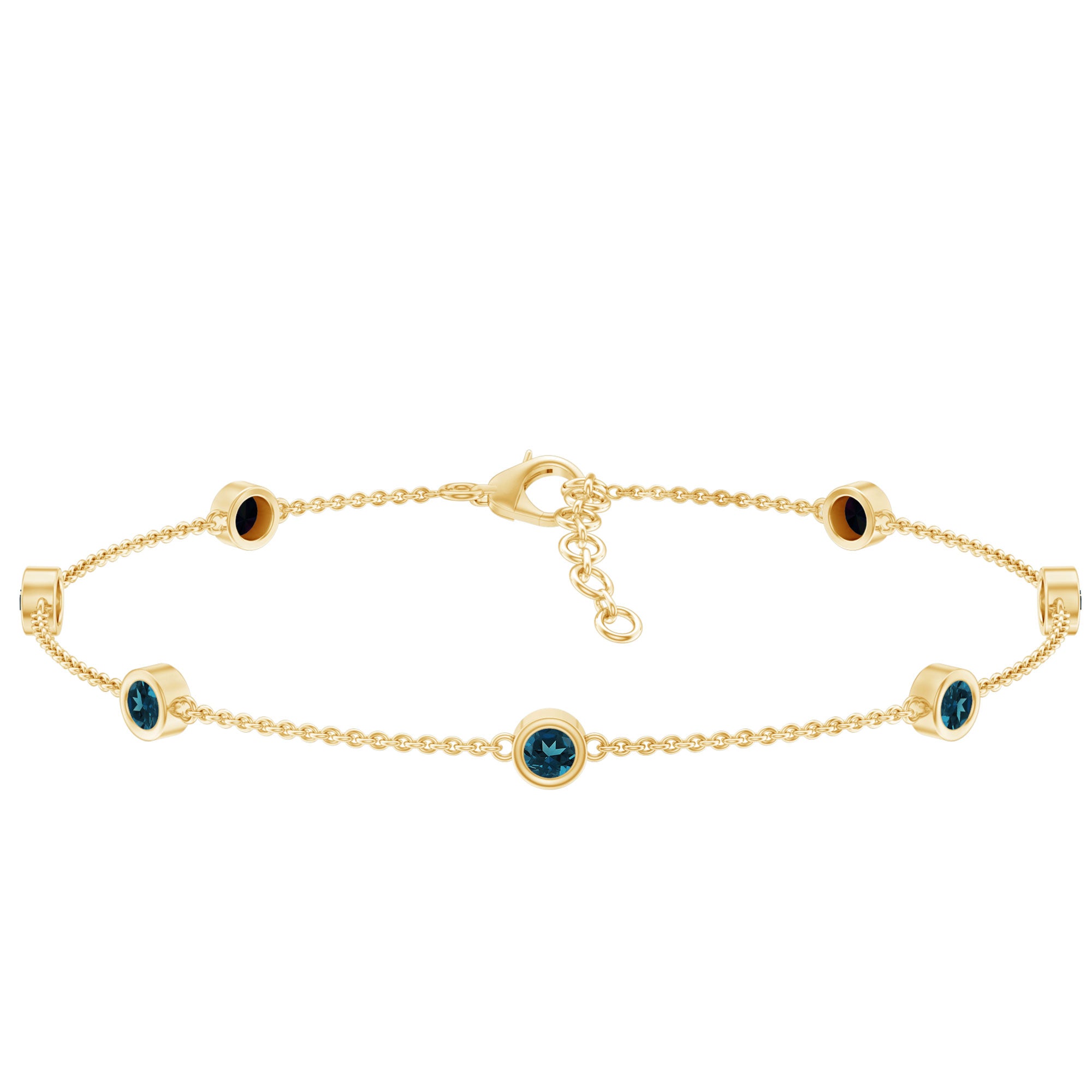 Express your love and make her happy by giving her this glossy London Blue Topaz Bracelet this Valentine. This Gold Chain Bracelet will magnify the beauty of your wrist and make your wrist glossy. This Eternity Bracelet is perfectly composed of Solid Gold and decorated with Round Cut London Blue Topaz in a Bezel Setting over Station Chain.