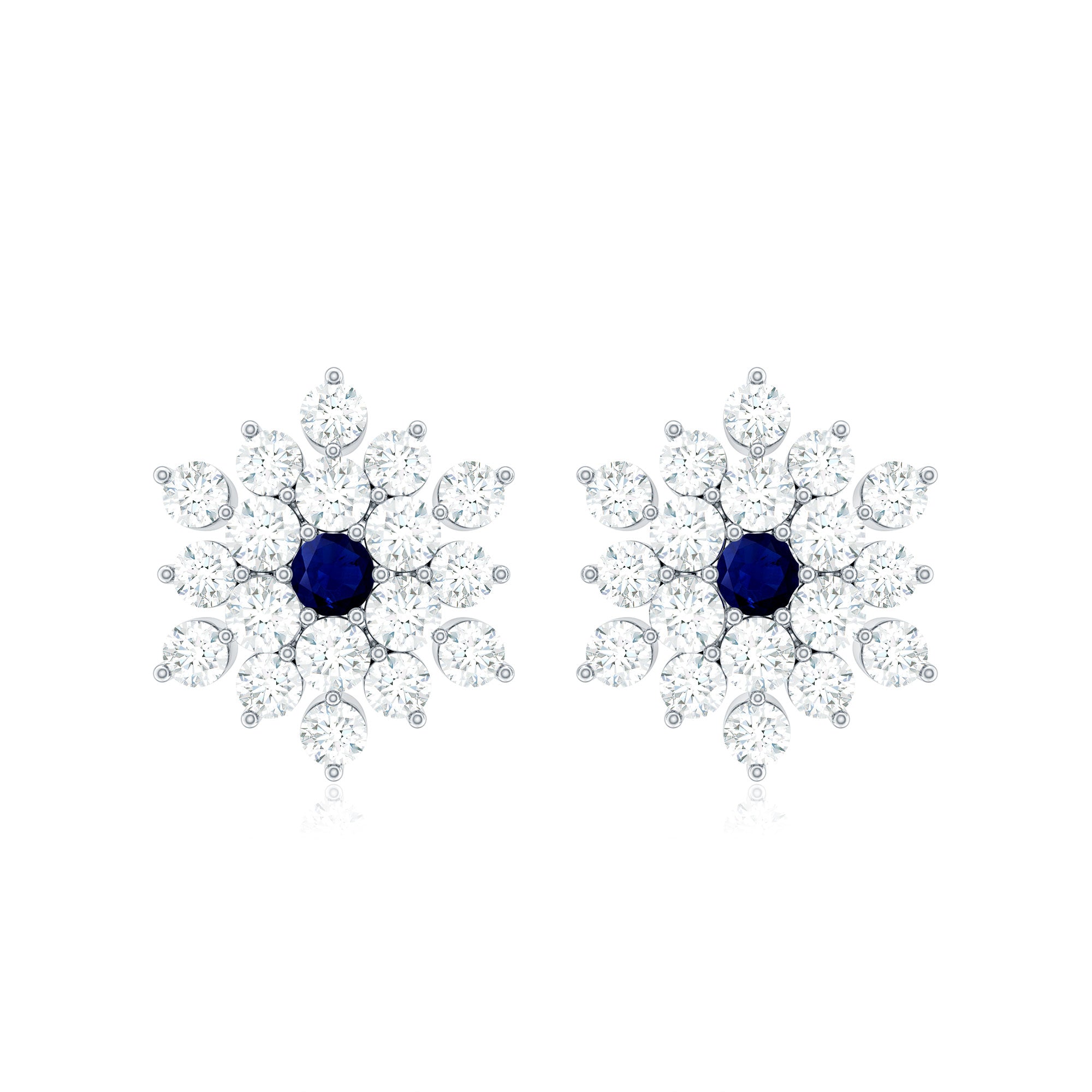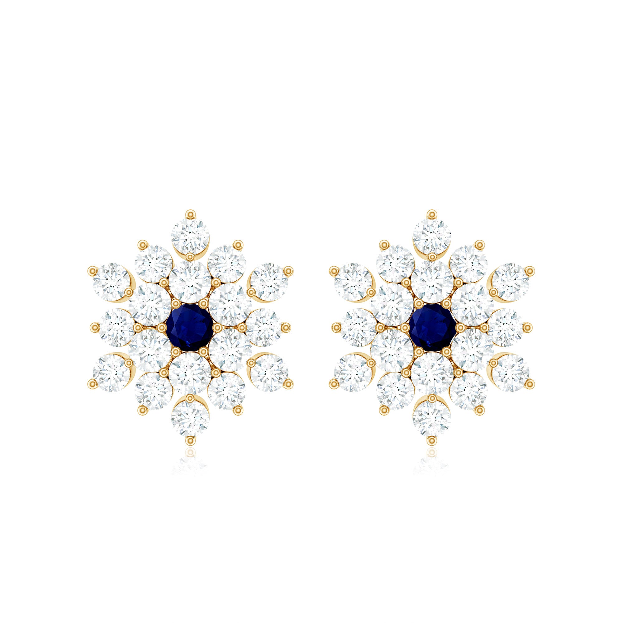 These Classic Stud Earrings are for Women to look elegant and classy. Set in Solid Gold and embellished in Prong Setting, these Snowflake Earrings consist of Round Shape Blue Sapphire and Round Brilliant Cut Diamonds, for you to shine bright and look beautiful as ever.
