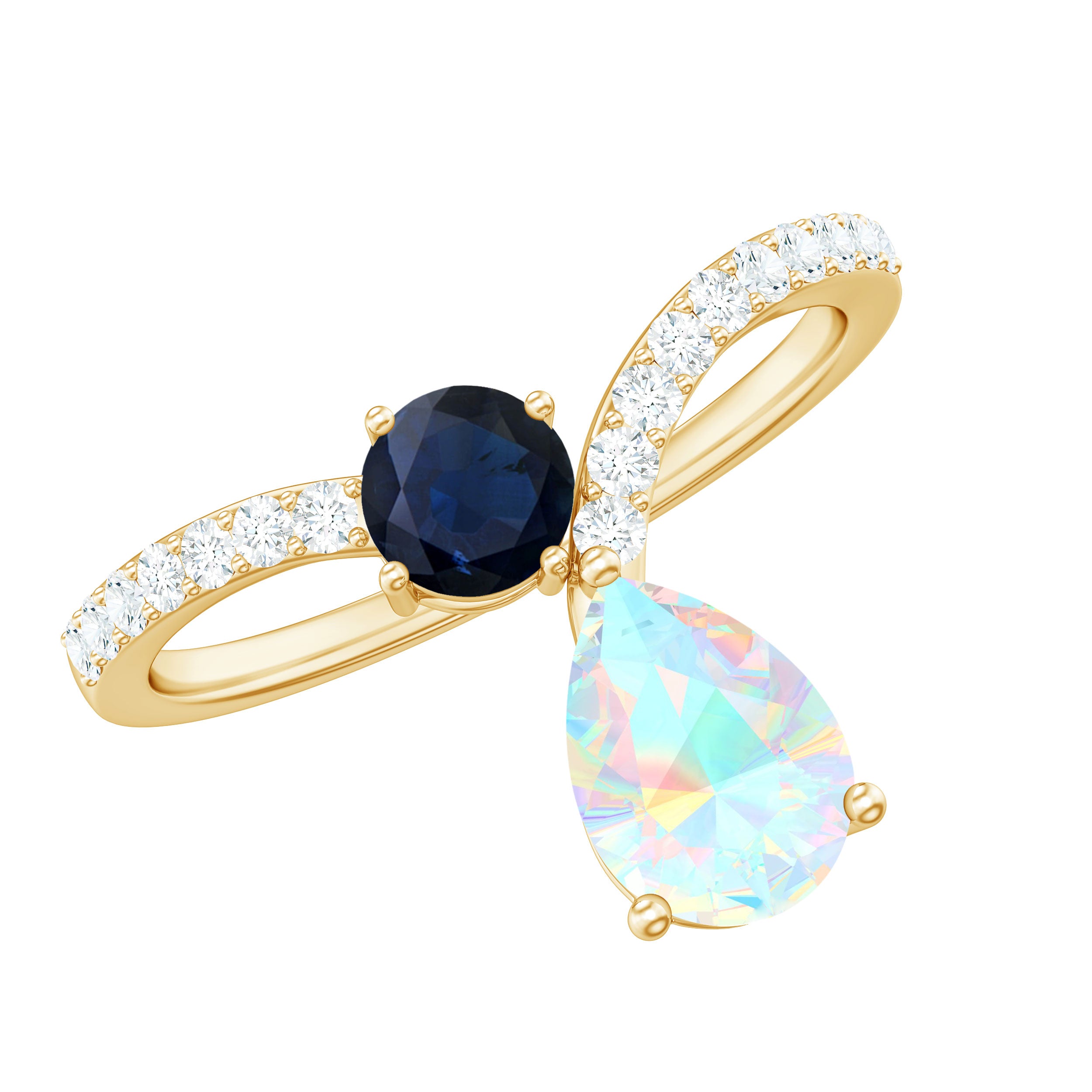 Make your good day even better with this stunning Ethiopian Opal and Blue Sapphire Ring. Surprise your beloved with this remarkable Sapphire and Opal Ring, which boasts a brilliant combination of round shape blue sapphire and pear cut Ethiopian opal, both carefully set in prong setting. The ring itself is crafted from solid gold, adding a touch of elegance and sophistication to the overall design. With its sparkling moissanite stones and captivating gemstones, this ring is sure to be a cherished keepsake for your blooming lady love.