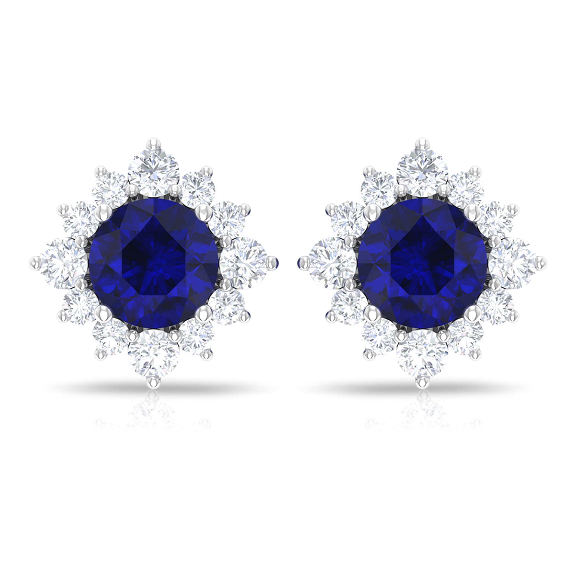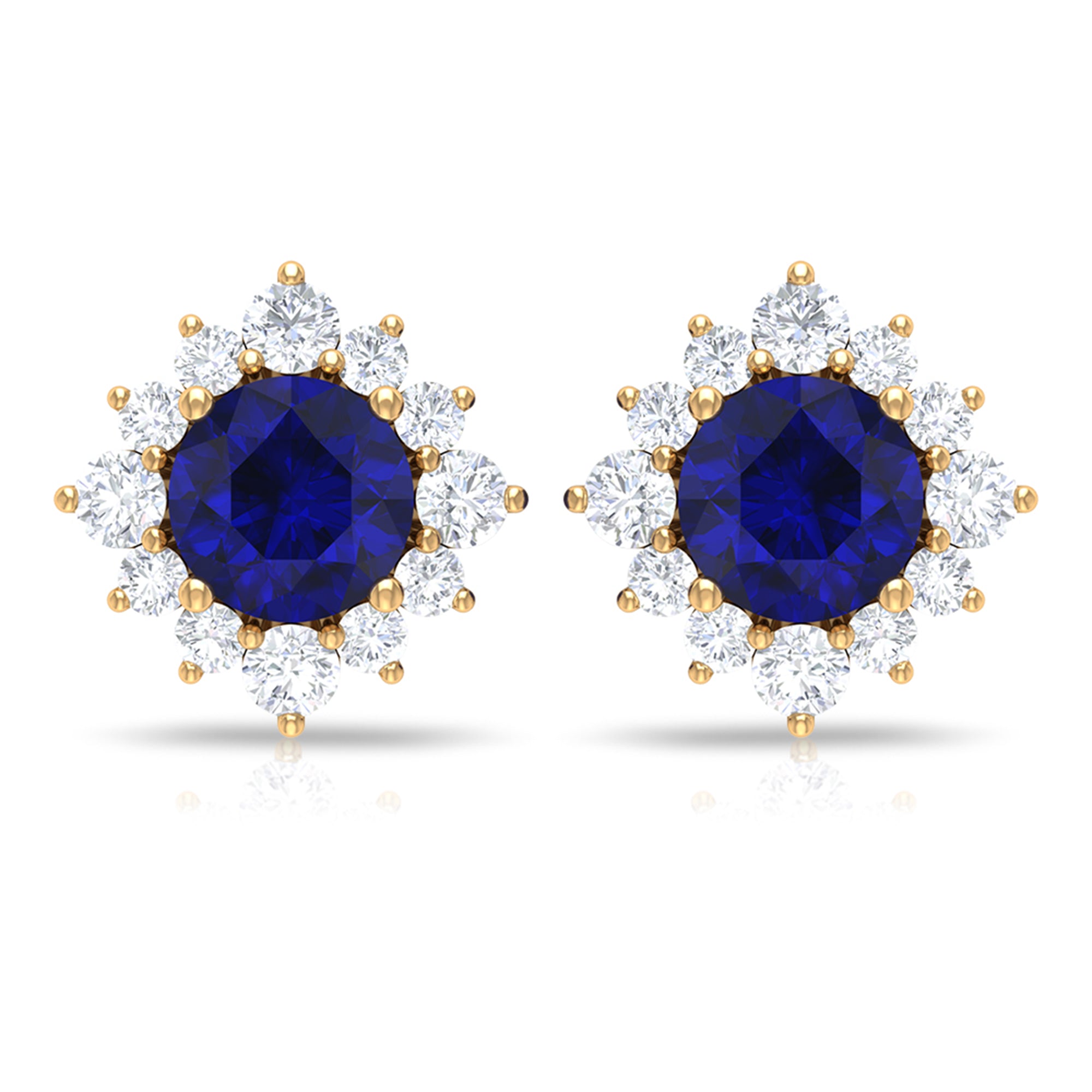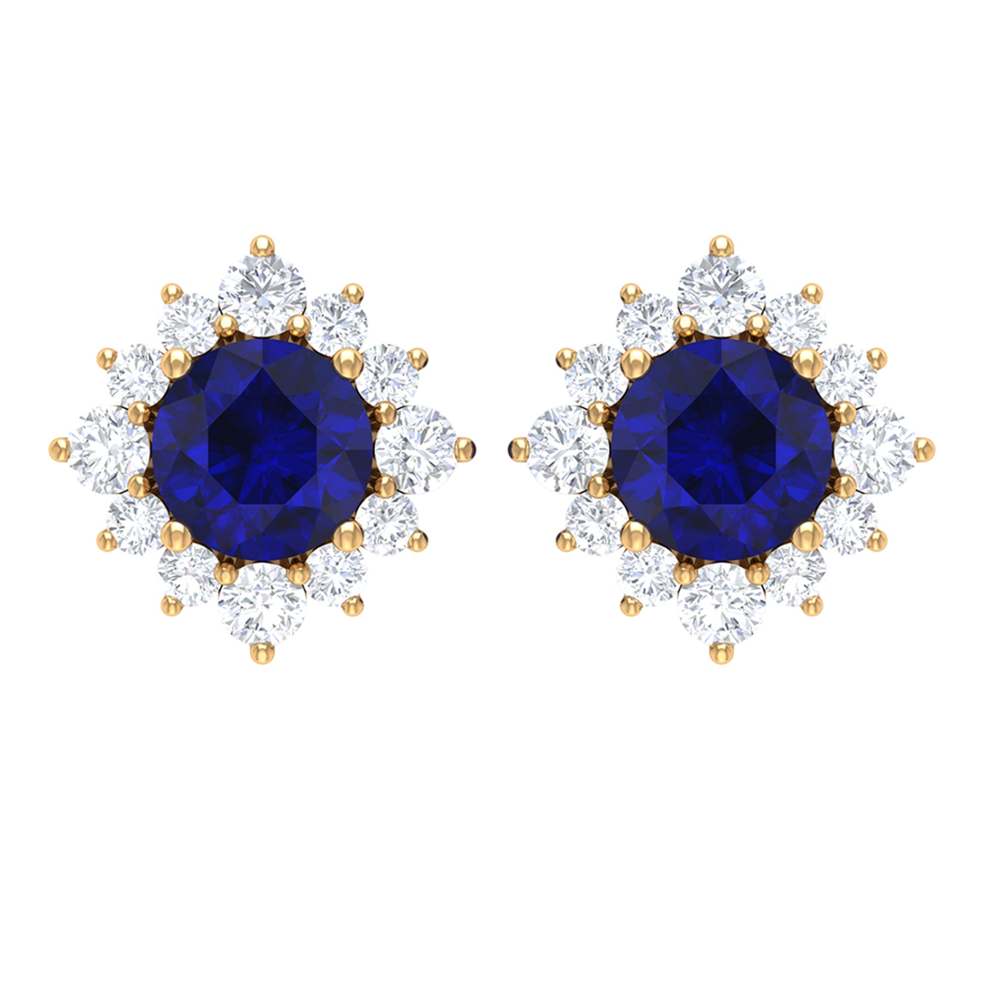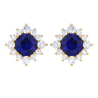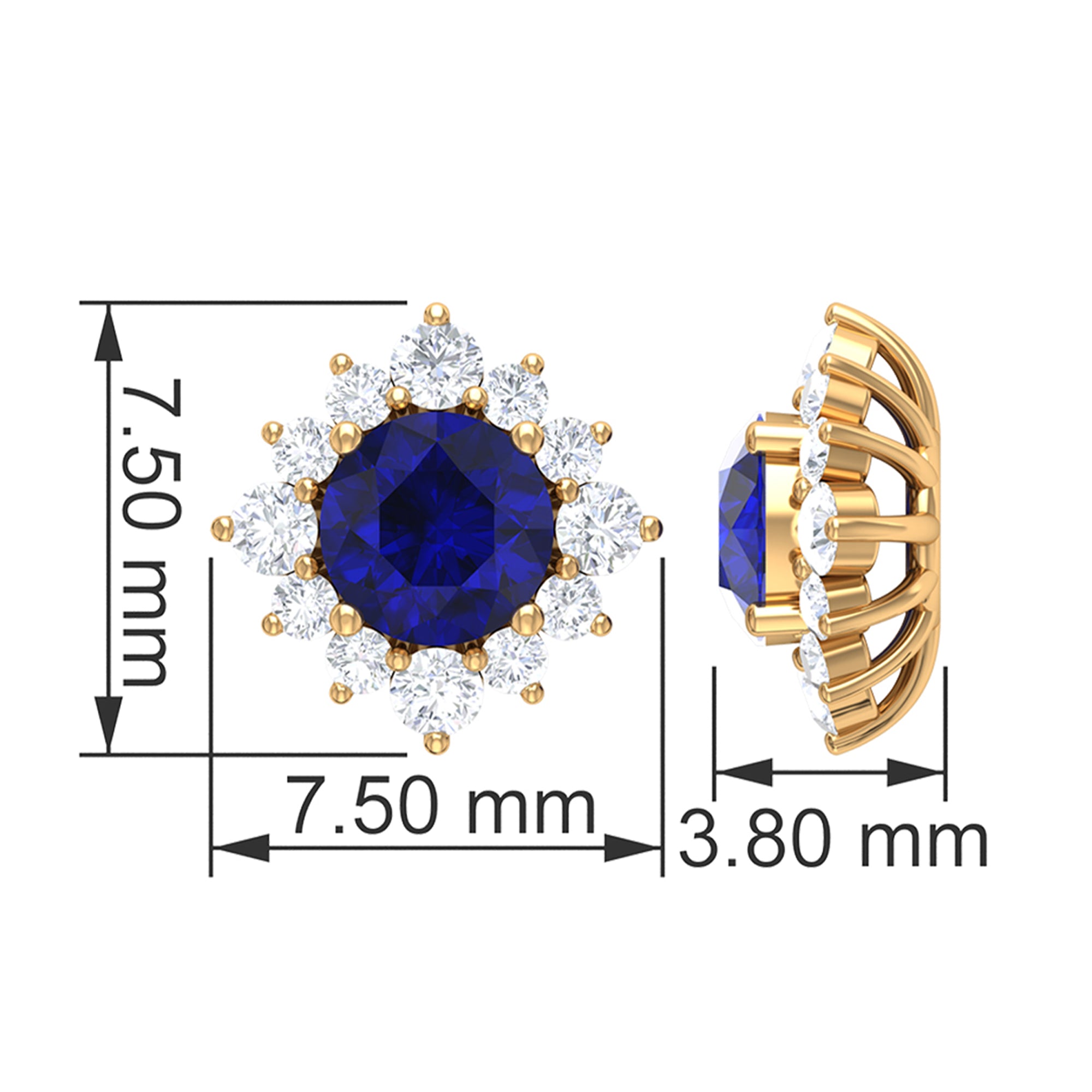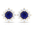 Make a statement with our Classic Stud Earrings featuring Round Shape Blue Sapphire Solitaire and Diamond Halo adorned in 14K Solid Gold.